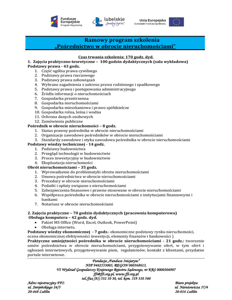 Ramowy program szkolenia „Pośrednictwo w obrocie nieruchomościami” Czas trwania szkolenia: 170 godz. dyd. 1. Zajęcia praktyczno-teoretyczne – 100 godzin dydaktycznych (sala wykładowa) Podstawy prawa - 43 godz. 1. Część ogólna prawa cywilnego 2. Podstawy prawa rzeczowego 3. Podstawy prawa zobowiązań 4. Wybrane zagadnienia z zakresu prawa rodzinnego i spadkowego 5. Podstawy prawa i postępowania administracyjnego 6. Źródła informacji o nieruchomościach 7. Gospodarka przestrzenna 8. Gospodarka nieruchomościami 9. Gospodarka mieszkaniowa i prawo spółdzielcze 10. Gospodarka rolna, leśna i wodna 11. Ochrona danych osobowych 12. Zamówienia publiczne Pośrednik w obrocie nieruchomości – 8 godz. 1. Status prawny pośrednika w obrocie nieruchomościami 2. Organizacje zawodowe pośredników w obrocie nieruchomościami 3. Standardy zawodowe i etyka zawodowa pośrednika w obrocie nieruchomościami Podstawy wiedzy technicznej - 14 godz. 1. Podstawy budownictwa 2. Przegląd technologii w budownictwie 3. Proces inwestycyjny w budownictwie 4. Eksploatacja nieruchomości Obrót nieruchomościami – 35 godz. 1. Wprowadzenie do problematyki obrotu nieruchomościami 2. Umowa pośrednictwa w obrocie nieruchomościami 3. Procedury w obrocie nieruchomościami 4. Podatki i opłaty związane z nieruchomościami 5. Zabezpieczenia finansowe i prawne stosowane w obrocie nieruchomościami 6. Współpraca pośrednika w obrocie nieruchomościami z instytucjami finansowymi i bankami 7. Notariusz w obrocie nieruchomościami 2. Zajęcia praktyczne – 70 godzin dydaktycznych (pracownia komputerowa) Obsługa komputera – 42 godz. dyd. Pakiet MS Office (Word, Excel, Outlook, PowerPoint) Obsługa internetu. Podstawy wiedzy ekonomicznej - 7 godz.: ekonomiczne podstawy rynku nieruchomości, ocena ekonomicznej efektywności inwestycji, elementy finansów i bankowości ) Praktyczne umiejętności pośrednika w obrocie nieruchomościami - 21 godz.: tworzenie umów pośrednictwa w obrocie nieruchomościami, przygotowywanie ofert, w tym ofert i ogłoszeń internetowych, przygotowywanie pism, regulaminów, kontakt z klientami, przydatne portale internetowe. Fundacja „Fundusz Inicjatyw” NIP 9462553005, REGON 060368615, VI Wydział Gospodarczy Krajowego Rejestru Sądowego, nr KRS 0000306907 [email protected], www.ffi.org.pl tel./fax (81) 532 10 30, tel. kom. 519 310 560 Adres rejestracyjny FFI: Biuro projektu: ul. Sierpińskiego 24/5 ul. Narutowicza 57/4 20-448 Lublin 20-016 Lublin