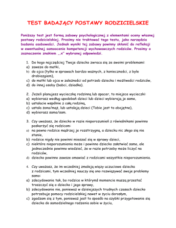 TEST BADAJĄCY POSTAWY RODZICIELSKIE Poniższy test jest formą zabawy psychologicznej z elementami oceny własnej postawy rodzicielskiej. Prosimy nie traktować tego testu, jako narzędzia badania osobowości. Jednak wyniki tej zabawy powinny skłonić do refleksji w ewentualnej samoocenie kompetencji wychowawczych rodziców. Prosimy o zaznaczenie znakiem ,,x’’ wybranej odpowiedzi. 1. Do kogo najczęściej Twoje dziecko zwraca się ze swoimi problemami: a) zawsze do matki, b) do ojca (tylko w sprawach bardzo ważnych, z konieczności, z byle drobiazgiem), c) do matki lub ojca w zależności od potrzeb dziecka i możliwości rodziców, d) do innej osoby (babci, dziadka). 2. a) b) c) d) Jeżeli planujesz wycieczkę rodzinną lub spacer, to miejsce wycieczki: wybierasz według upodobań dzieci lub dzieci wybierają je same, ustalacie wspólnie z całą rodziną, ustala żona/mąż, lub ustalają dzieci (Tobie jest to obojętne), wybierasz sama/sam. 3. Czy uważasz, że dziecko w razie nieporozumień z rówieśnikami powinno poskarżyć się rodzicom: a) na pewno rodzice mądrzej je rozstrzygną, a dziecku nic złego się nie stanie, b) rodzice nigdy nie powinni mieszać się w sprawy dzieci, c) niektóre nieporozumienia może i powinno dziecko załatwiać samo, ale jednocześnie powinno wiedzieć, że w razie potrzeby może liczyć na rodziców, d) dziecko powinno zawsze omawiać z rodzicami wszystkie nieporozumienia. 4. Czy uważasz, że im wcześniej zmaleją więzy uczuciowe dziecka z rodzicami, tym wcześniej nauczy się ono rozwiązywać swoje problemy samo: a) zdecydowanie tak, bo rodzice w którymś momencie muszą przestać troszczyć się o dziecko i jego sprawy, b) zdecydowanie nie, ponieważ w dzisiejszych trudnych czasach dziecko potrzebuje pomocy rodzicielskiej nawet w życiu dorosłym, c) zgadzam się z tym, ponieważ jest to sposób na szybki przygotowanie się dziecka do samodzielnego radzenia sobie w życiu, d) więzy powinny trwać całe życie, a ich zminimalizowanie nie jest warunkiem samodzielności. 5. a) b) c) d) W czasie spożywania posiłku dziecko nie zjada swojej porcji. Co robisz: proponujesz mu inną potrawę, bo ta może mu nie smakować, zabierasz talerz, niech chodzi głodne, jak zgłodnieje, to zje wszystko, zmuszasz słownie, jak nie zje, to nie pójdzie na podwórko itp., pozwalasz chwilę odpocząć, później zachęcasz słownie i dopiero wtedy zabierasz talerz. 6. Co sądzisz na temat zwierzeń dzieci: a) rodzice muszą wiedzieć, o czym rozmawiają dzieci między sobą, b) zwierzenia dzieci sprzyjają nawiązywaniu więzi uczuciowej rodziców z dzieckiem, c) są potrzebne, gdyż rodzice w ten sposób mają szansę uchronić dziecko przed różnymi niebezpieczeństwami i zagrożeniami ze strony rówieśników, d) dzieci nie powinny zawracać głowy swoim rodzicom. 7. Twoje dziecko chce wyjść z domu do kolegów lub z kolegami a) udzielam mu pouczenia, jak ma się zachowywać i po powrocie sprawdzam, b) powinno się zapytać, czy może wyjść, informując, dokąd się udaje i kiedy wróci, c) nie pozwalam na wyjście z domu, bo koledzy niczego dobrego go nie nauczą, d) nie interesuję się jego wyjściem, są inne ważniejsze rzeczy do zrobienia. 8. Jakie jest Twoje zdanie na temat obowiązków dziecka w domu: a) wymagania szkolne są tak duże, że podstawowym obowiązkiem dziecka jest nauka, b) dziecko, pomagając w różnych pracach, czuje się przydatne, c) trudno jest wyręczać się dzieckiem, gdyż i tak trzeba po nim posprzątać, d) jeśli mam pokazywać i tłumaczyć, jak ma to zrobić, to wolę zrobić sama/sam, będzie szybciej i bez kłopotu. 9. Czy pozwalasz dziecku na samodzielne dysponowanie swoimi rzeczami, np. dokonywanie ,,przeróbek” zabawek, pożyczanie swoich rzeczy kolegom: a) nie, nigdy nie pozwalam, b) nie interesuję się jego rzeczami aż do tego stopnia, c) pozwalam, gdyż mam do niego zaufanie, d) pozwalam, jeżeli jest to korzystne dla niego. 10. Co sądzisz o dzieciach, które nie zgadzają się z poglądami rodziców: a) mają prawo, gdyż posiadają swoją indywidualność, którą powinno się szanować, jednak warto rozmawiać z dziećmi, używając logicznych argumentów, b) dobrze wychowane dzieci powinny mieć takie same poglądy jak rodzice, c) to znaczy, że nie ma pracy wychowawczej rodziców korygującej ich poglądy, d) nie przejmuję się poglądami dziecka. 11. Jeżeli dziecko wykona samodzielnie jakąś pracę, to pomimo niedociągnięć: a) udzielasz mu pochwały, a usterki usuwasz sama/sam, tak aby dziecko nie widziało, gdyż mogłoby się zniechęcić, b) wskazujesz usterki, udzielasz słownego skarcenia, że to takie proste, a ono nie potrafi tego zrobić, c) nie ma za co chwalić i dziękować, bo to jest jego obowiązek, d) dziękujesz za pomoc, zachęcasz do usunięcia drobnych usterek. 12. Co najbardziej denerwuje Cię w zachowaniu Twojego dziecka: a) denerwują mnie jego drobne żarty, wygłupy w nieodpowiednim momencie, b) razi mnie wykonywanie moich poleceń inaczej niż to było nakazane, c) dziecko denerwuje mnie swoim sposobem bycia (ubiorem, muzyką, uporem itp.), d) tak bardzo kocham swoje dziecko, że trudno mówić o denerwowaniu mnie. 13. Czy zgadzasz się z poglądem, że dziecko powinno uczyć się unikania siłowego rozwiązywania problemów bez względu na okoliczności, w jakich zaistnieją: a) w dzisiejszych czasach dziecko musi radzić sobie samo, nawet przy pomocy ,,łokci”, b) nie powinno się uczyć dziecka załatwiania swoich spraw przemocą i agresją, ale jak przychodzi konieczność, musi umieć się obronić, c) jeżeli chodzi o obronę swojej słusznej sprawy, trzeba posunąć się do przemocy, d) nigdy nie podzielałam/em poglądu, aby dzieci miały stosować metodę rękoczynów do rozwiązywania swoich problemów. WYJAŚNIENIE – test wskazuje na cztery rodzaje postaw rodzicielskich: - postawa akceptacji (najbardziej pożądana) - postawa nadmiernie wymagaj