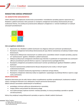 WAKACYJNA SZKOŁA SPRZEDAŻY CEL WARSZTATÓW SZKOLENIOWYCH: Celem szkolenia jest zwiększenie skuteczności pracowników i menedżerów sprzedaży poprzez zapoznanie się z Modelem Ludzkich Zachowań, który pozwala na rozwijanie umiejętności komunikacji dostosowanej do typu osobowości klienta, oraz praktyczne przećwiczenie zdobytych umiejętności w rozmów handlowych w trudnych sytuacjach sprzedażowych. Cele szczegółowe szkolenia to: Zapoznanie się z Modelem Ludzkich Zachowań oraz diagnoza własnych zachowań sprzedażowych, Rozwijanie umiejętności komunikacji dostosowanej do typu klienta nastawionej na budowę trwałych relacji biznesowych, Podnoszenie efektywności stosowanych na codzień przez uczestników metod i narzędzi sprzedaży, poprzez ich "podrasowanie" zgodnie z Modelem Ludzkich Zachowań, Zdobycie praktycznych umiejętności określania typu klientów na podstawie ich wypowiedzi oraz zachowań i odkrycia prawdziwych potrzeb klienta w oparciu o zaproponowaną typologię klientów, Rozwijanie umiejętności prowadzenia skutecznych rozmów sprzedażowych zgodnych Modelem Ludzkich Zachowań Poznanie mechanizmów podejmowania decyzji zakupowych przez osoby o różnych typach osobowości/zachowań, Stworzenie i rozwijanie skutecznej argumentacji w zależności od typu klienta, Rozwijanie umiejętności właściwej reakcji na wątpliwości i pojawiające się obiekcje klienta w oparciu o jego cechy zachowania. GRUPA DOCELOWA: Szkolenie skierowane jest do osób, którym zależy na podniesieniu wyników sprzedażowych, budowaniu trwałych relacji z istniejącymi klientami oraz zdobywaniu nowych partnerów biznesowych. Główni adresaci warsztatów szkoleniowych to handlowcy: posiadający minimum półroczne doświadczenie w sprzedaży, znający dobrze swój produkt lub oferowaną usługę oraz wykorzystujący wybrane techniki i metody sprzedaży, to znaczy prowadzący sprzedaż w sposób ustrukturyzowany, którzy chcą zwiększyć swoją efektywność sprzedaży w oparciu o Model Ludzkich Zachowań. 1 KORZYŚCI ZE SZKOLENIA: Po ukończeniu szkolenia jego uczestnicy: Zwiększą swoją sprzedaż dzięki umiejętnemu zarządzaniu relacjami z każdym typem klienta, Podniosą efektywność stosowania wcześniej poznanych technik sprzedażowych, Nabędą umiejętność wykorzystania kluczowych metod efektywnej rozmowy sprzedażowej w oparciu o Model Ludzkich Zachowań, Będą potrafili oceniać własne oddziaływanie na innych i modyfikować swój ulubiony styl sprzedaży w odpowiedzi na zróżnicowane potrzeby klientów, Będą potrafili budować własny wizerunek profesjonalnego sprzedawcy i zdobyć uznanie, Zyskają lojalność klientów, a dzięki temu podniosą wyniki sprzedażowe, Będą sobie lepiej radzić w tzw. trudnych sytuacjach w życiu zawodowym i osobistym. METODYKA: analiza przypadków, ćwiczenia, praca indywidualna i grupowa, gry i symulacje, odgrywanie ról, dyskusja moderowana, wykład. PROGRAM: 1. Wprowadzenie - Kluczowe etapy procesu sprzedaży o Istotne etapy rozmowy handlowej: nawiązanie kontaktu, rozpoznanie potrzeb, prezentacja korzyści, uchylanie obiekcji i zamykanie w sprzedaży, dostosowane do typu klienta, o Techniki i metody sprzedażowe stosowane na poszczególnych etapach sprzedaży. 2. Istota Modelu Ludzkich Zachowań o Cztery typy zachowań i ich główne cechy, o Typ „D” dominujący – nastawiony na cel, o Typ „I” inspirujący – pełen inicjatywy, o Typ „S” wspierający - zrównoważony, o Typ „C” analityczny – skrupulatny o Jakim typem jesteś - autodiagnoza? 3. Profil sprzedawcy – diagnoza silnych stron sprzedawcy o Jak sprzedajesz swoim klientom – jakim jesteś typem sprzedawcy?, o Jak postrzega cię twój klient, o Twoje silne strony jako sprzedawcy oraz kierunki rozwoju. 4. Metody diagnozowania typów zachowań i potrzeb klienta o Typologia klientów – rozpoznanie i charakterystyka 4 typów zachowań: Wzorce mówienia: ulubione pytania, odpowiedzi i zainteresowania, Komunikacja pozawerbalna: gesty, emocje, Stosunek do celów, procedur, zmian, utrzymywania porządku, punktualności itp., o Potrzeby i nastawienie w procesie sprzedaży klientów o różnych typach zachowań, o Motywacja klienta – co motywuje poszczególne typy klientów, dlaczego kupują produkty, usługi. 5. Cztery style sprzedaży i cztery typy klientów - strategie postępowania w rozmowie handlowej 2 o o o o Sprzedawanie klientowi dominującemu - osobie o dominujących cechach typu: „D”, Sprzedawanie klientowi pełnemu inicjatywy i energii - osobie o dominujących cechach typu: „I”, Sprzedawanie klientowi zrównoważonemu - osobie o dominujących cechach typu: „S”, Sprzedawanie klientowi skrupulatnemu - osobie o dominujących cechach typu: „C”. 6. Doskonalenie technik sprzedażowych stosowanych przez handlowców o Schemat technik i metod sprzedażowych pochodzących z doświadczeń uczestników, o "Podrasowanie" technik sprzedaży z uwzględnieniem typologii klientów różniących się: Sposobem przetwarzania informacji, Podejściem do zadań i ludzi, stosowania zasad, Podstawowymi priorytetami i oczekiwaniami, o "Podrasowane" techniki w działaniu. 7. Jak wdrażać nowe nawyki w codzienne życie zawodowe TRENERZY: dr Jarosław Rubin Trener biznesu i konsultant zarządzania. Doktor nauk ekonomicznych w dyscyplinie zarządzanie. Ukończył Politechnikę Wrocławską oraz studia Executive MBA na Akademii Ekonomicznej we Wrocławiu. Zajmował stanowiska związane z zarządzaniem oraz marketingiem i sprzedażą w firmach polskich i międzynarodowych od reprezentanta handlowego i doradcy technicznego, poprzez dyrektora ds. marketingu, do dyrektora-prokurenta spółki. Specjalizuje się w problematyce zarządzania, w szczególności zarządzania zmianą i zarządzania ludźmi oraz sprzedaży i negocjacji. Autor symulacji biznesowej z zakresu zarządzania zmianą "Change Masters". Prowadzi zajęcia ze studentami dotyczące zarz