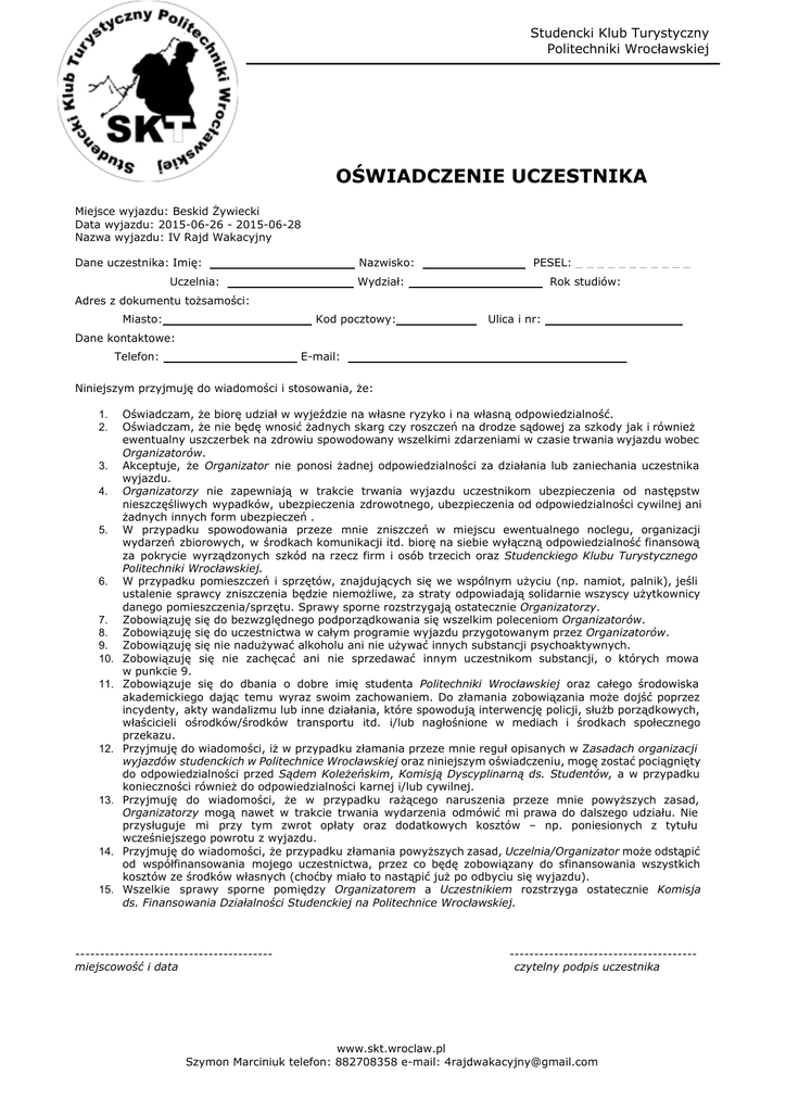 Studencki Klub Turystyczny Politechniki Wrocławskiej OŚWIADCZENIE UCZESTNIKA Miejsce wyjazdu: Beskid Żywiecki Data wyjazdu: 2015-06-26 - 2015-06-28 Nazwa wyjazdu: IV Rajd Wakacyjny Dane uczestnika: Imię: Uczelnia: Adres z dokumentu tożsamości: Miasto: Nazwisko: Wydział: Kod pocztowy: Dane kontaktowe: Telefon: PESEL: ___________ Rok studiów: Ulica i nr: E-mail: . . Niniejszym przyjmuję do wiadomości i stosowania, że: 1. Oświadczam, że biorę udział w wyjeździe na własne ryzyko i na własną odpowiedzialność. 2. Oświadczam, że nie będę wnosić żadnych skarg czy roszczeń na drodze sądowej za szkody jak i również ewentualny uszczerbek na zdrowiu spowodowany wszelkimi zdarzeniami w czasie trwania wyjazdu wobec Organizatorów . 3. Akceptuje, że Organizator nie ponosi żadnej odpowiedzialności za działania lub zaniechania uczestnika wyjazdu. 4. Organizatorzy nie zapewniają w trakcie trwania wyjazdu uczestnikom ubezpieczenia od następstw nieszczęśliwych wypadków, ubezpieczenia zdrowotnego, ubezpieczenia od odpowiedzialności cywilnej ani żadnych innych form ubezpieczeń . 5. W przypadku spowodowania przeze mnie zniszczeń w miejscu ewentualnego noclegu, organizacji wydarzeń zbiorowych, w środkach komunikacji itd. biorę na siebie wyłączną odpowiedzialność finansową za pokrycie wyrządzonych szkód na rzecz firm i osób trzecich oraz Studenckiego Klubu Turystycznego Politechniki Wrocławskiej. 6. W przypadku pomieszczeń i sprzętów, znajdujących się we wspólnym użyciu (np. namiot, palnik), jeśli ustalenie sprawcy zniszczenia będzie niemożliwe, za straty odpowiadają solidarnie wszyscy użytkownicy danego pomieszczenia/sprzętu. Sprawy sporne rozstrzygają ostatecznie Organizatorzy . 7. Zobowiązuję się do bezwzględnego podporządkowania się wszelkim poleceniom Organizatorów . 8. Zobowiązuję się do uczestnictwa w całym programie wyjazdu przygotowanym przez Organizatorów . 9. Zobowiązuję się nie nadużywać alkoholu ani nie używać innych substancji psychoaktywnych. 10. Zobowiązuję się nie zachęcać ani nie sprzedawać innym uczestnikom substancji, o których mowa w punkcie 9. 11. Zobowiązuje się do dbania o dobre imię studenta Politechniki Wrocławskiej oraz całego środowiska akademickiego dając temu wyraz swoim zachowaniem. Do złamania zobowiązania może dojść poprzez incydenty, akty wandalizmu lub inne działania, które spowodują interwencję policji, służb porządkowych, właścicieli ośrodków/środków transportu itd. i/lub nagłośnione w mediach i środkach społecznego przekazu. 12. Przyjmuję do wiadomości, iż w przypadku złamania przeze mnie reguł opisanych w Z asadach organizacji wyjazdów studenckich w Politechnice Wrocławskiej oraz niniejszym oświadczeniu, mogę zostać pociągnięty do odpowiedzialności przed Sądem Koleżeńskim , Komisją Dyscyplinarną ds. Studentów, a w przypadku konieczności również do odpowiedzialności karnej i/lub cywilnej. 13. Przyjmuję do wiadomości, że w przypadku rażącego naruszenia przeze mnie powyższych zasad, Organizatorzy mogą nawet w trakcie trwania wydarzenia odmówić mi prawa do dalszego udziału. Nie przysługuje mi przy tym zwrot opłaty oraz dodatkowych kosztów – np. poniesionych z tytułu wcześniejszego powrotu z wyjazdu. 14. Przyjmuję do wiadomości, że przypadku złamania powyższych zasad, Uczelnia/Organizator może odstąpić od współfinansowania mojego uczestnictwa, przez co będę zobowiązany do sfinansowania wszystkich kosztów ze środków własnych (choćby miało to nastąpić już po odbyciu się wyjazdu). 15. Wszelkie sprawy sporne pomiędzy Organizatorem a Uczestnikiem rozstrzyga ostatecznie Komisja ds. Finansowania Działalności Studenckiej na Politechnice Wrocławskiej. ---------------------------------------miejscowość i data -------------------------------------czytelny podpis uczestnika www.skt.wroclaw.pl Szymon Marciniuk telefon: 882708358 e-mail: [email protected]