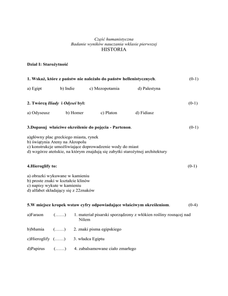 Część humanistyczna Badanie wyników nauczania wklasie pierwszej HISTORIA Dział I: Starożytność 1. Wskaż, które z państw nie należało do państw hellenistycznych. a) Egipt b) Indie c) Mezopotamia d) Palestyna 2. Twórcą Iliady i Odysei był: a) Odyseusz b) Homer (0-1) (0-1) c) Platon d) Fidiasz 3.Dopasuj właściwe określenie do pojęcia - Partenon. (0-1) a)główny plac greckiego miasta, rynek b) świątynia Ateny na Akropolu c) konstrukcje umożliwiające doprowadzenie wody do miast d) wzgórze ateńskie, na którym znajdują się zabytki starożytnej architektury 4.Hieroglify to: (0-1) a) obrazki wykuwane w kamieniu b) proste znaki w kształcie klinów c) napisy wykute w kamieniu d) alfabet składający się z 22znaków 5.W miejsce kropek wstaw cyfry odpowiadające właściwym określeniom. (0-4) a)Faraon (……) 1. materiał pisarski sporządzony z włókien rośliny rosnącej nad Nilem b)Mumia (……) 2. znaki pisma egipskiego c)Hieroglify (……) d)Papirus (……) 3. władca Egiptu 4. zabalsamowane ciało zmarłego 6. Połącz postać z informacją o niej. (0- 5) A. król Sparty, dowódca w bitwie pod Termopilami B. bohater wojny trojańskiej, król Itaki, zbudował wraz z towarzyszami konia trojańskiego C. rzeźbiarz, twórca posągu Ateny D. zwyciężył Persów w bitwie pod Maratonem E. nauczyciel Aleksandra Wielkiego postać Arystoteles Odyseusz Fidiasz Leonidas Miltiades A B C D E 7.Jakie wydarzenie zapoczątkowało naszą erę? ( 0-1) a) upadek cesarstwa zachodnio-rzymskiego b) śmierć Juliusza Cezara c) śmierć Spartakusa d) narodziny Chrystusa 8.Podaj znaczenie pojęcia - termy: (0-1) a) budowle dostarczające wodę do miast b) łaźnie miejskie c) świątynie w starożytnym Rzymie d) tory wyścigowe w starożytnym Rzymie 9.Podaj konkurencje pięcioboju olimpijskiego. ( 0-1) a) bieg na 200 metrów, skok w dal, rzut dyskiem, rzut oszczepem, zapasy b) bieg na 100 metrów, skok w dal, rzut dyskiem, rzut oszczepem, zapasy a) bieg na 200 metrów, skok wzwyż, rzut dyskiem, rzut oszczepem, zapasy b) bieg na 100 metrów, skok w dal, rzut dyskiem, rzut kulą, zapasy 10. Dokończ poniższe zdanie, wybierając właściwą odpowiedź spośród podanych. (0-1) Pierwsze igrzyska olimpijskie odbyły się w roku 776 p.n.e., czyli w a) b) c) d) I połowie VII w. p.n.e. II połowie VII w. p.n.e. I połowie VIII w. p.n.e. II połowie VIII w. p.n.e. 11.W miejsce kropek wstaw cyfry odpowiadające właściwym określeniom. (0-6) a)Papież ( ……) 1. Bóg Żydów b)Akropol (……) 2. główny plac greckiego miasta, rynek c)Jahwe (……) 3. świątynia Ateny na Akropolu d)Agora (……) 4. głowa Kościoła katolickiego e)Partenon (……) 5. konstrukcje umożliwiające doprowadzenie wody do miast f)Akwedukty (……) 6. wzgórze ateńskie, na którym znajdują się zabytki starożytnej architektury 12.Uporządkuj chronologicznie wydarzenia podane w tabeli, posługując się cyframi od 1 -4 . (0-1) Wydarzenie Bitwa pod Kannami Bitwa pod Maratonem Rzym staje się republiką Upadek cesarstwa zachodnio-rzymskiego Odpowiednia cyfra 13. Największe osiągnięcia w dziedzinie prawa, budowy dróg i wodociągów poczynili (0-1) a) Sumerowie b) Egipcjanie c) Grecy d) Rzymianie 14.W którym szeregu zapisano w poprawnej kolejności nazwy religii, zaczynając od tej religii, która pojawiła się na świecie najwcześniej, kończąc na tej, która pojawiła się najpóźniej? (0-1) a) b) c) d) judaizm, islam, chrześcijaństwo islam, judaizm, chrześcijaństwo judaizm, chrześcijaństwo, islam chrześcijaństwo, islam, judaizm Dział II: Średniowiecze 1.Traktat w Verdun dokonujący podziału Państwa Franków został zawarty w roku: (0-1) a) 1296 b) 1300 c) 843 d) 622 2.Które z wydarzeń było chronologicznie pierwsze. (0-1) a) Traktat w Verdun b) Koronacja Karola Wielkiego na cesarza c) Koronacja Ottona I na cesarza d) Ucieczka Mahometa z Mekki do Medyny 3. Który władca został koronowany na króla w 1025r. ? a) Bolesław Śmiały b) Zbigniew (0-1) c) Bolesław Chrobry d) Mieszko I 4.Wskaż, który z władców Polski miał konflikt z biskupem krakowskim Stanisławem?. (0-1) a) Bolesław Krzywousty b) Mieszko II c) Władysław Łokietek d) Kazimierz Wielki 5.Który z władców podzielił Polskę na dzielnice? (0-1) a) Bolesław Chrobry b) Kazimierz Odnowiciel c) Kazimierz Wielki d) Bolesław Krzywousty 6.Mieszko I przyjął chrzest w roku: a) 965 b) 966 ( 0-1) c) 968 d) 972 7. Uzupełnij tekst, wpisując w miejsce wykropkowane nazwy wymienione w ramce . (0-9) Chrobry, cesarz, Mieszko I, pielgrzymka, syn, Prusowie, Bolesław III, Wojciech, Po śmierci ………………. władzę w Polsce objął jego ………… ………………. Chrobry . W roku 1000 do Gniezna przybył …………….. niemiecki Otton ………. . Przybył on by odbyć …………………… do grobu swego przyjaciela, biskupa ………………….., którego ciało wykupił ……………………… z rąk pogańskich …………………….. . 8.Pierwszy kronikarz polski, który opisał dzieje panowania Bolesława Krzywoustego to: (0-1) a)Wincenty Kadłubek b)Gall Anonim c)Jan Długosz d)Thietmar 9.Podaj datę zawarcia pokoju w Budziszynie między Polską a Niemcami. (0-1) a) 1138r. b) 1018r. c) 1000r. d)1025r. 10.W skład dzielnicy senioralnej wchodziła (0-1) a) ziemia krakowska, część Wielkopolski z Gnieznem, ziemia sieradzka b) ziemia kaliska, część Wielkopolski z Gnieznem, ziemia sieradzka c) ziemia krakowska, część Wielkopolski z Gnieznem, Pomorze b) ziemia kaliska, część Wielkopolski z Gnieznem, Mazowsze 11.Uzupełnij zdania, wpisując w miejsce wykropkowane nazwy i daty wymienione w ramce . (0-6) 622r., 630r., Mekka, muzułmanie, islam, Medyna, Mahomet, Allah Religię zwaną ……………. wśród Arabów wprowadził……………. . Głosiła ona wiarę w jednego prawdziwego Boga - ……………. . Wyznawców tej religii nazywamy ……………… . W roku ……………