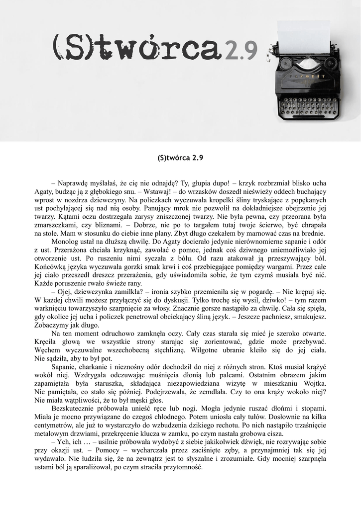 (S)twórca 2.9 – Naprawdę myślałaś, że cię nie odnajdę? Ty, głupia dupo! – krzyk rozbrzmiał blisko ucha Agaty, budząc ją z głębokiego snu. – Wstawaj! – do wrzasków doszedł nieświeży oddech buchający wprost w nozdrza dziewczyny. Na policzkach wyczuwała kropelki śliny tryskające z popękanych ust pochylającej się nad nią osoby. Panujący mrok nie pozwolił na dokładniejsze obejrzenie jej twarzy. Kątami oczu dostrzegała zarysy zniszczonej twarzy. Nie była pewna, czy przeorana była zmarszczkami, czy bliznami. – Dobrze, nie po to targałem tutaj twoje ścierwo, być chrapała na stole. Mam w stosunku do ciebie inne plany. Zbyt długo czekałem by marnować czas na brednie. Monolog ustał na dłuższą chwilę. Do Agaty docierało jedynie nierównomierne sapanie i odór z ust. Przerażona chciała krzyknąć, zawołać o pomoc, jednak coś dziwnego uniemożliwiało jej otworzenie ust. Po ruszeniu nimi syczała z bólu. Od razu atakował ją przeszywający ból. Końcówką języka wyczuwała gorzki smak krwi i coś przebiegające pomiędzy wargami. Przez całe jej ciało przeszedł dreszcz przerażenia, gdy uświadomiła sobie, że tym czymś musiała być nić. Każde poruszenie rwało świeże rany. – Ojej, dziewczynka zamilkła? – ironia szybko przemieniła się w pogardę. – Nie krępuj się. W każdej chwili możesz przyłączyć się do dyskusji. Tylko trochę się wysil, dziwko! – tym razem warknięciu towarzyszyło szarpnięcie za włosy. Znacznie gorsze nastąpiło za chwilę. Cała się spięła, gdy okolice jej ucha i policzek penetrował obciekający śliną język. – Jeszcze pachniesz, smakujesz. Zobaczymy jak długo. Na ten moment odruchowo zamknęła oczy. Cały czas starała się mieć je szeroko otwarte. Kręciła głową we wszystkie strony starając się zorientować, gdzie może przebywać. Węchem wyczuwalne wszechobecną stęchliznę. Wilgotne ubranie kleiło się do jej ciała. Nie sądziła, aby to był pot. Sapanie, charkanie i nieznośny odór dochodził do niej z różnych stron. Ktoś musiał krążyć wokół niej. Wzdrygała odczuwając muśnięcia dłonią lub palcami. Ostatnim obrazem jakim zapamiętała była staruszka, składająca niezapowiedziana wizytę w mieszkaniu Wojtka. Nie pamiętała, co stało się później. Podejrzewała, że zemdlała. Czy to ona krąży wokoło niej? Nie miała wątpliwości, że to był męski głos. Bezskutecznie próbowała unieść ręce lub nogi. Mogła jedynie ruszać dłońmi i stopami. Miała je mocno przywiązane do czegoś chłodnego. Potem uniosła cały tułów. Dosłownie na kilka centymetrów, ale już to wystarczyło do wzbudzenia dzikiego rechotu. Po nich nastąpiło trzaśnięcie metalowym drzwiami, przekręcenie klucza w zamku, po czym nastała grobowa cisza. – Ych, ich … – usilnie próbowała wydobyć z siebie jakikolwiek dźwięk, nie rozrywając sobie przy okazji ust. – Pomocy – wycharczała przez zaciśnięte zęby, a przynajmniej tak się jej wydawało. Nie łudziła się, że na zewnątrz jest to słyszalne i zrozumiałe. Gdy mocniej szarpnęła ustami ból ją sparaliżował, po czym straciła przytomność. *** Sierżant z niedowierzaniem wpatrywał się w martwego psa. Odczuł ulgę, gdy przekonał się, że nie ma w piwnicy kobiety. To dawało szansę, że uda mu się odnaleźć ja całą, a przynajmniej żywą. Dawno nie widział tak brutalnej egzekucji zwierzęcia. Zaszokowany nie zwrócił nawet uwagi na kopertę przybitą do tułowia zwierzęcia. Dostrzegł ją po dłuższej chwili, gdy duża część zdążyła nasiąknąć krwią. Podszedł wówczas pospiesznie do zwierzęcia. Na początku chciał rozerwać kopertę nie wyciągając gwoździa, który znajdował się w jej samym środku. Nie było wątpliwości, że zwierzę nie żyje. W kopercie mogła być ważna informacja. Na zewnątrz słychać było syreny nadjeżdżających radiowozów. Nie po raz pierwszy dzisiejszego dnia postanowił złamać procedury. Nigdy nie miał do nich szczególnego poważania, jednak ten dzień był pod tym kątem rekordowy. Słyszał zbiegających do piwnicy policjantów, gdy podskoczył do zwierzęcia, wyrwał z niego gwóźdź, po czym pospiesznie schował go wraz z kopertą do kieszeni w spodniach. – Jestem policjantem! – krzyknął przezornie, gdy blaski latarek oświetliły piwnicę. Wolał nie przekonywać się na własnej skórze, czy ich źródłem są halogeny latarek funkcjonariuszy, czy karabiny grupy antyterrorystycznej. – Sierżant Nowak, dochodzeniówka, komisariat Słupsk! – dodał na wszelki wypadek, nie wykonując gwałtownych ruchów. Trudniejsze było wyjaśnienie powodu strzelania do kłódki piwnicy, gdzie trzymany był martwy pies. Na miał ochoty dzielić się wszystkimi szczegółami. Lakonicznie wspomniał o mężczyźnie w szpitalu i poszukiwaniu kobiety. Specjalnie nie siadał i nie kucał, aby trzymany w kieszeni gwóźdź nie przebił spodni. Problem pojawił się w momencie, gdy musiał wsiąść do radiowozu. Udając atak skurczu usztywnił nogę i z grymasem na twarzy ją rozmasowywał. – Jesteś ranny? – zapytał troskliwie funkcjonariuszka. Zaprzeczył. Później nie było już tak miło. – Byłem przekonany, że kobieta jest w środku – tłumaczył policjantce skrupulatnie spisującej wyjaśnienia. Siedzieli w radiowozie, chcąc w ten sposób ukryć się przed masą gapiów zebranych przed klatką. Strzelanina oraz pojawienie się zamaskowanych, uzbrojonych po zęby policjantów stanowiło atrakcję dla całego osiedla. Szeptając między sobą utwierdzali się w przekonaniu, że za chwilę wyniesione zostanie ciało w czarnym worku. – Mówię wam, słyszałem krzyk – upierał się jeden mężczyzna, starający się wyjść na bohatera. – Już miałem biec do klatki, gdy oni przyjechali. No, ci policjanci. Zamiast z ciałem, jeden z policjantów wyszedł z niewielkim, niebieskim workiem. – To dzi