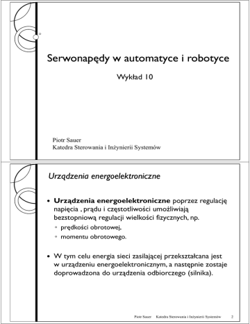 Serwonapędy w automatyce i robotyce Wykład 10 Piotr Sauer Katedra Sterowania i Inżynierii Systemów Urządzenia energoelektroniczne Urządzenia energoelektroniczne poprzez regulację napięcia , prądu i częstotliwości umoŜliwiają bezstopniową regulacji wielkości fizycznych, np. ◦ prędkości obrotowej, ◦ momentu obrotowego. W tym celu energia sieci zasilającej przekształcana jest w urządzeniu energoelektronicznym, a następnie zostaje doprowadzona do urządzenia odbiorczego (silnika). Piotr Sauer Katedra Sterowania i Inżynierii Systemów 2 Urządzenia energoelektroniczne Styczniki półprzewodnikowe Styczniki półprzewodnikowe umoŜliwiają szybkie i bezgłośne załączanie trójfazowych silników prądu przemiennego i obciąŜeń rezystancyjnych. Włączanie następuje automatycznie do optymalnego punktu czasowego eliminując tym samym niepoŜądane szczytowe wartości prądu. Piotr Sauer Katedra Sterowania i Inżynierii Systemów 3 Urządzenia energoelektroniczne Układy łagodnego rozruchu Sterują one napięciem sieciowym regulując jego wartość od ustawialnej wartości początkowej do 100%. Dzięki temu następuje łagodny rozruch silnika. W porównaniu do normalnego momentu rozruchowego silnika, redukcja napięcia prowadzi do obniŜenia momentu w silniku proporcjonalnie do kwadratu napięcia. Softstartery nadają się szczególnie do rozruchu obciąŜeń o kwadratowym przebiegu momentu w funkcji prędkości obrotowej (np. pompy albo wentylatory). Piotr Sauer Katedra Sterowania i Inżynierii Systemów 4 Urządzenia energoelektroniczne Przemienniki częstotliwości Przemienniki częstotliwości wykorzystując sieć 1- lub 3-fazową prąd przemiennego o stałej wartości napięcia i częstotliwości tworzą nową sieć prądu przemiennego o regulowanej wartości napięcia i częstotliwości z której zasilany jest silnik. Sterowanie napięciem i częstotliwością umoŜliwia bezstopniową regulację prędkości obrotowej silników trójfazowych. Dzięki temu napęd moŜe być uruchomiony ze znamionowym momentem równieŜ przy niewielkich prędkościach obrotowych. Piotr Sauer Katedra Sterowania i Inżynierii Systemów 5 Urządzenia energoelektroniczne o sterowaniu skalarnym (konwencjonalne) - w rozwiązaniu tym utrzymywany jest stały stosunek pomiędzy napięciem wejściowym do falownika U, a częstotliwością wyjściową f. Stosowane są one w układach, gdzie nie wymaga się duŜej precyzji kąta oraz mamy do czynienia z niewielką dynamiką (pompy, wentylatory, podajniki), o sterowaniu wektorowym (strumienia i ewentualnie momentu) - cechuje je duŜa precyzja, doskonała dynamika i sukcesywnie wypierają one napędy prądu stałego. W wektorowym przemienniku częstotliwości regulacja następuje dzięki pozbawionej czujników regulacji pola elektromagnetycznego w silniku. Piotr Sauer Katedra Sterowania i Inżynierii Systemów 6 Przemienniki częstotliwości Budowa 1 – Prostownik 2 – Obwód pośredni napięcia stałego 3 – Falownik 4 – Układ sterowania Piotr Sauer Katedra Sterowania i Inżynierii Systemów 7 Przemienniki częstotliwości Przemiennik częstotliwości przekształca trójfazowe (jednofazowe) zmienne napięcie sieciowe o stałej częstotliwość w napięcie stałe (prostownik). Napięcie stałe słuŜy do wytworzenia trójfazowej sieci o zmiennym napięciu i zmiennej częstotliwości (falownik). Przemiennik częstotliwości pobiera z sieci zasilającej praktycznie tylko moc czynną (cosφ ~ 1). Obwód pośredni napięcia stałego - dostarcza moc bierną Piotr Sauer Katedra Sterowania i Inżynierii Systemów 8 Przemienniki częstotliwości Piotr Sauer Katedra Sterowania i Inżynierii Systemów 9 Przemienniki częstotliwości Moment obrotowy M rozwijany przez silnik asynchroniczny jest proporcjonalny do prądu IW i strumienia ϕ: M ≈ φ × IW Do optymalizacji momentu obrotowego silnika, strumień magnetyczny w szczelinie powietrznej silnika musi być utrzymany na stałym poziomie. φ≈ U f Piotr Sauer Katedra Sterowania i Inżynierii Systemów 10 Przemienniki częstotliwości Kiedy silnik jest obciążony i pracuje w zakresie małych prędkości – f < 10Hz, występuje duży spadek napięcia na rezystancji uzwojeń stojana. Piotr Sauer Katedra Sterowania i Inżynierii Systemów 11 Przemienniki częstotliwości Przykład. Silnik o mocy P=1,1kW, napięciu nominalnym U=3×400V f=50Hz o rezystancji uzwojenia stojana R (jednej fazy) wynoszącej około 8 Ω, pobiera prąd 3A przy nominalnym obciąŜeniu. Spadek napięcia na rezystancji uzwojenia stojana w tym przypadku wynosi 24V. Napięcie ok. 40V przy 5 Hz jest odpowiednim napięciem do sterowania silnika wg charakterystyki U/f. Jeśli obciąŜymy silnik nominalnie i pobierze on prąd do 3A, wtedy napięcie o wartości około 24V powoduje jedynie powstawanie strat. WaŜne jest, Ŝe tylko napięcie o wartości 16V jest wykorzystywane do magnesowania silnika. Gdy silnik jest niedomagnesowany to wytwarza mniejszy moment napędowy. Piotr Sauer Katedra Sterowania i Inżynierii Systemów 12 Przemienniki częstotliwości Aby utrzymać stały strumień, silnika spadek napięcia na rezystancji uzwojeń silnika musi być kompensowany: ◦ zwiększenie napięcia wyjściowego przemiennika częstotliwości w zakresie małych prędkości silnika przez wykorzystanie otwartej pętli sterowania. ◦ regulacja napięcia wyjściowego przemiennika częstotliwości poprzez wykorzystanie oddziaływania na wartość składowej czynnej prądu wyjściowego przemiennika. Określenia: ◦ ◦ ◦ ◦ kompensacja I x R, podbicie napięcia (ang. boost), zwiększenie momentu (ang. torque raising), kompensacja startu (ang. start compensation). Piotr Sauer Katedra Sterowania i Inżynierii Systemów 13 Przemienniki częstotliwości Przemienniki częstotliwości automatycznie kontrolują parametry kompensacyjne na podstawie częstotliwości, napięcia i prądu silnika. Parametry kompensacyjne umoŜliwiają zapewnienie optym