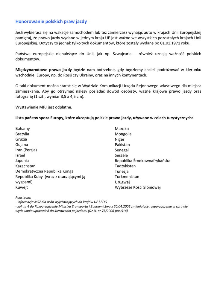 Honorowanie polskich praw jazdy Je li wybierasz si na wakacje samochodem lub te zamierzasz wynaj auto w krajach Unii Europejskiej pami taj, e prawo jazdy wydane w jednym kraju UE jest wa ne we wszystkich pozosta ych krajach Unii Europejskiej. Dotyczy to jednak tylko tych dokumentów, które zosta y wydane po 01.01.1971 roku. Pa stwa europejskie nienale ce do Unii, jak np. Szwajcaria – równie uznaj dokumentów. wa no polskich Mi dzynarodowe prawo jazdy b dzie nam potrzebne, gdy b dziemy chcieli podró owa w kierunku wschodniej Europy, np. do Rosji czy Ukrainy, oraz na innych kontynentach. O taki dokument mo na stara si w Wydziale Komunikacji Urz du Rejonowego w ciwego dla miejsca zamieszkania. Aby go otrzyma nale y posiada dowód osobisty, wa ne krajowe prawo jazdy oraz fotografi (1 szt., wymiar 3,5 x 4,5 cm). Wystawienie MPJ jest odp atne. Lista pa stw spoza Europy, które akceptuj polskie prawo jazdy, u ywane w celach turystycznych: Bahamy Brazylia Gruzja Gujana Iran (Persja) Izrael Japonia Kazachstan Demokratyczna Republika Konga Republika Kuby (wraz z otaczaj cymi j wyspami) Kuwejt Maroko Mongolia Niger Pakistan Senegal Seszele Republika rodkowoafryka ska Tad ykistan Tunezja Turkmenistan Urugwaj Wybrze e Ko ci S oniowej Podstawa: - Informacja MSZ dla osób wyje aj cych do krajów UE i EOG - za . nr 4 do Rozporz dzenie Ministra Transportu i Budownictwa z 20.04.2006 zmieniaj ce rozporz dzenie w sprawie wydawania uprawnie do kierowania pojazdami (Dz.U. nr 73/2006 poz.514)