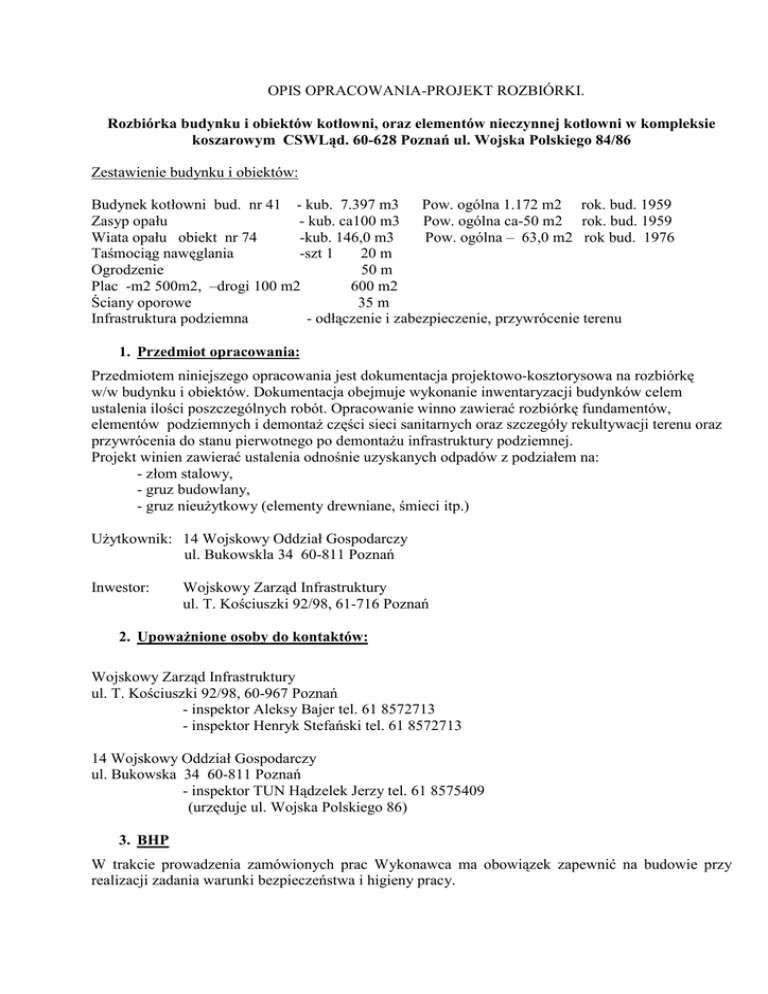 OPIS OPRACOWANIA-PROJEKT ROZBIÓRKI. Rozbiórka budynku i obiektów kotłowni, oraz elementów nieczynnej kotłowni w kompleksie koszarowym CSWLąd. 60-628 Poznań ul. Wojska Polskiego 84/86 Zestawienie budynku i obiektów: Budynek kotłowni bud. nr 41 - kub. 7.397 m3 Pow. ogólna 1.172 m2 rok. bud. 1959 Zasyp opału - kub. ca100 m3 Pow. ogólna ca-50 m2 rok. bud. 1959 Wiata opału obiekt nr 74 -kub. 146,0 m3 Pow. ogólna – 63,0 m2 rok bud. 1976 Taśmociąg nawęglania -szt 1 20 m Ogrodzenie 50 m Plac -m2 500m2, –drogi 100 m2 600 m2 Ściany oporowe 35 m Infrastruktura podziemna - odłączenie i zabezpieczenie, przywrócenie terenu 1. Przedmiot opracowania: Przedmiotem niniejszego opracowania jest dokumentacja projektowo-kosztorysowa na rozbiórkę w/w budynku i obiektów. Dokumentacja obejmuje wykonanie inwentaryzacji budynków celem ustalenia ilości poszczególnych robót. Opracowanie winno zawierać rozbiórkę fundamentów, elementów podziemnych i demontaż części sieci sanitarnych oraz szczegóły rekultywacji terenu oraz przywrócenia do stanu pierwotnego po demontażu infrastruktury podziemnej. Projekt winien zawierać ustalenia odnośnie uzyskanych odpadów z podziałem na: - złom stalowy, - gruz budowlany, - gruz nieużytkowy (elementy drewniane, śmieci itp.) Użytkownik: 14 Wojskowy Oddział Gospodarczy ul. Bukowskla 34 60-811 Poznań Inwestor: Wojskowy Zarząd Infrastruktury ul. T. Kościuszki 92/98, 61-716 Poznań 2. Upoważnione osoby do kontaktów: Wojskowy Zarząd Infrastruktury ul. T. Kościuszki 92/98, 60-967 Poznań - inspektor Aleksy Bajer tel. 61 8572713 - inspektor Henryk Stefański tel. 61 8572713 14 Wojskowy Oddział Gospodarczy ul. Bukowska 34 60-811 Poznań - inspektor TUN Hądzelek Jerzy tel. 61 8575409 (urzęduje ul. Wojska Polskiego 86) 3. BHP W trakcie prowadzenia zamówionych prac Wykonawca ma obowiązek zapewnić na budowie przy realizacji zadania warunki bezpieczeństwa i higieny pracy. 4. Ochrona p.poż W trakcie prowadzenia robót Wykonawca ma obowiązek przestrzegać wszelkich przepisów i wymogów dotyczących ochrony przeciwpożarowej. 5. Wykonanie prac Inwestor wprowadzi wykonawcę na teren robót w uzgodnieniu z użytkownikiem. Notatką z wejścia na teren zostaną ustalone miejsca wywozu odpadów, parametry do kosztorysu inwestorskiego i miejsca odcięcia sieci. Wykonawca wykona prace własnym staraniem – wejście na obiekty, przekucia i wykopy oraz użycie własnych urządzeń i narzędzi. Dokumentację wykonać w formie graficznej w języku polskim. Opracowanie powinno składać się z podstawowych części na poszczególne budynki i obiekty. Do obowiązków projektanta należy uzyskanie decyzji administracyjnej na rozbiórki ww. obiektów. Inwestor dostarczy wycinek mapy (podkład geodezyjny-sytuacyjny). Zakres opracowania projektowego: - inwentaryzacja budynku w zakresie wymaganego opracowania projektowego - projekt z technologią rozbiórki - przedmiary robót - kosztorys inwestorski-szczegółowy - specyfikację techniczną wykonania i odbioru robót Na komplet dokumentów składa się: - projekt budowlano-wykonawczy z informacją BIOZ - przedmiary robót - kosztorysy inwestorskie - specyfikacja techniczna wykonania i odbioru robót - zapis dokumentacji na CD w formacie PDF - 5 egz. 3 egz. 2 egz. 2 egz. 1 egz. 6. Kontrola robót Inwestor zastrzega sobie prawo ciągłej kontroli prowadzonych prac w celu zapewnienia wykonania ich w zakresie zgodnym z warunkami. Wykonawca winien posiadać odpowiednie dla rodzaju robót kwalifikacje - uprawnienia budowlane o nieograniczonym zakresie w specjalności konstrukcyjno budowlanej oraz przynależność do organu samorządu budowlanego. 7. Odbiór robót Całkowite zakończenie prac, odbiór i gotowość przekazania opracowania Zamawiającemu wykonawca dokonuje protokolarnie, spisując protokół zakończenia i przekazania. Termin wykonania zamówienia jest równoznaczny z terminem złożenia przez Wykonawcę wniosków o pozwolenie na (budowę)- rozbiórkę oraz przekazaniem wcześniej uzgodnionej z Zamawiającym pozostałej części dokumentacji. Wynagrodzenie za wykonane zamówienie zostanie wypłacone po uzyskaniu pozwoleń i otrzymaniu zatwierdzonych projektów. 8. Rozliczanie robót Ryczałtowe na podstawie cen ofertowych wykonanych i odebranych przez inspektora nadzoru robót. 9. Obowiązujące przepisy określające wymogi przy sporządzaniu dokumentacji: − Rozporządzenie Ministra Infrastruktury z 18.05.2004 r. w sprawie określania metod i podstaw sporządzenia kosztorysu inwestorskiego, obliczania planowanych kosztów prac projektowych, oraz planowanych kosztów robót budowlanych określonych w programie funkcjonalno-użytkowym. − Rozporządzenie Ministra Infrastruktury z 2 września 2004 r. w sprawie szczegółowego zakresu i formy dokumentacji projektowej, specyfikacji technicznych wykonania i odbioru robót budowlanych oraz programu funkcjonalno-użytkowego, z późniejszymi zmianami. − Rozporządzenie Ministra Transportu, Budownictwa i Gospodarki Morskiej z dnia 25 kwietnia 2012 r. w sprawie szczegółowego zakresu i formy projektu budowlanego. Opracował: Aleksy Bajer Poznań styczeń 2014r OPIS OPRACOWANIA-PROJEKT ROZBIÓRKI. Na opracowanie dokumentacji technicznej na rozbiórkę - demontaż budynku i obiektów nieczynnej kotłowni w kompleksie JW. 3918 Jarocin ul. Wojska Polskiego 71-75 Zestawienie budynków i obiektów: Budynek kotłowni z wiatą nr 30 Plac Oświetlenie Kanalizacja i woda - kub. 4.006 m3 500 m2 Pow. ogólna -699 m2 rok. bud. 1969 1. Przedmiot opracowania: Przedmiotem niniejszego opracowania jest dokumentacja projektowo-kosztorysowa na rozbiórkę w/w budynków i obiektów. Dokumentacja obejmuje wykonanie inwentaryzacji budynków celem ustalenia ilości poszczególnych robót. Opracowanie winno zawierać rozbiórkę fundamentów, części podziemnej i demontaż części sieci sanitarnych oraz szczegóły rekultywacji terenu i przywrócenia do stanu pierw