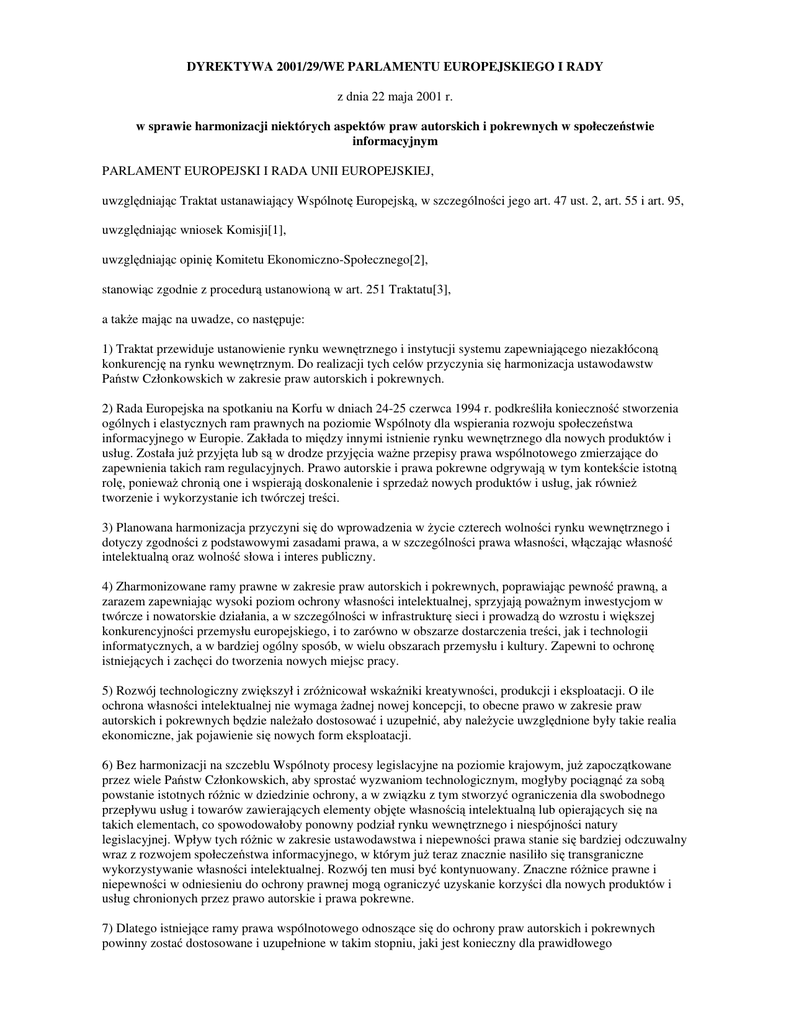 DYREKTYWA 2001/29/WE PARLAMENTU EUROPEJSKIEGO I RADY z dnia 22 maja 2001 r. w sprawie harmonizacji niektórych aspektów praw autorskich i pokrewnych w społecze stwie informacyjnym PARLAMENT EUROPEJSKI I RADA UNII EUROPEJSKIEJ, uwzgl dniaj c Traktat ustanawiaj cy Wspólnot Europejsk , w szczególno ci jego art. 47 ust. 2, art. 55 i art. 95, uwzgl dniaj c wniosek Komisji[1], uwzgl dniaj c opini Komitetu Ekonomiczno-Społecznego[2], stanowi c zgodnie z procedur ustanowion w art. 251 Traktatu[3], a tak e maj c na uwadze, co nast puje: 1) Traktat przewiduje ustanowienie rynku wewn trznego i instytucji systemu zapewniaj cego niezakłócon konkurencj na rynku wewn trznym. Do realizacji tych celów przyczynia si harmonizacja ustawodawstw Pa stw Członkowskich w zakresie praw autorskich i pokrewnych. 2) Rada Europejska na spotkaniu na Korfu w dniach 24-25 czerwca 1994 r. podkre liła konieczno stworzenia ogólnych i elastycznych ram prawnych na poziomie Wspólnoty dla wspierania rozwoju społecze stwa informacyjnego w Europie. Zakłada to mi dzy innymi istnienie rynku wewn trznego dla nowych produktów i usług. Została ju przyj ta lub s w drodze przyj cia wa ne przepisy prawa wspólnotowego zmierzaj ce do zapewnienia takich ram regulacyjnych. Prawo autorskie i prawa pokrewne odgrywaj w tym kontek cie istotn rol , poniewa chroni one i wspieraj doskonalenie i sprzeda nowych produktów i usług, jak równie tworzenie i wykorzystanie ich twórczej tre ci. 3) Planowana harmonizacja przyczyni si do wprowadzenia w ycie czterech wolno ci rynku wewn trznego i dotyczy zgodno ci z podstawowymi zasadami prawa, a w szczególno ci prawa własno ci, wł czaj c własno intelektualn oraz wolno słowa i interes publiczny. 4) Zharmonizowane ramy prawne w zakresie praw autorskich i pokrewnych, poprawiaj c pewno prawn , a zarazem zapewniaj c wysoki poziom ochrony własno ci intelektualnej, sprzyjaj powa nym inwestycjom w twórcze i nowatorskie działania, a w szczególno ci w infrastruktur sieci i prowadz do wzrostu i wi kszej konkurencyjno ci przemysłu europejskiego, i to zarówno w obszarze dostarczenia tre ci, jak i technologii informatycznych, a w bardziej ogólny sposób, w wielu obszarach przemysłu i kultury. Zapewni to ochron istniej cych i zach ci do tworzenia nowych miejsc pracy. 5) Rozwój technologiczny zwi kszył i zró nicował wska niki kreatywno ci, produkcji i eksploatacji. O ile ochrona własno ci intelektualnej nie wymaga adnej nowej koncepcji, to obecne prawo w zakresie praw autorskich i pokrewnych b dzie nale ało dostosowa i uzupełni , aby nale ycie uwzgl dnione były takie realia ekonomiczne, jak pojawienie si nowych form eksploatacji. 6) Bez harmonizacji na szczeblu Wspólnoty procesy legislacyjne na poziomie krajowym, ju zapocz tkowane przez wiele Pa stw Członkowskich, aby sprosta wyzwaniom technologicznym, mogłyby poci gn za sob powstanie istotnych ró nic w dziedzinie ochrony, a w zwi zku z tym stworzy ograniczenia dla swobodnego przepływu usług i towarów zawieraj cych elementy obj te własno ci intelektualn lub opieraj cych si na takich elementach, co spowodowałoby ponowny podział rynku wewn trznego i niespójno ci natury legislacyjnej. Wpływ tych ró nic w zakresie ustawodawstwa i niepewno ci prawa stanie si bardziej odczuwalny wraz z rozwojem społecze stwa informacyjnego, w którym ju teraz znacznie nasiliło si transgraniczne wykorzystywanie własno ci intelektualnej. Rozwój ten musi by kontynuowany. Znaczne ró nice prawne i niepewno ci w odniesieniu do ochrony prawnej mog ograniczy uzyskanie korzy ci dla nowych produktów i usług chronionych przez prawo autorskie i prawa pokrewne. 7) Dlatego istniej ce ramy prawa wspólnotowego odnosz ce si do ochrony praw autorskich i pokrewnych powinny zosta dostosowane i uzupełnione w takim stopniu, jaki jest konieczny dla prawidłowego funkcjonowania rynku wewn trznego. W tym celu nale y dostosowa przepisy krajowe w zakresie praw autorskich i pokrewnych, które s zró nicowane w poszczególnych Pa stwach Członkowskich lub powoduj niepewno prawn utrudniaj c sprawne funkcjonowanie rynku wewn trznego i prawidłowy rozwój społecze stwa informacyjnego w Europie oraz nale y unika niezgodnych reakcji krajowych na rozwój technologiczny, natomiast nie nale y usuwa lub zapobiega powstawaniu ró nic, które nie naruszaj funkcjonowania rynku wewn trznego. 8) Ró ne skutki socjalne, społeczne lub kulturalne w społecze stwie informacyjnym sprawiaj , e zachodzi konieczno uwzgl dnienia szczególnych cech zawarto ci produktów i usług. 9) Wszelka harmonizacja praw autorskich i pokrewnych opiera si na wysokim poziomie ochrony, odk d prawa te maj zasadnicze znaczenie dla twórczo ci intelektualnej. Ich ochrona zapewnia utrzymanie i rozwój kreatywno ci w interesie autorów, artystów wykonawców, producentów, konsumentów, kultury i gospodarki, jak równie szerokiej publiczno ci. Własno intelektualn uznano wi c za integraln cz własno ci. 10) Autorzy i arty ci wykonawcy, aby móc kontynuowa swoj twórcz i artystyczn prac , musz otrzymywa stosowne wynagrodzenie za korzystanie z ich utworów, tak samo jak producenci, aby móc finansowa t prac . Wytworzenie produktów takich jak fonogramy, filmy lub produkty multimedialne oraz takie usługi, jak usługi "na danie", wymagaj znacznych nakładów inwestycyjnych. Dla zagwarantowania takiego wynagrodzenia i uzyskania zadowalaj cego przychodu z tych inwestycji konieczna jest wła ciwa ochrona prawa własno ci intelektualnej; 11) Skuteczny i cisły system ochrony praw autorskich i pokrewnych jest jednym z głównych sposobów zapewniaj cych powstawanie twórczo ci kulturalnej w Europie i uzyskanie niezb dnych rodków oraz zachowanie niezale no ci i godno ci dla twórców i artystów wykonawców. 12) Bardzo wa ne jest równie , z kulturowego punktu widzenia, otoczenie wła ciw ochron utworów chronionych przez prawo autorskie oraz przedmiotów uj tych w prawach pokrewnych. Artykuł 151 Traktatu nakł