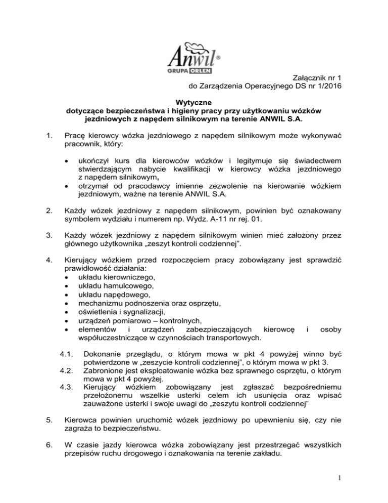 Załącznik nr 1 do Zarządzenia Operacyjnego DS nr 1/2016 Wytyczne dotyczące bezpieczeństwa i higieny pracy przy użytkowaniu wózków jezdniowych z napędem silnikowym na terenie ANWIL S.A. 1. Pracę kierowcy wózka jezdniowego z napędem silnikowym może wykonywać pracownik, który: ukończył kurs dla kierowców wózków i legitymuje się świadectwem stwierdzającym nabycie kwalifikacji w kierowcy wózka jezdniowego z napędem silnikowym, otrzymał od pracodawcy imienne zezwolenie na kierowanie wózkiem jezdniowym, ważne na terenie ANWIL S.A. 2. Każdy wózek jezdniowy z napędem silnikowym, powinien być oznakowany symbolem wydziału i numerem np. Wydz. A-11 nr rej. 01. 3. Każdy wózek jezdniowy z napędem silnikowym winien mieć założony przez głównego użytkownika „zeszyt kontroli codziennej”. 4. Kierujący wózkiem przed rozpoczęciem pracy zobowiązany jest sprawdzić prawidłowość działania: układu kierowniczego, układu hamulcowego, układu napędowego, mechanizmu podnoszenia oraz osprzętu, oświetlenia i sygnalizacji, urządzeń pomiarowo – kontrolnych, elementów i urządzeń zabezpieczających kierowcę i osoby współuczestniczące w czynnościach transportowych. 4.1. 4.2. 4.3. Dokonanie przeglądu, o którym mowa w pkt 4 powyżej winno być potwierdzone w „zeszycie kontroli codziennej”, o którym mowa w pkt 3. Zabronione jest eksploatowanie wózka bez sprawnego osprzętu, o którym mowa w pkt 4 powyżej. Kierujący wózkiem zobowiązany jest zgłaszać bezpośredniemu przełożonemu wszelkie usterki celem ich usunięcia oraz wpisać zauważone usterki i swoje uwagi do „zeszytu kontroli codziennej” 5. Kierowca powinien uruchomić wózek jezdniowy po upewnieniu się, czy nie zagraża to bezpieczeństwu. 6. W czasie jazdy kierowca wózka zobowiązany jest przestrzegać wszystkich przepisów ruchu drogowego i oznakowania na terenie zakładu. 1 7. Kierowca powinien przestrzegać bezpiecznych metod pracy w transporcie zakładowym, a w szczególności: Zachować zawsze bezpieczną odległość podczas jazdy za innym pojazdem. 7.2 Wózek prowadzić z prędkością zapewniającą pełne bezpieczeństwo ruchu i umożliwiającą bezpieczne zatrzymanie w nagłych sytuacjach. 7.3 Podczas jazdy zawsze patrzeć w kierunku jazdy, a jeżeli widoczność jest utrudniona przez wysoki ładunek, transportować go jadąc tyłem obserwując trasę jazdy. 7.4 Ciężar ładunku dopasować każdorazowo do udźwigu wózka, jego uciągu, lub dopuszczalnej nośności. 7.5 Przewożony ładunek musi być odpowiednio ułożony, zabezpieczony przed wywróceniem się, przesunięciem, rozsypaniem lub upadkiem. 7.6 W czasie jazdy wózkiem widłowym transportowany ładunek powinien być uniesiony 15-30 cm ponad poziom posadzki, a maszt pochylony do tyłu. 7.7 Po przerwaniu pracy wózka należy opuścić widły na ziemię, zaciągnąć hamulec ręczny i wyjąć kluczyk ze stacyjki. 7.8 Przed transportem materiałów niebezpiecznych kierownik komórki organizacyjnej powinien udzielić kierowcy instruktażu o właściwych metodach pracy i postępowaniu w razie wypadku. 7.9 Przed wjazdem do wagonów kolejowych, pojazdów samochodowych kierowca wózka powinien sprawdzić czy ciężar wózka wraz z ładunkiem nie przekracza dopuszczalnego obciążenia tych środków transportu. 7.10 Ładunki wystające poza obrys wózka mogą być na nim transportowane z zachowaniem warunków określonych w przepisach prawa o ruchu drogowym. 7.1 8. Pracownicy współuczestniczący w czynnościach transportowych przy użyciu wózka powinni przestrzegać zasad bezpiecznej pracy oraz stosować się do wskazówek kierowcy lub osób nadzorujących prace transportowe. 9. W strefach, w których może wystąpić zagrożenie wybuchem lub pożarem mogą być użytkowane jedynie wózki dostosowane przez producenta do pracy w tych warunkach. Wózki te powinny być odpowiednio oznakowane, a po każdej naprawie poddane badaniom w celu stwierdzenia czy zostały zachowane wymagania specjalnego dostosowania do pracy w strefach zagrożonych pożarem lub wybuchem. 10. W pomieszczeniach pracy dopuszczalne jest użytkowanie wózków z silnikiem spalinowym pod warunkiem, ze substancje szkodliwe wydalane z silnika i hałas związany z jego pracą nie powodują przekroczenia wartości najwyższych dopuszczalnych stężeń i natężeń czynników szkodliwych dla zdrowia. 11. Maksymalna dopuszczalna prędkość wózków w halach wynosi 10 km/h z zastrzeżeniem, iż w uzasadnionych przypadkach, podyktowanych bezpieczeństwem pracy, Dyrektor Obszaru może obniżyć okresowo lub na stałe maksymalną dopuszczalną prędkość wózków do 5 km/h. 2 12. Obniżenie prędkości, o którym mowa w pkt 11 powyżej, może nastąpić jedynie na podstawie pisemnego komunikatu Dyrektora Obszaru. O przedmiotowej decyzji Dyrektora Obszaru winni zostać poinformowani wszyscy pracownicy komórki organizacyjnej użytkujący wózki jezdniowe z napędem silnikowym, potwierdzając pisemnie fakt zapoznania się z treścią Komunikatu. 13. Niedopuszczalne jest: przewożenie ładunków niedostosowanych do wymiarów platformy ładunkowej wózka, używanie wózków w miejscach o nawierzchni i jej nachyleniu nieodpowiadającym warunkom określonym w dokumentacji technicznoruchowej wózka. używanie wózków w miejscach o niesprawdzonej wytrzymałości podłoża lub o wytrzymałości mniejszej niż wymagana dla obciążonego wózka, używanie wózków w miejscach nieoświetlonych, chyba że wózek wyposażony jest w światła odpowiednie do rodzaju i miejsca wykonywanej pracy, obciążenie wózka ponad jego dopuszczalną ładowność, używanie wózków do pchania innych pojazdów lub do ciągnięcia wózków doczepnych jeżeli ich liczba lub masa ładunku przekraczają dopuszczalne wielkości określone przez producenta, używanie wózków w warunkach niestabilnego lub śliskiego podłoża uniemożliwiającego bezpieczne manewrowanie transportowanym ładu