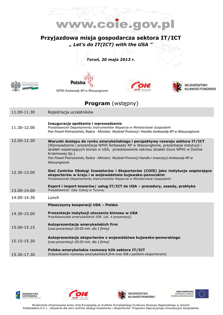 Przyjazdowa misja gospodarcza sektora IT/ICT „ Let’s do IT(ICT) with the USA ” Toruń, 20 maja 2013 r. WPHI Ambasady RP w Waszyngtonie Program (wstępny) 11.00-11.30 Rejestracja uczestników Inauguracja spotkania i wprowadzenie 11.30-12.00 Przedstawiciel Departamentu Instrumentów Wsparcia w Ministerstwie Gospodarki Pan Paweł Pietrasieński, Radca - Minister, Wydział Promocji i Handlu Ambasady RP w Waszyngtonie 12.00-12.30 Warunki dostępu do rynku amerykańskiego i perspektywy rozwoju sektora IT/ICT (Wprowadzenie i prezentacja WPHI Ambasady RP w Waszyngtonie, prezentacja instytucji i działań wspierających biznes w USA, przedstawienie zakresu działań biura WPHI w Dolinie Krzemowej itp.) Pan Paweł Pietrasieński, Radca - Minister, Wydział Promocji Handlu i Inwestycji Ambasady RP w Waszyngtonie 12.30-13.00 Sieć Centrów Obsługi Inwestorów i Eksporterów (COIE) jako instytucja wspierająca eksporterów w kraju i w województwie kujawsko-pomorskim Przedstawiciel Departamentu Instrumentów Wsparcia w Ministerstwie Gospodarki Export i import towarów/ usług IT/ICT do USA – procedury, zasady, praktyka 13.00-14.00 Przedstawiciel Izby Celnej w Toruniu 14.00-14.30 Lunch Płaszczyzny kooperacji USA – Polska 14.30-15.00 15.00-15.15 Prezentacje instytucji otoczenia biznesu w USA Przedstawiciele amerykańskich IOB (ok. 4 prezentacji) Autoprezentacje amerykańskich firm (czas prezentacji: 03-05 min. dla 1 firmy) Autoprezentacje eksporterów z województwa kujawsko-pomorskiego 15.15-15.30 (czas prezentacji: 03-05 min. dla 1 firmy) Polsko-amerykańskie rozmowy b2b sektora IT/ICT 15.30-17.30 (indywidualne rozmowy amerykańskich firm oraz IOB z polskimi eksporterami) Wydarzenie sfinansowane przez Unię Europejską ze środków Europejskiego Funduszu Rozwoju Regionalnego w ramach Poddziałania 6.2.1. „Wsparcie dla sieci centrów obsługi inwestorów i eksporterów” Programu Operacyjnego Innowacyjna Gospodarka