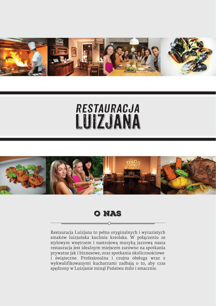 restauracja luizjana o nas Restauracja Luizjana to pełna oryginalnych i wyrazistych smaków luizjańska kuchnia kreolska. W połączeniu ze stylowym wnętrzem i nastrojową muzyką jazzową nasza restauracja jest idealnym miejscem zarówno na spotkania prywatne jak i biznesowe, oraz spotkania okolicznościowe i świąteczne. Profesjonalna i czujna obsługa wraz z wykwalifikowanymi kucharzami zadbają o to, aby czas spędzony w Luizjanie minął Państwu miło i smacznie. restauracja luizjana O N o 1 QLTY RI GIN S A L TA TE Kuchnia kreolska Luizjańska kuchnia kreolska łączy w sobie najlepsze aspekty kuchni francuskiej, włoskiej, karaibskiej, afrykańskiej oraz kuchni południa Stanów Zjednoczonych. Menu Luizjany powstaje pod okiem doświadczonego Szefa Kuchni, który tajników swojego fachu uczył się w Nowym Orleanie. Do wielu potraw używamy charakterystycznej, bardzo aromatycznej przyprawy blackening przygotowywanej przez nas na miejscu z 10 różnych ziół. Wykorzystujemy najwyższej jakości, starannie wyselekcjonowane produkty, które pochodzą od sprawdzonych i zaufanych dostawców. “Steki palce lizać :)” 21 wrzesienia 2016 Naprawdę pyszne steki - sezonowany antrykot i filet mignon na gorącym kamieniu (można samemu decydować o stopniu wysmażenia). Do tego prawdziwe frytki - świeże i grube, z ziemniaków, a nie z mrożonego proszku i porządny zestaw warzyw z grilla. Fajne piwa i wino domu. Bardzo mila i profesjonalna obsługa! Chętnie zajrzymy ponownie podczas kolejnej wizyty w Toruniu. Polecam! “Inna historia” Bell_Kama 6 wrzesienia 2016 Restauracja prowadzona z pasją, każdy posiłek przedstawia inną historię - ale zawsze pełną aromatów i niezapomnianych smaków. Miła obsługa, ciekawa lokalizacja. Sebastian P “Gorąco polecam” 7 października 2016 Rewelacyjna restauracja z prawdziwą kuchnią rodem z Luizjany.Jestem zachwycony odwzorowaniem smaków, które poznałem w Nowym Orleanie. Klimat, świetna, znająca się na rzeczy obsługa i przede wszystkim prawdziwa uczta dla kubków smakowych. Agrail jakość i pasja Jakość naszych potraw zyskała już uznanie wielu gości, czego dowodem jest pozycja Luizjany w rankingu najbardziej popularnego w Polsce i na świecie internetowego portalu gastronomicznego “TripAdvisor”. Luizjanę tworzymy z wyjątkową pasją i zaangażowaniem, o czym chcielibyśmy Państwa przekonać. restauracja luizjana O N o 1 QLTY RI GIN S A L TA TE Kierujemy do Państwa naszą ofertę w której chcemy zachęcić Państwa do wyboru naszej restauracji jako miejsce spotkania firmowego, na którym podejmą Państwo gości biznesowych swojej firmy lub spotkają się Państwo w gronie swoich współpracowników. Doświadczenie jakie zebraliśmy podczas 4 lat działalności pozwoli nam w profesjonalny, ciepły i przede wszystkim smaczny sposób Państwa ugościć. Pozytywny klimat jaki panuje w Luizjanie jak i potrawy naszej kuchni zapewnią relaks i niezapomniane wspomnienia kulinare. Nasza obsłuaga posługuje się biegle jezykami obcymi co w razie potrzeby jest atutem udanego wieczoru. Na kolejnych stronach umieściliśmy trzy przykładowe zestawy menu. Na Państwa życzenie możemy również przygotować specjalną kartę dań odpowiadającą Państwa potrzebom. Posiadamy duży wybór znakomitych win, regionalne i rzemieślnicze piwa oraz mocne alkohole (amerykańskie burbony, szkockie whisky blended i single malt oraz wódkę). Serdecznie zapraszamy. Menu luizjana classics Zupy Przekąski KRĄŻKI CEBULOWE Osiem chrupiących krążków cebulowych serwowanych z autorskim sosem Lafayette KREM POMIDOROWY Z BAZYLIĄ Aksamitny krem z pomidorów i świeżej bazylii KREOLSKA BRUSCHETTA Dwie grzanki z lekko pikantną kreolską pastą z krewetek, pikli i parmezanu, zapiekane w piekarniku CHOWDER Klasyczna lekko pikantna, kremowa zupa z Nowego Orleanu z dodatkiem kukurydzy, selera naciowego i bekonu SKRZYDEŁKA BUFFALO Sześć soczystych skrzydełek z kurczaka w pikantnym sosie Buffalo, podanych z dipem z sera blue Dania Główne KURCZAK PO KARAIBSKU Grillowana pierś z kurczaka w egzotycznym połączeniu pikantnych przypraw i słodkiego kokosa, serwowana z ryżem i warzywami INDYK PO KREOLSKU Podudzie indycze pieczone w stylu confit, zapiekane w indiańskiej marynacie, podane z pieczonymi ziemniakami z rozmarynem oraz kreolską sałatką z sosem winegret ŻEBERKA BBQ Solidna porcja zapiekanych żeberek w naszym sosie barbecue, z krążkami cebulowymi i frytkami stekowymi ŁOSOŚ W STYLU BLACKENED Wyjątkowo delikatny łosoś w przyprawie kreolskiej z puree ziemniaczanym, roszponką, rzodkiewką i sosem Chimichurri POLICZKI WOŁOWE Delikatne mięso z policzków wołowych ze świeżą kolendrą, podane z truflowym puree ziemniaczanym i rukolą Deser CHEESECAKE Oryginalny amerykański sernik na kruchym pralinowym spodzie, podany z sosem malinowym PANNA COTTA Delikatna panna cotta o smaku białej czekolady na chrupiącej pralinie polana sosem malinowym menu kreolskie smaki Zupy Przekąski KREM POMIDOROWY Z BAZYLIĄ Aksamitny krem z pomidorów i świeżej bazylii SKRZYDEŁKA BUFFALO Sześć soczystych skrzydełek z kurczaka w pikantnym sosie Buffalo, podanych z dipem z sera blue CHOWDER Klasyczna lekko pikantna, kremowa zupa z Nowego Orleanu z dodatkiem kukurydzy, selera naciowego i bekonu KREWETKI VOODOO Cztery krewetki zawijane w paski wędzonego bekonu, grillowane w przyprawie kreolskiej GUMBO Tradycyjna pikantna cajuńska zupa z okrą podana z mięsem z kaczego udka pieczonego w stylu confit POLĘDWICZKI TCHOUPITOULAS Trzy kawałki polędwicy wołowej w pikantnej indiańskiej marynacie, grillowane na patyku, podane z grzankami z masłem truflowym Dania Główne JAMBALAYA Z KURCZAKIEM LUB KREWETKAMI Tradycyjny ryż nowoorleański z warzywami, podany ze smażonym kurczakiem lub krewetkami, pikantną kiełbasą chorizo oraz sałatką z roszponki i pomarańczy INDYK PO KREOLSKU Podudzie indycze pieczone w stylu confit, zapiekane w ind