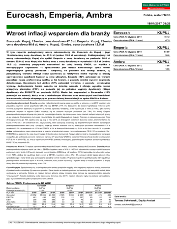 Eurocash, Emperia, Ambra Wzrost inflacji wsparciem dla branży Eurocash: Kupuj, 12-mies. cena docelowa 47.5 zł, Emperia: Kupuj, 12-mies. cena docelowa 96.6 zł, Ambra: Kupuj, 12-mies. cena docelowa 12.5 zł W tym raporcie podwyższamy naszą rekomendację dla Eurocash do Kupuj i jego 12-miesięczną cenę docelową do 47.5 zł (wobec 39.8 zł wcześniej). Podtrzymujemy też naszą rekomendację Kupuj dla spółki Emperia z ceną docelową na poziomie 96.6 zł (wobec 92.0 zł) oraz Kupuj dla Ambry wraz z ceną docelową w wysokości 12.5 zł (wobec 11.9 zł). Jesteśmy następujących najsilniejszych pozytywnie czynników: graczy 1) nastawieni spodziewana (Eurocash i do jest Emperia), całej co branży dalsza FMCG, konsolidacja powinno dać co branży wynika rynku z wokół oddech, 2) perspektywy wzrostu inflacji (ceny żywności) 3) relatywnie niskie wyceny w branży Polska, sektor FMCG 18/01/2017 08:26 Eurocash Cena (PLN, 13 stycznia 2017) Cena docelowa (PLN, 12-msc) Emperia Cena (PLN, 13 stycznia 2017) Cena docelowa (PLN, 12-msc) Ambra Cena (PLN, 13 stycznia 2017) Cena docelowa (PLN, 12-msc) spowodowane spadkami kursów w roku ubiegłym. Emperia (43% potencjał na wzrost) pozostaje naszą preferowaną spółką w tej branży, z powodu niskiej wyceny segmentu detalicznego. Doceniamy też Ambrę (57% potencjał wzrostu), z powodu atrakcyjnej wyceny. Jednocześnie Ambra wróciła na ścieżkę wzrostu i oferuje wysokie wolne przepływy pieniężne (FCF), co pozwala jej na pokaźne wypłaty dywidendy (Stopa dywidendy dla 2016/17E na poziomie 6.6%). Warto też wspomnieć o Eurocashu (18% potencjał na wzrost), który wraz z oddłużonym bilansem oraz znaczącymi możliwościami lewarowania, oferuje ekspozycję na proces dalszej konsolidacji na rynku FMCG w Polsce. Aktualizacja rekomendacji. Emperia pozostaje najbardziej preferowaną przez nas spółką w sektorze, a rok 2017 powinien w jej przypadku przynieść wzrost przychodów (8% r/r) oraz EBITDA (11% r/r). Szacujemy, że obecna kapitalizacja rynkowa spółki wycenia jej segment detaliczny na poziomie 2.1x/mies. sprzedaż. Uważamy, że ta wycena jest o wiele za niska, gdyż wyceny podobnych aktywów w regionie EMEA kształtują się na znacznie wyższych poziomach (ok. 7.9x). Co więcej, Emperia prawdopodobnie odegra aktywną rolę, jako siła konsolidująca branżę. Jej niska wycena może również zachęcić większych graczy do jej przejęcia. Podwyższamy też naszą rekomendację dla spółki Eurocash do Kupuj z Trzymaj, co spowodowane jest 1) jej atrakcyjną wyceną po 19% spadku ceny jej akcji w roku 2016, 2) atrakcyjnym poziomem dyskonta wobec Jeronimo Martins na bazie 2Y PE fwd. i 2Y EV/EBITDA fwd., czyli poziomy, które zazwyczaj okazywały się długoterminowym dołkiem, 3) rosnącym prawdopodobieństwem M&A (fuzji i przejęcia) dzięki jej silnemu bilansowi oraz 4) atrakcyjnym poziomem rentowności FCF w wysokości 5.2%, w porównaniu do 1.9% w CEEMEA, 4.0% w Ameryce Południowej czy 2.0% w Azji (bez Japonii). W przypadku Ambry podtrzymujemy naszą rekomendację z powodu jej atrakcyjnej wyceny i znormalizowanego PE16/17E na poziomie 10x i EV/EBITDA na poziomie 5x, oraz dwucyfrowego dyskonta wobec konkurencji. Naszym zdaniem jest to nieuzasadnione biorąc pod uwagę fakt, że spółka jest ponownie na ścieżce wzrostu (3Y przychody CAGR na poziomie 6%) oraz oferuje trwale wysoki poziom FCF (5.4% w 2016/17E), co, wraz z ograniczonym CAPEX (nakłady inwestcyjne), pozwala spółce wypłacać pokaźne dywidendy z DY16/17E na poziomie 6.6%. Prognozy na 4 kw.16. To będzie zapewne dobry okres dla Emperii i Ambry, choć trochę słabszy dla Eurocashu. Emperia pokaże prawdopodobnie najlepsze wyniki za 4 kw. z EBITDA i zyskiem netto o 30% r/r i 40% r/r odpowiednio wyższym dzięki lepszemu poziomowi marży brutto (+20 punkty bazowe), kontroli kosztów (SG&A/avg. m2 spadek o 1.5%) i sprzedaży nieruchomości (wpływ 3 mln PLN). Ambra też opublikuje dobre wyniki z EBTIDA i zyskiem netto o 8% i 5% wyższym dzięki lepszej jakości miksu sprzedażowego i marży brutto przy jednoczesnej ostrożnej kontroli kosztów. Po przeciwnej stronie jest Eurocash, który opublikuje prawdopodobne nieciekawe wyniki w 4 kw.16, osłabiane przez poziom sprzedaży i wysokie straty z nowych projektów. Z drugiej strony 4 kw.16 powinien być wspierany przez OCF. Czynniki ryzyka. Spodziewamy się, że dwie potencjalne zmiany przepisów mogłyby mieć negatywny wpływ na branżę, mianowicie (1) zakaz handlu w niedzielę (2) oraz nowy podatek. Zakaz handlu w niedzielę powinien być neutralny dla wszystkich spółek, które analizujemy w tej branży. Dotknie on, naszym daniem, głównie sklepy mniejsze, które cechują się największą ilością zakupów “impulsywnych”. Podatek detaliczny został zawieszony do końca roku 2017 i, naszym zdaniem, nigdy nie zostanie wprowadzony, gdyż wyraźnie łamie wszystkie przepisy UE w tym zakresie. Sektor FMCG: Podsumowanie BZ WBK Rekomendacja Potencjał wzrostu (%) PLN mln Sprzedaż EBITDA EBIT Zysk netto C/Z (x) EV/EBITDA (x) 2016P 20 952 461 295 199 28.2 12.1 Eurocash KUPUJ +18% 2017P 23 004 490 308 220 25.6 11.3 Źródło: Dane spółki, szacunki DM BZ WBK 2018P 23 896 595 396 289 19.4 8.8 2016P 2 505 100 57 43 19.6 6.9 Emperia KUPUJ +43% 2017P 2 698 111 -183 48 17.4 7.9 2018P 2 968 120 75 52 16.1 6.8 2016/17P 449 49 36 20 10.0 4.9 Ambra KUPUJ +57% 2017/18P 473 52 39 22 9.3 4.6 2018/19P 499 53 40 23 8.9 4.5 Dział analiz: Tomasz Sokołowski, Equity Analyst [email protected] ZASTRZEŻENIE: Oświadczenia zamieszczone na ostatniej stronie niniejszego dokumentu stanowią jego integralną część. KUPUJ 40.42 47.5 KUPUJ 67.50 96.6 KUPUJ 7.96 12.5 FMCG 18 stycznia 2017 Wycena EUROCASH Fig. 1. Eurocash: Zmiany prognoz 2016–18P PLN mln 2016P 2017P nowa stara %zm nowa stara Sprzedaż 20 952 20 590 2% 23 004 21 378 EBITDA 461 490 528 -13% 572 EBIT 295 308 372 -21% 401 Zysk netto 199 220 266 -25% 271 Źródło: Dane