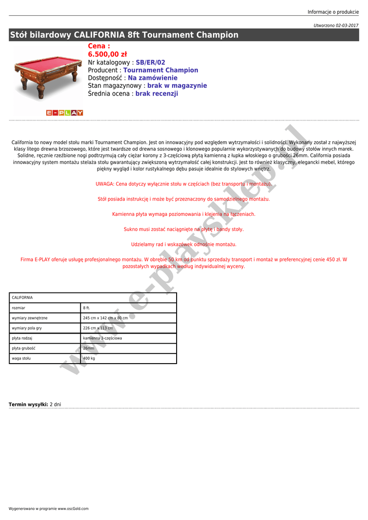 Informacje o produkcie Utworzono 02-03-2017 Stół bilardowy CALIFORNIA 8ft Tournament Champion Cena : 6.500,00 zł Nr katalogowy : SB/ER/02 Producent : Tournament Champion Dostępność : Na zamówienie Stan magazynowy : brak w magazynie Średnia ocena : brak recenzji p. pl California to nowy model stołu marki Tournament Champion. Jest on innowacyjny pod względem wytrzymałości i solidności. Wykonany został z najwyższej klasy litego drewna brzozowego, które jest twardsze od drewna sosnowego i klonowego popularnie wykorzystywanych do budowy stołów innych marek. Solidne, ręcznie rzeźbione nogi podtrzymują cały ciężar korony z 3-częściową płytą kamienną z łupka włoskiego o grubości 26mm. California posiada innowacyjny system montażu stelaża stołu gwarantujący zwiększoną wytrzymałość całej konstrukcji. Jest to również klasyczny, elegancki mebel, którego piękny wygląd i kolor rustykalnego dębu pasuje idealnie do stylowych wnętrz. ay sk le UWAGA: Cena dotyczy wyłącznie stołu w częściach (bez transportu i montażu). Stół posiada instrukcję i może być przeznaczony do samodzielnego montażu. Kamienna płyta wymaga poziomowania i klejenia na łączeniach. Sukno musi zostać naciągnięte na płytę i bandy stoły. Udzielamy rad i wskazówek odnośnie montażu. CALIFORNIA .e - pl Firma E-PLAY oferuje usługę profesjonalnego montażu. W obrębie 50 km od punktu sprzedaży transport i montaż w preferencyjnej cenie 450 zł. W pozostałych wypadkach według indywidualnej wyceny. 8 ft. wymiary zewnętrzne 245 cm x 142 cm x 80 cm w rozmiar wymiary pola gry 226 cm x 113 cm waga stołu 26mm w płyta grubość kamienna 3-częściowa w płyta rodzaj 400 kg Termin wysyłki: 2 dni Wygenerowano w programie www.oscGold.com