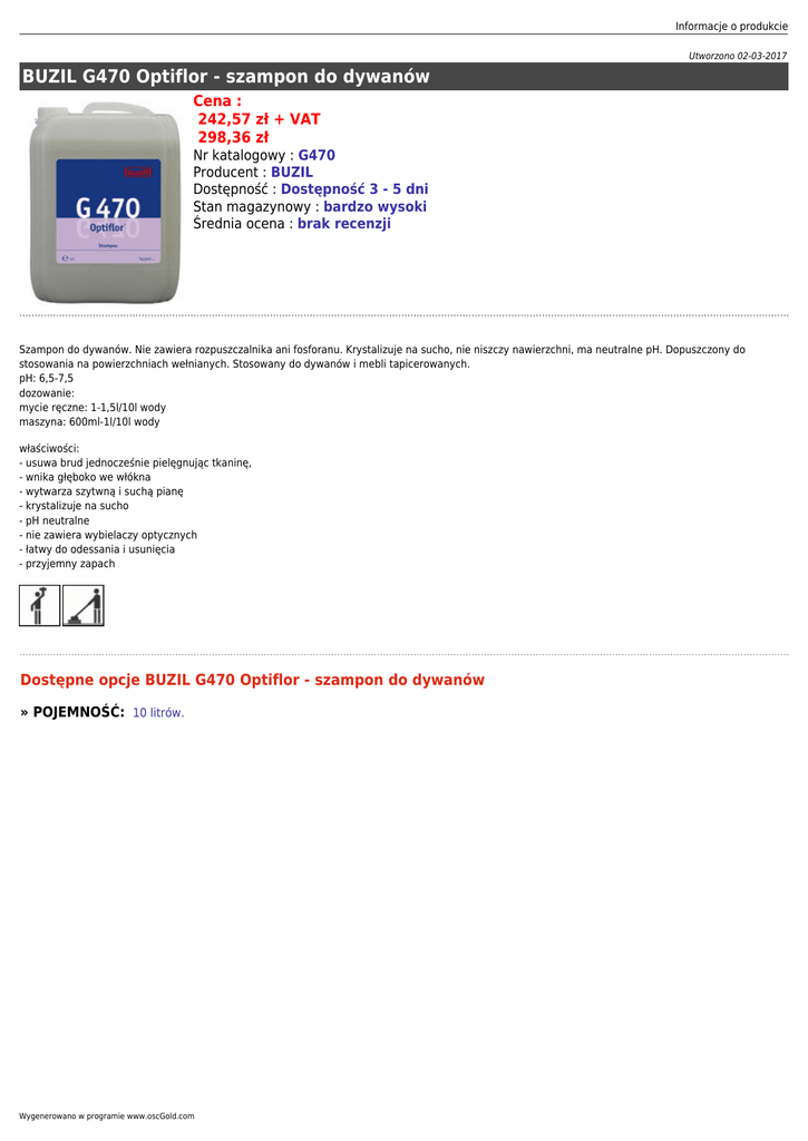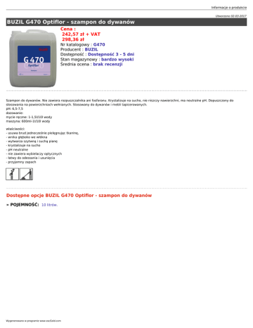 Informacje o produkcie Utworzono 02-03-2017 BUZIL G470 Optiflor - szampon do dywanów Cena : 242,57 zł + VAT 298,36 zł Nr katalogowy : G470 Producent : BUZIL Dostępność : Dostępność 3 - 5 dni Stan magazynowy : bardzo wysoki Średnia ocena : brak recenzji Szampon do dywanów. Nie zawiera rozpuszczalnika ani fosforanu. Krystalizuje na sucho, nie niszczy nawierzchni, ma neutralne pH. Dopuszczony do stosowania na powierzchniach wełnianych. Stosowany do dywanów i mebli tapicerowanych. pH: 6,5-7,5 dozowanie: mycie ręczne: 1-1,5l/10l wody maszyna: 600ml-1l/10l wody właściwości: - usuwa brud jednocześnie pielęgnując tkaninę, - wnika głęboko we włókna - wytwarza szytwną i suchą pianę - krystalizuje na sucho - pH neutralne - nie zawiera wybielaczy optycznych - łatwy do odessania i usunięcia - przyjemny zapach Dostępne opcje BUZIL G470 Optiflor - szampon do dywanów » POJEMNOŚĆ: 10 litrów. Wygenerowano w programie www.oscGold.com