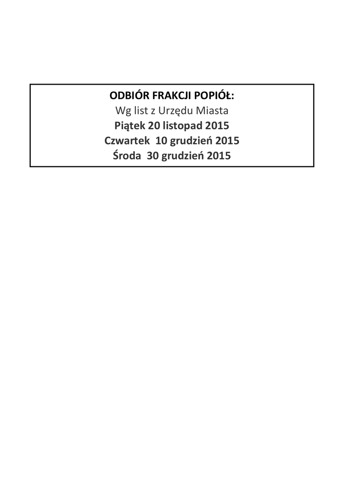 ODBIÓR FRAKCJI POPIÓŁ: Wg list z Urzędu Miasta Piątek 20 listopad 2015 Czwartek 10 grudzień 2015 Środa 30 grudzień 2015