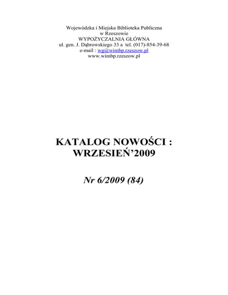 Wojewódzka i Miejska Biblioteka Publiczna w Rzeszowie WYPOŻYCZALNIA GŁÓWNA ul. gen. J. Dąbrowskiego 33 a tel. (017)-854-39-68 e-mail : [email protected] www.wimbp.rzeszow.pl KATALOG NOWOŚCI : WRZESIEŃ’2009 Nr 6/2009 (84) Data opracowania : 17 października 2009 r. Opracował : Józef Dzień Wypożyczalnia Główna przedstawia kolejny katalog nowości zawierający informację o nowych książkach włączanych do zbiorów bibliotecznych. Informacja ta dotyczy uzupełniania księgozbioru we wrześniu 2009. Obok opisów bibliograficznych dodatkowo zamieszczono w nim hasła przedmiotowe, które mają przybliżyć tematykę książek. Katalog składa się z trzech części, które są uporządkowane alfabetycznie. Pierwsza dotyczy literatury pięknej i zamieszczono tutaj także krótkie streszczenia powieści. Druga obejmuje książki popularnonaukowe, a zamieszczony na końcu tej części indeks ma ułatwić poszukiwanie książek z określonej dziedziny wiedzy czy tematyki (numery obok haseł odsyłają do konkretnej pozycji części drugiej Katalogu Nowości). Trzecia zaś to dokumenty elektroniczne włączone do zbiorów Wypożyczalni. Część ta zawiera także indeks haseł przedmiotowych dotyczący tych dokumentów. W obydwu częściach zaprezentowano pełny opis katalogowy książek wraz z hasłami przedmiotowymi. Wydawnictwo sporządzono w oparciu o „System informatycznej obsługi biblioteki Sokrates-SOWA”, wykorzystując bazę danych o zbiorach Wypożyczalni Głównej. Katalog Wypożyczalni Głównej można przeglądać także w Internecie na stronie : www.wimbp.rzeszow.pl > katalogi.online gdzie zawarta jest również informacja o nowościach książkowych wpływający do tut. Biblioteki. Nowości Wypożyczalni Głównej : Wrzesień‘2009 Część I Literatura piękna /poz. 1- 49/ 1. Białoszewski, Miron (1922-1983) Chamowo / Miron Białoszewski. - Warszawa : PIW, 2009. - 387, [1] s. ; 21 cm. (Utwory Zebrane / Miron Białoszewski ; 11) Hasło przedmiotowe: Białoszewski, Miron (1922-1983) - w literaturze polskiej ; Powieść polska - 20 w ; Powieść obyczajowa polska Nowości: 2009-09 Sygnatura: 85766 Prozatorskie zapiski Mirona Białoszewskiego pochodzą z okresu od czerwca 1975 roku do czerwca roku 1976. Obszerne fragmenty tej prozy miały być początkowo opublikowane w tomie "Rozkurz". Książka ta jednak w efekcie została rozbudowana o inne części składowe, część zatytułowana "Chamowo" stała się jedynie esencjonalną pigułką, zwięzłym wyciągiem z owych dziennikowych zapisów. Całość pozostała w wydawnictwie, "do druku po śmierci", jak mówił autor. 2. Bohjalian, Christopher A Bez wyjścia / Chris Bohjalian ; z jęz. ang. przeł. Marek Fedyszak. - Katowice : Sonia Draga, 2009. - 310 s. : fot. ; 21 cm. Hasło przedmiotowe: Powieść amerykańska - 21 w ; Powieść kryminalna amerykańska Nowości: 2009-09 Sygnatura: 85748 Laurel Estabrook pada ofiarą brutalnej napaści. Niegdyś towarzyska dziewczyna zamyka się w sobie, od tej pory poświęcając się głównie swej fotograficznej pasji. Podejmuje też pracę w przytułku dla bezdomnych, gdzie poznaje Bobbiego Crockera, od dawna chorującego psychicznie mężczyznę z pudłem fotografii, których nie pozwala nikomu obejrzeć. Gdy Bobbie nagle umiera, Laurel odkrywa, że zanim stracił dach nad głową, był wziętym fotografem, który pracował z tak legendarnymi postaciami, jak Chuck Berry, Robert Frost i Eartha Kitt. Zauważa, że niektóre z jego zdjęć ujawniają głęboko ukryty, mroczny sekret rodzinny. Poszukiwanie prawdy jeszcze bardziej oddala Laurel od dawnego życia, staje sie też początkiem niebezpiecznej zabawy w kotka i myszkę z prześladowcami, którzy twierdzą, że pragną ją uratować. 3. Brown, Sandra (1948- ) Czekając na miłość / Sandra Brown ; przeł. z ang. Anna Pajek. - Katowice : Książnica, 2009. - 199, [1] s. ; 20 cm. Hasło przedmiotowe: Powieść amerykańska - 20 w ; Powieść obyczajowa amerykańska Nowości: 2009-09 Sygnatura: 85795 W życiu Marnie Hibbs, samotnie wychowującej dorastającego syna, pojawia się Law Kincaid, niezwykle popularny, zabójczo przystojny astronauta. Mężczyzna szuka autora anonimów, który twierdzi, że Law ma syna. Trop prowadzi do Marnie, ale ta wszystkiemu zaprzecza. Kiedy napięcie między nimi staje się nie do zniesienia, a wzajemne przyciąganie niezaprzeczalne, kobieta jest zmuszona do wyjawienia sekretu, co może spowodować, że straci dziecko, które kocha ponad wszystko, i mężczyznę, którego pożąda jak nikogo wcześniej. 4. Byrd, Nicole Królowa skandalu / Nicole Byrd ; przekł. Agnieszka Dębska. - Warszawa : Amber, 2009. - 270, [1] s. ; 21 cm. (Romans Historyczny) Hasło przedmiotowe: Powieść amerykańska - 21 w ; Powieść obyczajowa amerykańska Nowości: 2009-06 ; 2009-09 Sygnatura: 85581, 85749 Ofelia wie, że panny z dobrych domów nie zostają aktorkami. Ale od każdej reguły są wyjątki, a ona przecież ma talent! Dlatego razem z siostrą ucieka z domu i wyrusza na podbój londyńskich scen. Jednak młode damy szybko przekonują się, że stolica kryje wiele niebezpieczeństw. I że będą potrzebowały pomocy tajemniczego i przystojnego dżentelmena, by uchronić się przed niebotycznym skandalem. 5. Canavan, Trudi Gildia Magów / Trudi Canavan ; przeł. Agnieszka Fulińska. - Kraków : Galeria Książki, 2007. - 517, [3] s. ; 20 cm. (Trylogia Czarnego Maga / Trudi Canavan ; ks. 1) Hasło przedmiotowe: Powieść australijska - 21 w ; Powieść fantastyczna australijska Cykl: Trylogia Czarnego Maga ; 1 Nowości: 2008-12 ; 2009-09 Sygnatura: 84992, 85774, 85775 Co roku magowie z Imardin gromadzą się, by oczyścić ulice z włóczęgów, uliczników i żebraków. Mistrzowie magicznych dyscyplin są przekonani, że nikt nie zdoła im się przeciwstawić, ich tarcza ochronna nie jest jednak tak nieprzenikniona jak im się wydaje. Kiedy bowiem tłum bezdomnych opuszcza miasto, młoda dziewczyna,