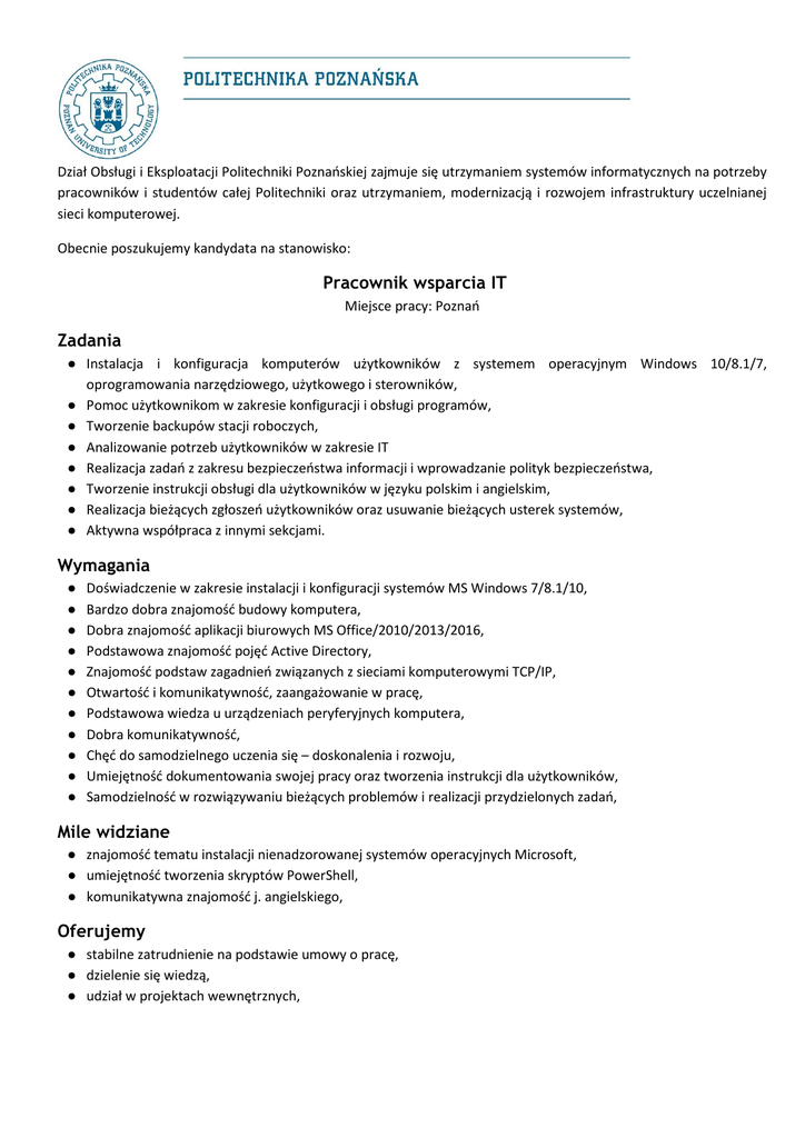 Dział Obsługi i Eksploatacji Politechniki Poznańskiej zajmuje się utrzymaniem systemów informatycznych na potrzeby pracowników i studentów całej Politechniki oraz utrzymaniem, modernizacją i rozwojem infrastruktury uczelnianej sieci komputerowej. Obecnie poszukujemy kandydata na stanowisko: Pracownik wsparcia IT Miejsce pracy: Poznań Zadania ● Instalacja i konfiguracja komputerów użytkowników z systemem operacyjnym Windows 10/8.1/7, oprogramowania narzędziowego, użytkowego i sterowników, ● Pomoc użytkownikom w zakresie konfiguracji i obsługi programów, ● Tworzenie backupów stacji roboczych, ● Analizowanie potrzeb użytkowników w zakresie IT ● Realizacja zadań z zakresu bezpieczeństwa informacji i wprowadzanie polityk bezpieczeństwa, ● Tworzenie instrukcji obsługi dla użytkowników w języku polskim i angielskim, ● Realizacja bieżących zgłoszeń użytkowników oraz usuwanie bieżących usterek systemów, ● Aktywna współpraca z innymi sekcjami. Wymagania ● ● ● ● ● ● ● ● ● ● ● Doświadczenie w zakresie instalacji i konfiguracji systemów MS Windows 7/8.1/10, Bardzo dobra znajomość budowy komputera, Dobra znajomość aplikacji biurowych MS Office/2010/2013/2016, Podstawowa znajomość pojęć Active Directory, Znajomość podstaw zagadnień związanych z sieciami komputerowymi TCP/IP, Otwartość i komunikatywność, zaangażowanie w pracę, Podstawowa wiedza u urządzeniach peryferyjnych komputera, Dobra komunikatywność, Chęć do samodzielnego uczenia się – doskonalenia i rozwoju, Umiejętność dokumentowania swojej pracy oraz tworzenia instrukcji dla użytkowników, Samodzielność w rozwiązywaniu bieżących problemów i realizacji przydzielonych zadań, Mile widziane ● znajomość tematu instalacji nienadzorowanej systemów operacyjnych Microsoft, ● umiejętność tworzenia skryptów PowerShell, ● komunikatywna znajomość j. angielskiego, Oferujemy ● stabilne zatrudnienie na podstawie umowy o pracę, ● dzielenie się wiedzą, ● udział w projektach wewnętrznych, Kandydatów zainteresowanych ofertą i spełniających przedstawione wymagania prosimy o przesyłanie dokumentów aplikacyjnych: CV ze zgodą na przetwarzanie danych osobowych w celu rekrutacji oraz list motywacyjny na adres email: [email protected] W tytule wiadomości prosimy zamieścić: „Wsparcie IT”. Zastrzegamy sobie prawo udzielenia odpowiedzi tylko wybranym kandydatom. Nadesłanych dokumentów nie zwracamy.