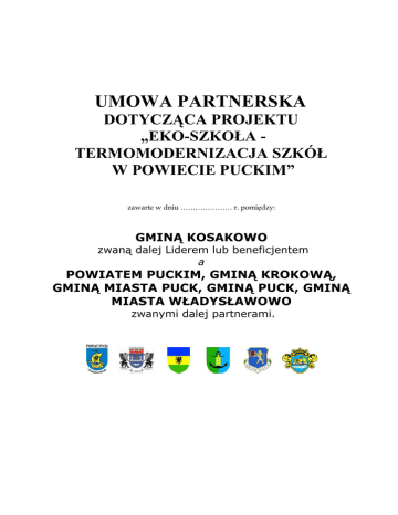 UMOWA PARTNERSKA DOTYCZĄCA PROJEKTU „EKO-SZKOŁA TERMOMODERNIZACJA SZKÓŁ W POWIECIE PUCKIM” zawarte w dniu ………………… r. pomiędzy: GMINĄ KOSAKOWO zwaną dalej Liderem lub beneficjentem a POWIATEM PUCKIM, GMINĄ KROKOWĄ, GMINĄ MIASTA PUCK, GMINĄ PUCK, GMINĄ MIASTA WŁADYSŁAWOWO zwanymi dalej partnerami. Rozdział I Cel partnerstwa §1 Przedmiotem niniejszej umowy (zwanej dalej „Umową”) jest zorganizowanie Partnerstwa w celu przygotowania i realizacji projektu o nazwie „EKO-SZKOŁA - termomodernizacja szkół w powiecie puckim” planowanego do współfinansowania w ramach Funduszy Strukturalnych Unii Europejskiej. Rozdział II Zadania i obowiązki Partnerów w związku z realizacją projektu §2 Zadania i obowiązki Gminy Kosakowo (Lidera Projektu) Gmina Kosakowo, działając jako Lider Projektu, a takŜe wykonując zadania merytoryczne w projekcie jako Partner zobowiązuje się do: a. zlecenia wykonania opracowań niezbędnych do złoŜenia projektu w ramach konkursu do współfinansowania z Funduszy Strukturalnych Unii Europejskiej w tym studium wykonalności oraz wniosku aplikacyjnego b. złoŜenia wniosku o dofinansowanie projektu, w terminie wymaganym przez instytucję wdraŜającą lub pośredniczącą. c. monitorowania oraz przestrzegania prawidłowości i terminowości realizowania projektu, d. reprezentowania Partnerstwa, w tym utrzymywanie stałych kontaktów i współpracy z instytucją wdraŜającą lub pośrednicząca. e. motywowania Partnerów do współpracy, dąŜenia do doskonalenia pracy Partnerstwa oraz wypracowania zasad dalszej, długoletniej współpracy. f. podejmowania wszelkich działań jakie wymagane są od Partnera zmierzających do realizacji projektu, w tym do realizowania postanowienia umowy o finansowanie projektu oraz właściwej sprawozdawczości, §3 Zadania i obowiązki Partnerów Projektu Partnerów zobowiązuje się do: a. wykonania i dostarczenia w określonym terminie wymaganych dla przedsięwzięcia partnera projektów budowlanych i innych opracowań oraz wszelkich pozwoleń i innych decyzji administracyjnych niezbędnych do uzyskania dofinansowania z RPO i z innych funduszy Unii Europejskiej, b. dostarczenia dokumentów niezbędnych do wykonania studium wykonalności projektu a takŜe koncepcji budowlanej, w terminie ustalonym przez wykonawcę lub lidera projektu, c. podejmowania wszelkich działań jakie wymagane są od Partnera zmierzających do realizacji projektu, w tym do realizowania postanowienia umowy o finansowanie projektu oraz właściwej sprawozdawczości d. partycypacji w kosztach przygotowania projektu zgodnie z par. 4 niniejszej umowy. e. zapewnienia wymaganego wkładu własnego do projektu (zgodnie z szacunkowymi kosztami, stanowiącymi załącznik nr 1 do niniejszej umowy). f. prowadzenia wyodrębnionej ewidencji księgowej dotyczącej realizacji projektu, zgodnie z zasadami wynikającymi z ustawy z dnia 29 września 1994r. o rachunkowości. g. prowadzenia ewidencji zdarzeń księgowych w sposób umoŜliwiający jednoznaczną identyfikację kosztów ponoszonych na realizację projektu oraz powiązanie płatności z dokonywanymi wydatkami z projektu, a takŜe identyfikację kosztów ponoszonych na realizację projektu oraz powiązanie płatności z dokonywanymi wydatkami z projektu, a takŜe identyfikację dowodów, na podstawie których dokonano płatności h. rzetelnego dokumentowania wydatków za pomocą oryginałów rachunków, faktur i innych dokumentów stanowiących podstawę dokonywanych płatności. §4 1. Partnerzy zobowiązują się do zachowania celów projektu zgodnie ze złoŜonym wnioskiem w okresie 10 lat od daty zakończenia finansowego rozliczenia projektu tzn. projekt nie zostanie poddany znacznej modyfikacji 2. Partnerzy oświadczają, Ŝe środki przekazane na podstawie niniejszej umowy zostaną wykorzystane wyłącznie na cele w niej określone 3. Odpowiedzialność wobec osób trzecich ponosi kaŜdy z partnerów w zakresie swojego działania lub zaniechania 4. Wydatki niekwalifikowane poszczególnych partnerów zostaną pokryte z ich budŜetów 5. Produkty oraz majątek uzyskany poszczególnych partnerów w ramach projektu pozostanie własnością 6. Partnerzy zgodnie oświadczają, Ŝe upowaŜnionym do podpisania umowy w ich imieniu i na ich rzecz będzie Lider Projektu 7. Lider moŜe udzielić dalszych pełnomocnictw pracownikom Urzędu Gminy Kosakowo, po uzyskaniu zgody wszystkich partnerów . Rozdział III Finansowanie przygotowania projektu §5 1. Wysokość nakładów na przygotowanie projektu wynosi łącznie 50 000,00 PLN (sześćdziesiąt tysięcy zł 00/100) złotych, w tym zryczałtowana kwota przypadająca na partnera: a. Gmina Miasto Puck – 6 000,00 zł b. Gmina Puck – 4 500,00 zł c. Gmina Krokowa – 12 000,00 zł d. Gmina Miasta Władysławowo – 5 500,00 zł e. Gmina Kosakowo – 6 000,00 zł f. Powiat Pucki – 16 000,00 zł 2. Na koszt przygotowania projektu składa się koszt opracowania studium wykonalności, koszt materiałów biurowych i materiałów promocyjnych dotyczących przygotowania projektu. 3. Partnerzy zobowiązują się przekazać Liderowi kwotę partycypacji w kosztach przygotowania projektu zgodnie z ust. 1, na podstawie Noty księgowej wystawionej przez Lidera. 4. Lider wystawi Notę księgową o której mowa w ust. 3 po wystawieniu faktur VAT przez wykonawców poszczególnych usług/dostawców związanych z przygotowaniem projektu. 5. Lider przedstawi rozliczenie z wydatkowania środków o których mowa w ust. 1 w terminie do 30 marca 2010r. 6. Strony ustalają, Ŝe środki finansowe przekazane przez Partnera na przygotowanie Projektu, jeŜeli nie zostaną w całości wykorzystane do zrealizowania i przygotowania Projektu, zostaną w niewykorzystanym zakresie zwrócone przez Partnera Wiodącego w terminie do 30 kwietnia 2010 roku. Rozdział IV Plan finansowy w podziale na partnerów oraz zasady zarządzania finansami §6 1. Wstępny pl