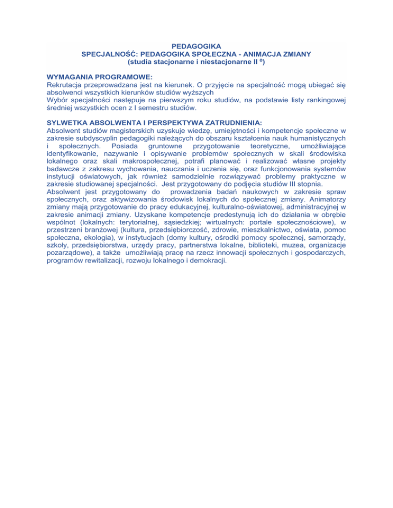 PEDAGOGIKA SPECJALNOŚĆ: PEDAGOGIKA SPOŁECZNA - ANIMACJA ZMIANY (studia stacjonarne i niestacjonarne II ⁰) WYMAGANIA PROGRAMOWE: Rekrutacja przeprowadzana jest na kierunek. O przyjęcie na specjalność mogą ubiegać się absolwenci wszystkich kierunków studiów wyższych Wybór specjalności następuje na pierwszym roku studiów, na podstawie listy rankingowej średniej wszystkich ocen z I semestru studiów. SYLWETKA ABSOLWENTA I PERSPEKTYWA ZATRUDNIENIA: Absolwent studiów magisterskich uzyskuje wiedzę, umiejętności i kompetencje społeczne w zakresie subdyscyplin pedagogiki należących do obszaru kształcenia nauk humanistycznych i społecznych. Posiada gruntowne przygotowanie teoretyczne, umożliwiające identyfikowanie, nazywanie i opisywanie problemów społecznych w skali środowiska lokalnego oraz skali makrospołecznej, potrafi planować i realizować własne projekty badawcze z zakresu wychowania, nauczania i uczenia się, oraz funkcjonowania systemów instytucji oświatowych, jak również samodzielnie rozwiązywać problemy praktyczne w zakresie studiowanej specjalności. Jest przygotowany do podjęcia studiów III stopnia. Absolwent jest przygotowany do prowadzenia badań naukowych w zakresie spraw społecznych, oraz aktywizowania środowisk lokalnych do społecznej zmiany. Animatorzy zmiany mają przygotowanie do pracy edukacyjnej, kulturalno-oświatowej, administracyjnej w zakresie animacji zmiany. Uzyskane kompetencje predestynują ich do działania w obrębie wspólnot (lokalnych: terytorialnej, sąsiedzkiej; wirtualnych: portale społecznościowe), w przestrzeni branżowej (kultura, przedsiębiorczość, zdrowie, mieszkalnictwo, oświata, pomoc społeczna, ekologia), w instytucjach (domy kultury, ośrodki pomocy społecznej, samorządy, szkoły, przedsiębiorstwa, urzędy pracy, partnerstwa lokalne, biblioteki, muzea, organizacje pozarządowe), a także umożliwiają pracę na rzecz innowacji społecznych i gospodarczych, programów rewitalizacji, rozwoju lokalnego i demokracji.
