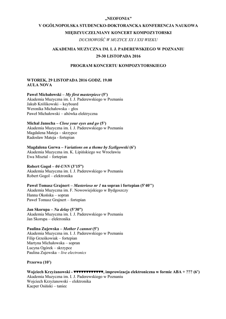 „NEOFONIA” V OGÓLNOPOLSKA STUDENCKO-DOKTORANCKA KONFERENCJA NAUKOWA MIĘDZYUCZELNIANY KONCERT KOMPOZYTORSKI DUCHOWOŚĆ W MUZYCE XX I XXI WIEKU AKADEMIA MUZYCZNA IM. I. J. PADEREWSKIEGO W POZNANIU 29-30 LISTOPADA 2016 PROGRAM KONCERTU KOMPOZYTORSKIEGO WTOREK, 29 LISTOPADA 2016 GODZ. 19.00 AULA NOVA Paweł Michałowski – My first masterpiece (5’) Akademia Muzyczna im. I. J. Paderewskiego w Poznaniu Jakub Królikowski – keyboard Weronika Michałowska – głos Paweł Michałowski – altówka elektryczna Michał Janocha – Close your eyes and go (5’) Akademia Muzyczna im. I. J. Paderewskiego w Poznaniu Magdalena Mateja – skrzypce Radosław Mateja - fortepian Magdalena Gorwa – Variations on a theme by Szeligowski (6’) Akademia Muzyczna im. K. Lipińskiego we Wrocławiu Ewa Misztal – fortepian Robert Gogol – 04-UNN (3’15”) Akademia Muzyczna im. I. J. Paderewskiego w Poznaniu Robert Gogol – elektronika Paweł Tomasz Grajnert – Masterioso nr 1 na sopran i fortepian (5’40’’) Akademia Muzyczna im. F. Nowowiejskiego w Bydgoszczy Hanna Okońska – sopran Paweł Tomasz Grajnert – fortepian Jan Skorupa – Na delay (5’30”) Akademia Muzyczna im. I. J. Paderewskiego w Poznaniu Jan Skorupa – elektronika Paulina Zujewska – Mother I cannot (5’) Akademia Muzyczna im. I. J. Paderewskiego w Poznaniu Filip Grześkowiak – fortepian Martyna Michałowska – sopran Lucyna Ogórek – skrzypce Paulina Zujewska – live electronics Przerwa (10’) Wojciech Krzyżanowski - ♥♥♥♥♥♥♥♥♥♥♥♥, improwizacja elektroniczna w formie ABA + ??? (6’) Akademia Muzyczna im. I. J. Paderewskiego w Poznaniu Wojciech Krzyżanowski – elektronika Kacper Osiński – taniec Katarzyna Danel – Bewegung na organy i dźwięki elektroniczne (4’50”) Akademia Muzyczna im. I. J. Paderewskiego w Poznaniu Katarzyna Danel – organy, elektronika Aleksandra Słyż – CBss H na kontrabas, taśmę i live electronics (6’30’’) Akademia Muzyczna im. I. J. Paderewskiego w Poznaniu Bogusz Tworek – kontrabas Dominik Puk – Gravität. Per accordion e organo (5’) Akademia Muzyczna im. I. J. Paderewskiego w Poznaniu Katarzyna Danel – organy Przemysław Degórski – akordeon Grzegorz Łapiński – Konstelacje (4’40”) Uniwersytet Muzyczny F. Chopina w Warszawie Kołsut/Brzezina Duo Łukasz Brzezina, Bartosz Kołsut – akordeon Sylwia Nowastowska – Vantablack (5’) Akademia Muzyczna im. I. J. Paderewskiego w Poznaniu Weronika Ka mierczak, leksandra Wiśniewska – flet Zuzanna Czachor - flet altowy Joanna adowska - rożek angielski Adam Knobel, Kornel Grzybowski – klarnet Borys Ka mierczak - klarnet basowy Estera Biedrzycka - saksofon altowy Ireneusz Chmielarczyk - saksofon tenorowy Samuel Kostecki, Cezary Sikora – fagot Martyna Bartczak, Joanna Mazurek – skrzypce Michalina Matias - altówka Małgorzata Namiot – wiolonczela Bogusz Tworek - kontrabas Michał Janocha - dyrygent Organizatorzy: Opieka merytoryczna: Katedra Kompozycji – dr Ewa Fabiańska-Jelińska Katedra Teorii Muzyki – mgr Małgorzata Pawłowska Patronat honorowy: JM Rektor dr Halina Lorkowska, prof. AM Patroni medialni: