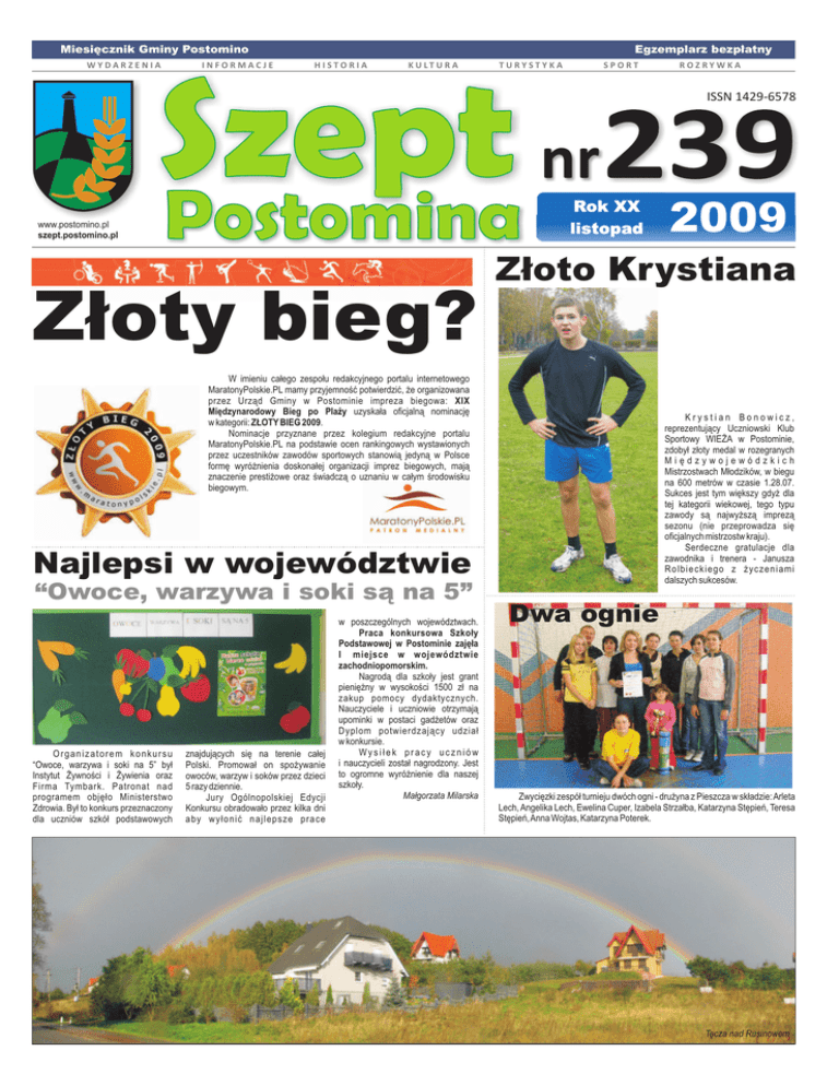 Egzemplarz bezpłatny Miesięcznik Gminy Postomino Szept nr 239 Postomina WYDARZENIA INFORMACJE HISTORIA K U LT U R A TURYSTYKA SPORT ROZRYWKA ISSN 1429-6578 www.postomino.pl szept.postomino.pl Rok XX listopad 2009 Złoto Krystiana Złoty bieg? W imieniu całego zespołu redakcyjnego portalu internetowego MaratonyPolskie.PL mamy przyjemność potwierdzić, że organizowana przez Urząd Gminy w Postominie impreza biegowa: XIX Międzynarodowy Bieg po Plaży uzyskała oficjalną nominację w kategorii: ZŁOTY BIEG 2009. Nominacje przyznane przez kolegium redakcyjne portalu MaratonyPolskie.PL na podstawie ocen rankingowych wystawionych przez uczestników zawodów sportowych stanowią jedyną w Polsce formę wyróżnienia doskonałej organizacji imprez biegowych, mają znaczenie prestiżowe oraz świadczą o uznaniu w całym środowisku biegowym. Krystian Bonowicz, reprezentujący Uczniowski Klub Sportowy WIEŻA w Postominie, zdobył złoty medal w rozegranych Międzywojewódzkich Mistrzostwach Młodzików, w biegu na 600 metrów w czasie 1.28.07. Sukces jest tym większy gdyż dla tej kategorii wiekowej, tego typu zawody są najwyższą imprezą sezonu (nie przeprowadza się oficjalnych mistrzostw kraju). Serdeczne gratulacje dla zawodnika i trenera - Janusza Rolbieckiego z życzeniami dalszych sukcesów. Najlepsi w województwie “Owoce, warzywa i soki są na 5” Organizatorem konkursu “Owoce, warzywa i soki na 5” był Instytut Żywności i Żywienia oraz Firma Tymbark. Patronat nad programem objęło Ministerstwo Zdrowia. Był to konkurs przeznaczony dla uczniów szkół podstawowych znajdujących się na terenie całej Polski. Promował on spożywanie owoców, warzyw i soków przez dzieci 5 razy dziennie. Jury Ogólnopolskiej Edycji Konkursu obradowało przez kilka dni aby wyłonić najlepsze prace w poszczególnych województwach. Praca konkursowa Szkoły Podstawowej w Postominie zajęła I miejsce w województwie zachodniopomorskim. Nagrodą dla szkoły jest grant pieniężny w wysokości 1500 zł na zakup pomocy dydaktycznych. Nauczyciele i uczniowie otrzymają upominki w postaci gadżetów oraz Dyplom potwierdzający udział w konkursie. Wysiłek pracy uczniów i nauczycieli został nagrodzony. Jest to ogromne wyróżnienie dla naszej szkoły. Małgorzata Milarska Dwa ognie Zwycięzki zespół turnieju dwóch ogni - drużyna z Pieszcza w składzie: Arleta Lech, Angelika Lech, Ewelina Cuper, Izabela Strzałba, Katarzyna Stępień, Teresa Stępień, Anna Wojtas, Katarzyna Poterek. Tęcza nad Rusinowem 2 listopad 2009 Dwa pierwsze listopadowe dni Uroczystości związane z kultem zmarłych, przypadające na dwa pierwsze dni listopadowej słoty, zmuszają do refleksji nad istotą ludzkiego życia i nieuchronnych praw natury. Obecnie zwyczaj odwiedzania cmentarzy i palenia świec na grobach wykracza poza sferę przekonań religijnych. Święto Zmarłych, celebrowane głównie 1 listopada, nie ma dziś związku z przynależnością wyznaniową. Łączy w sobie wielowiekową obrzędowość pogańską z tradycją dwóch starych świąt kościelnych – przypadającego na 1 listopada dnia Wszystkich Świętych i następującego po nim dnia Zadusznego, ku pamięci wszystkich zmarłych. Uroczystość Wszystkich Świętych powstała z myślą o niezwykle licznej rzeszy anonimowych męczenników, których nie wspomniano ani w martyrologiach miejscowych, ani w kanionie mszy świętej. Chrześcijański obrzęd Zaduszek powstał w 988 roku z inicjatywy opata Postomino Miesięcznik Gminy Postomino Odolina z Cluny, który polecił, by w klasztorach odprawiano oficjum za zmarłych. Była to forma usankcjonowania przez Kościół, praktykowanych od dawna pośród ludu, odwiecznych zwyczajów pogańskich i zaduszkowych obrzędów i nadania im chrześcijańskiego charakteru. Wkrótce zwyczaj ten poczęto naśladować, a święto ostatecznie zatwierdził w 999 roku papież Sylwester II. W Polsce obchody kościelnych Zaduszek pojawiały się na przełomie XIV i XV wieku. Niezależnie od przemian, jakim w ciągu stuleci ulegały obrzędy związane ze świętem zmarłych, sens zaduszkowego obyczaju pozostał niezmienny – jest on świadectwem naszej pamięci o tych, co odeszli na zawsze. W ten dzień wspominamy bliskich, krewnych, znajomych, przyjaciół, i to bez względu na wyznawany światopogląd, snując jednocześnie refleksje nad przemijaniem. Dbałość o zmarłych wynikała z głębokiej wiary, że dusza w tajemniczy sposób uczestniczy w tym, co dzieje się nad grobem i, zwłaszcza w Dzień Zmarłych, utrzymuje kontakt ze światem żywych. Święto Zmarłych cieszy się w Polsce wyjątkową popularnością. Czy jednak mamy świadomość, że wypełniamy rytuał o wielowiekowej tradycji? Za zapaleniem znicza na grobie kryje się, wywodząca się jeszcze z czasów prehistorycznych, stara symbolika ognia i jego funkcji opiekuńczej i ożywiającej; w chrześcijaństwie ogień (światło) jest symbolem wiary. Warto zachować pamięć historii i znaczenia symboli, którymi się posługujemy, aby zapalenie świeczki (znicza) na grobie kogoś bliskiego nie było tylko gestem przyzwyczajenia. Sławoj Zawada Na podstawie Hanna Szymanderska „Polskie tradycje świąteczne”. INWESTYCJE NA FINISZU Lotnisko w Pałowie Lotnisko trawiaste o długości 500 m i 50 m szerokości zbudował w Pałowie słupski biznesmen przygotowujący się do produkcji samolotów ultralekkich. To właśnie tutaj będą odbywały się próbne starty i lądowania produkowanych maszyn latających. Już wkrótce lądowisko zostanie zarejestrowane w krajowym rejestrze i wtedy będzie dostępne dla wszystkich samolotów mogących korzystać z tego typu pasów startowych. Dotychczas lądowisko to dwa hangary na osiem samolotów i małe biuro. Kto wie czy nie będzie to przyczynkiem do przyspieszenia budowy terenów golfowych w okolicach Staniewic? Dla poprawy bezpieczeństwa P o d p i s a n o porozumienie w sprawie zakupu nowego sprz