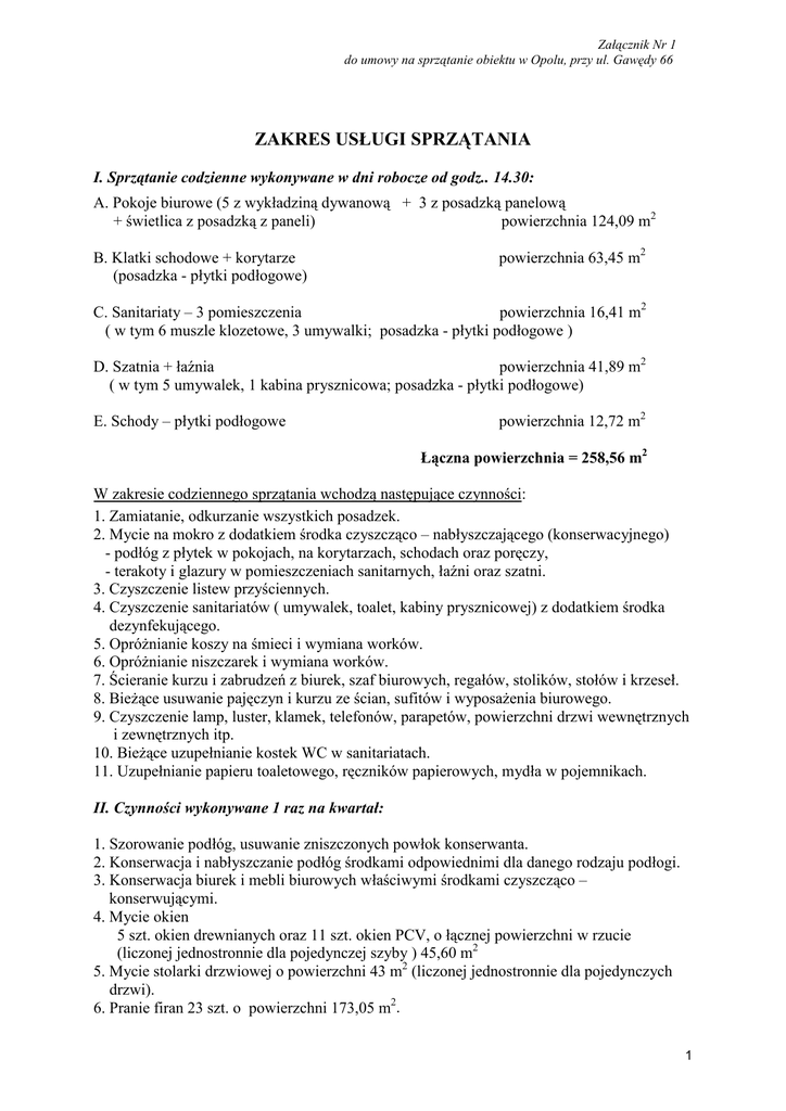Załącznik Nr 1 do umowy na sprzątanie obiektu w Opolu, przy ul. Gawędy 66 ZAKRES USŁUGI SPRZĄTANIA I. Sprzątanie codzienne wykonywane w dni robocze od godz.. 14.30: A. Pokoje biurowe (5 z wykładziną dywanową + 3 z posadzką panelową + świetlica z posadzką z paneli) powierzchnia 124,09 m2 B. Klatki schodowe + korytarze (posadzka - płytki podłogowe) powierzchnia 63,45 m2 C. Sanitariaty – 3 pomieszczenia powierzchnia 16,41 m2 ( w tym 6 muszle klozetowe, 3 umywalki; posadzka - płytki podłogowe ) D. Szatnia + łaźnia powierzchnia 41,89 m2 ( w tym 5 umywalek, 1 kabina prysznicowa; posadzka - płytki podłogowe) E. Schody – płytki podłogowe powierzchnia 12,72 m2 Łączna powierzchnia = 258,56 m2 W zakresie codziennego sprzątania wchodzą następujące czynności: 1. Zamiatanie, odkurzanie wszystkich posadzek. 2. Mycie na mokro z dodatkiem środka czyszcząco – nabłyszczającego (konserwacyjnego) - podłóg z płytek w pokojach, na korytarzach, schodach oraz poręczy, - terakoty i glazury w pomieszczeniach sanitarnych, łaźni oraz szatni. 3. Czyszczenie listew przyściennych. 4. Czyszczenie sanitariatów ( umywalek, toalet, kabiny prysznicowej) z dodatkiem środka dezynfekującego. 5. Opróżnianie koszy na śmieci i wymiana worków. 6. Opróżnianie niszczarek i wymiana worków. 7. Ścieranie kurzu i zabrudzeń z biurek, szaf biurowych, regałów, stolików, stołów i krzeseł. 8. Bieżące usuwanie pajęczyn i kurzu ze ścian, sufitów i wyposażenia biurowego. 9. Czyszczenie lamp, luster, klamek, telefonów, parapetów, powierzchni drzwi wewnętrznych i zewnętrznych itp. 10. Bieżące uzupełnianie kostek WC w sanitariatach. 11. Uzupełnianie papieru toaletowego, ręczników papierowych, mydła w pojemnikach. II. Czynności wykonywane 1 raz na kwartał: 1. Szorowanie podłóg, usuwanie zniszczonych powłok konserwanta. 2. Konserwacja i nabłyszczanie podłóg środkami odpowiednimi dla danego rodzaju podłogi. 3. Konserwacja biurek i mebli biurowych właściwymi środkami czyszcząco – konserwującymi. 4. Mycie okien 5 szt. okien drewnianych oraz 11 szt. okien PCV, o łącznej powierzchni w rzucie (liczonej jednostronnie dla pojedynczej szyby ) 45,60 m2 5. Mycie stolarki drzwiowej o powierzchni 43 m2 (liczonej jednostronnie dla pojedynczych drzwi). 6. Pranie firan 23 szt. o powierzchni 173,05 m2. 1 III. Czynności wykonywane 1 raz na pół roku wykonywane w godzinach od 7-14 Mycie okien: 7 szt. PCV ściennych warsztatowych nie otwieranych o powierzchni 76,44m2, liczonej jednostronnie dla pojedynczej szyby oraz jednego okna PCV o powierzchni w rzucie (liczonej jednostronnie dla pojedynczej szyby 4,8m2). Mycie okien możliwe jest z zastosowaniem drabiny i nie wymaga zastosowania technik alpinistycznych ani użycia podnośnika. Uwagi: 1. W cenie usługi znajdują się środki czyszczące, konserwujące i higieniczno-sanitarne niezbędne do wykonywania przez Wykonawcę usługi, Wykonawca zobowiązany jest do zakupu własnym staraniem i na własny koszt oraz do bieżącego uzupełniania bądź wymiany: mydła w płynie1, ręczników papierowych2 , papieru toaletowego 3 (według opisów w odnośnikach) oraz wkładów zapachowo – dezynfekujących w sedesach i pisuarach. 2. W budynku jest zatrudnionych 13 osób. IV. Czynności wykonywane 2 razy w roku Konserwacja podłóg polimerem odpowiednim do rodzaju podłogi. WYKONAWCA ZAMAWIAJĄCY ……………………. ……………………. 1 perłowe, gęste – nie wyciekające z dozowników, do codziennego mycia rąk, o dobrych właściwościach myjących i pielęgnujących ( z dodatkiem lanoliny i innych substancji zapobiegającym wysuszaniu skóry), bezzapachowe lub lekko perfumowane, odczyn pH neutralny dla skóry 2 100% celuloza, 2-warstwowe, białe 3 celulozowy, gofrowany, biały, (białość ok. 80%), dwuwarstwowy, gramatura nie mniej niż 2x16g/m2, perforacja, 2