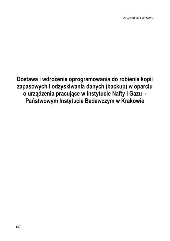 Załącznik nr 1 do SIWZ Dostawa i wdrożenie oprogramowania do robienia kopii zapasowych i odzyskiwania danych (backup) w oparciu o urządzenia pracujące w Instytucie Nafty i Gazu Państwowym Instytucie Badawczym w Krakowie 0/7 SPIS TREŚCI 1. Opis przedmiotu zamówienia……………………………………………………………….2 2. Oprogramowanie do robienia kopii zapasowych i odzyskiwania danych (backup)…………………………………………………………………………………………2 3. Opis wdrożenia…………………….…………………………………………………………..4 1/7 1. Opis przedmiotu zamówienia: Przedmiotem zamówienia jest dostawa i wdrożenie oprogramowania do robienia kopii zapasowych i odzyskiwania danych (backup) w oparciu o urządzenia pracujące w Instytucie Nafty i Gazu - Państwowym Instytucie Badawczym w Krakowie. Oprogramowanie to musi posiadać wymagane przez Zamawiającego licencje i wsparcie techniczne Producenta Oprogramowania oraz musi zostać, w ramach wdrożenia, zintegrowane z innymi urządzeniami pracującymi w sieci Zamawiającego. Po zakończeniu wdrożenia w/w oprogramowania Wykonawca zobowiązany będzie do przeprowadzenia instruktażu. Instruktaż musi się odbyć w siedzibie Zamawiającego. Opis wdrożenia (dostawa, instalacja, konfiguracja i instruktaż) znajduje się na str.5, niniejszego załącznika. Zamawiający nie dopuszcza składania ofert częściowych. Oprogramowanie do robienia kopii zapasowych i odzyskiwania danych (backup) musi: - Pochodzić z legalnego kanału sprzedaży producenta oprogramowania. Zamawiający zastrzega sobie możliwość weryfikacji numerów seryjnych dostarczonego oprogramowania u producenta, w celu sprawdzenia czy pochodzi ono z legalnego kanału sprzedaży, - Posiadać wykupione dla Zamawiającego wsparcie techniczne (Support - Maintenace) u producenta oprogramowania obejmujące swoim działaniem wsparcie telefoniczne, dla krytycznych zdarzeń - 24h na dobę, 7 dni w tygodniu oraz możliwość aktualizacji wersji oprogramowania, do najnowszej - przez okres minimum 2 lat. Końcowym właścicielem oferowanego oprogramowania i licencji musi być Zamawiający. W ramach składanej oferty Wykonawca musi wypełnić Formularz Ofertowy – zgodnie z załączonym wzorem i wymaganiami zawartymi w SIWZ. 2. Oprogramowanie do robienia kopii zapasowych i odzyskiwania danych (backup) Wymagania dotyczące oprogramowania: Oferowane oprogramowanie musi: 1. Współpracować z systemem do wirtualizacji VMware w wersji 5.1, 5.5, 6.0 oraz Microsoft Hyper-V 2012 i 2012 R2. Wszystkie funkcjonalności w specyfikacji muszą być dostępne na wszystkich wspieranych platformach wirtualizacyjnych, chyba, że wyszczególniono inaczej 2. Współpracować z hostami zarządzanymi przez VMware vCenter oraz pojedynczymi hostami. 3. Współpracować z hostami zarządzanymi przez System Center Virtual Machine Manager, klastrami hostów oraz pojedynczymi hostami. 4. Zapewniać tworzenie kopii zapasowych wszystkich systemów operacyjnych maszyn wirtualnych wspieranych przez vSphere i Hyper-V 5. Być licencjonowanie w modelu “per-CPU”. Wszystkie funkcjonalności zawarte w tym dokumencie powinny być zapewnione w tej licencji. Jakiekolwiek dodatkowe licencjonowanie (per zabezpieczony TB, dodatkowo płatna deduplikacja) nie jest dozwolone 6. Być niezależne sprzętowo i umożliwiać wykorzystanie dowolnej platformy serwerowej i dyskowej 7. Tworzyć “samowystarczalne” archiwa do odzyskania których nie wymagana jest osobna baza danych z metadanymi deduplikowanych bloków 8. Mieć mechanizmy deduplikacji i kompresji w celu zmniejszenia wielkości archiwów. Włączenie tych mechanizmów nie może skutkować utratą jakichkolwiek funkcjonalności wymienionych w tej specyfikacji 9. Zapewniać warstwę abstrakcji nad poszczególnymi urządzeniami pamięci masowej, pozwalając utworzyć jedną wirtualną pulę pamięci na kopie zapasowe. Wymagane jest wsparcie dla co najmniej trzech pamięci masowych w takiej puli. 10. Zapewniać backup jednoprzebiegowy - nawet w przypadku wymagania granularnego odtworzenia 11. Zapewniać mechanizmy informowania o wykonaniu/błędzie zadania poprzez email lub SNMP. W środowisku VMware musi mieć możliwość aktualizacji pola „notatki” na wirtualnej maszynie 2/7 12. Mieć możliwość uruchamiania dowolnych skryptów przed i po zadaniu backupowym lub przed i po wykonaniu zadania snapshota w środowisku VMware. 13. Oferować portal samoobsługowy, umożliwiający odtwarzanie użytkownikom wirtualnych maszyn i baz danych MS SQL (w tym odtwarzanie point-in-time) 14. Zapewniać bezpośrednią integrację z VMware vCloud Director 5.1, 5.5, 5.6 i 8.0 i archiwizować również metadane vCD. Musi też umożliwiać odtwarzanie tych metadanych do vCD 15. Mieć wbudowane mechanizmy backupu konfiguracji w celu prostego odtworzenia systemu po całkowitej reinstalacji 16. Mieć wbudowane mechanizmy szyfrowania zarówno plików z backupami jak i transmisji sieciowej. Włączenie szyfrowania nie może skutkować utratą jakiejkolwiek funkcjonalności wymienionej w tej specyfikacji 17. Oferować zarządzanie kluczami w przypadku utraty podstawowego klucza 18. Wspierać backup maszyn wirtualnych używających współdzielonych dysków VHDX na Hyper-V (shared VHDX) 19. Posiadać architekturę klient/serwer z możliwością instalacji wielu instancji konsoli administracyjnych. 20. Wykorzystywać mechanizmy Change Block Tracking na wszystkich wspieranych platformach wirtualizacyjnych. Mechanizmy muszą być certyfikowane przez dostawcę platformy wirtualizacyjnej 21. Oferować możliwość sterowania obciążeniem storage'u produkcyjnego tak aby nie przekraczane były skonfigurowane przez administratora backupu poziomy latencji. Funkcjonalność ta musi być dostępna na wszystkich wspieranych platformach wirtualizacyjnych 22. Automatycznie wykrywać i usuwać tzw. „snapsho