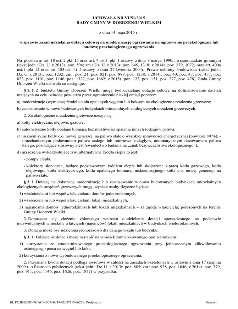 UCHWAŁA NR VI/51/2015 RADY GMINY W DOBRZENIU WIELKIM z dnia 14 maja 2015 r. w sprawie zasad udzielania dotacji celowej na modernizację ogrzewania na ogrzewanie proekologiczne lub budowę proekologicznego ogrzewania Na podstawie art. 18 ust. 2 pkt 15 oraz art. 7 ust.1 pkt 1 ustawy z dnia 8 marca 1990r. o samorządzie gminnym (tekst jedn.: Dz. U. z 2013r. poz. 594; zm.: Dz. U. z 2013r. poz. 645, 1318; z 2014r. poz. 379, 1072) oraz art. 400a ust.1 pkt 21 oraz art. 403 ust. 4 i 5 ustawy z dnia 27 kwietnia 2004r. Prawo ochrony środowiska (tekst jedn.: Dz. U. z 2013r. poz. 1232; zm.: poz. 21, poz. 821, poz. 888, poz. 1238; z 2014r. poz. 40, poz. 47, poz. 457, poz. 822, poz. 1101, poz. 1146, poz. 1322, poz. 1662; z 2015r. poz. 122, poz. 151, poz. 277, poz. 478), Rada Gminy Dobrzeń Wielki uchwala co następuje: § 1. 1. Z budżetu Gminy Dobrzeń Wielki mogą być udzielane dotacje celowe na dofinansowanie działań mających na celu ochronę powietrza przez ograniczenie niskiej emisji poprzez: a) modernizację (wymianę) źródeł ciepła opalanych węglem lub koksem na ekologiczne urządzenia grzewcze; b) zastosowanie w nowo budowanych budynkach mieszkalnych ekologicznych urządzeń grzewczych. 2. Za ekologiczne urządzenia grzewcze uznaje się: a) kotły elektryczne, olejowe, gazowe; b) automatyczne kotły opalane biomasą bez możliwości spalania innych rodzajów paliwa; c) niskoemisyjne kotły c.o. nowej generacji na paliwo stałe o wysokiej sprawności energetycznej (powyżej 80 %), z mechanicznym podawaniem paliwa stałego lub retortowe z ciągłym, automatycznym dozowaniem paliwa stałego, posiadające stosowny atest (świadectwo badania na „znak bezpieczeństwa ekologicznego”); d) urządzenia wykorzystujące tzw. alternatywne źródła ciepła to jest: - pompy ciepła, - kolektory słoneczne, będące podstawowym źródłem ciepła lub skojarzone z pracą kotła gazowego, kotła olejowego, kotła elektrycznego, kotła opalanego biomasą, niskoemisyjnego kotła c.o. nowej generacji na paliwo stałe. § 2. 1. Dotację na dokonaną modernizację lub zastosowanie w nowo budowanych budynkach mieszkalnych ekologicznych urządzeń grzewczych mogą uzyskać osoby fizyczne będące: 1) właścicielami lub współwłaścicielami domów jednorodzinnych, 2) właścicielami lub współwłaścicielami lokali mieszkalnych, 3) najemcami domów jednorodzinnych lub lokali mieszkalnych – za zgodą właściciela; położonych na terenie Gminy Dobrzeń Wielki. 2. Dopuszcza się złożenie zbiorczego wniosku o udzielenie dotacji sporządzonego na podstawie indywidualnych wniosków właścicieli (najemców) lokali mieszkalnych w budynkach wielorodzinnych. 3. Dotacja może być udzielona jednorazowo dla danego lokalu lub budynku. § 3. 1. Udzielenie dotacji może nastąpić na wniosek zainteresowanego pod warunkiem: 1) korzystania ze zmodernizowanego proekologicznego ogrzewania przy jednoczesnym zlikwidowaniu ostniejącego pieca na wegiel lub koks; 2) korzystania z nowo wybudowanego proekologicznego ogrzewania. 2. Przyznana kwota dotacji podlega zwrotowi w całości na zasadach określonych w ustawie z dnia 17 sierpnia 2009 r. o finansach publicznych (tekst jedn.: Dz. U. z 2013r. poz. 885; zm.: poz. 938, poz. 1646; z 2014r. poz. 379, poz. 911, poz. 1146, poz. 1626, poz. 1877) w przypadku: Id: FC3B6BDF-7CAC-4F07-8C19-0ED71F966259. Podpisany Strona 1 1) zaprzestania użytkowania proekologicznego ogrzewania z przyczyn zależnych od użytkownika przed upływem 5 lat od dnia zawarcia umowy dotacji; 2) złożenia fałszywych dokumentów i oświadczeń. § 4. 1. Wniosek o dotację składa się w Urzędzie Gminy w Dobrzeniu Wielkim wraz z następującymi załącznikami: 1) dokument stwierdzający prawo do nieruchomości, to jest odpis z księgi wieczystej, akt notarialny lub umowa najmu wraz ze zgodą właściciela; 2) kserokopia imiennych rachunków lub faktur w oryginale wystawionych na właściciela lub najemcę z tytułu nabycia ekologicznych urządzeń grzewczych; 3) protokół odbioru wykonanego systemu ogrzewania przez osobę ze stosownymi uprawnieniami; 4) w przypadku instalacji ekologicznych urządzeń grzewczych na paliwa stałe świadectwo badania na „znak bezpieczeństwa ekologicznego”; 5) w przypadku zastosowania urządzeń grzewczych wykorzystujących tzw. alternatywne źródła ciepła to jest pompy ciepła lub kolektory słoneczne oświadczenie, iż zasadniczy system ogrzewania jest systemem ekologicznym; 6) oświadczenie, iż do wykonania wymiany ogrzewania na ekologiczne w przedmiotowym lokalu lub budynku istniało tylko ogrzewanie na węgiel lub koks i zostało zlikwidowane z chwilą modernizacji na proekologiczne; 7) oświadczenie, iż do dnia złożenia wniosku nie korzystano z dotacji na modernizację lub budowę ekologicznych urządzeń grzewczych. 2. Wniosek wraz z załącznikami kwalifikuje zespół powołany przez Wójta Gminy Dobrzeń Wielki. 3. Dotacja na modernizację lub budowę proekologicznego ogrzewania dotyczy jedynie kosztów: 1) zakupu kotła c.o.; 2) zakupu dynamicznych piecy akumulacyjnych; 3) zakupu pompy ciepła; 4) zakupu kolektorów słonecznych. 4. Dotacja przyznawana będzie w kwocie wynoszącej 60 % ceny brutto zakupu, jednak nieprzekraczającej 10.000 zł. § 5. Dotacja będzie realizowana po zawarciu umowy cywilnoprawnej o udzieleniu dotacji na modernizację lub budowę proekologicznego systemu grzewczego wraz ze zobowiązaniem się do: 1) stałego korzystania z proekologicznego ogrzewania; 2) zlikwidowania starego pieca opalanego węglem lub koksem z chwilą modernizacji systemu ogrzewania na proekologiczne; 3) umożliwienia przeprowadzenia ewentualnej kontroli wykonanych prac; 4) zwrotu przyznanej kwoty dotacji w przypadku zaprzestania używania proekologicznego ogrzewania z przyczyn zależnych od użytkownika lub złożenia fałszywych dokumentów i oświadczeń stanowiących podstawę przyznania dotacji. § 6. Dotacja przyznawana będzie pod warunkiem: 1