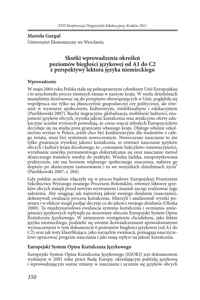 XVII Konferencja Diagnostyki Edukacyjnej, Kraków 2011 Mariola Gurgul Uniwersytet Ekonomiczny we Wrocławiu Skutki wprowadzenia określeń poziomów biegłości językowej od A1 do C2 z perspektywy lektora języka niemieckiego Wprowadzenie W maju 2004 roku Polska stała się pełnoprawnym członkiem Unii Europejskiej i to uruchomiło proces istotnych zmian w naszym kraju. W wielu dziedzinach musieliśmy dostosować się do przepisów obowiązujących w Unii, pogłębiła się współpraca nie tylko na płaszczyźnie gospodarczej czy politycznej, ale również w wymiarze społecznym, kulturowym, intelektualnym i edukacyjnym (Pawlikowski 2007). Ruchy migracyjne, globalizacja, mobilność ludności, znajomość języków obcych, wysoka jakość kształcenia oraz atrakcyjne oferty edukacyjne uczelni wyższych powodują, że coraz więcej młodych Europejczyków decyduje się na studia poza granicami własnego kraju. Dlatego właśnie szkolnictwo wyższe w Polsce, jeżeli chce być konkurencyjne dla studentów z całego świata, musi być systemem nowoczesnym. Nowoczesne nauczanie to nie tylko gwarancja wysokiej jakości kształcenia, to również nauczanie języków obcych i kultury kraju docelowego, to „«zarażanie bakcylem» innowacyjności, wyrabianie nawyku permanentnego dokształcania się oraz nauczanie metod skutecznego transferu wiedzy do praktyki. Wiedza ludzka, niespożytkowana praktycznie, nie ma bowiem większego społecznego znaczenia, nabiera go dopiero po skutecznym zastosowaniu i to we wszystkich dziedzinach życia” (Pawlikowski 2007, s. 284). Gdy polskie uczelnie włączyły się w proces budowy Europejskiej Przestrzeni Szkolnictwa Wyższego zwanego Procesem Bolońskim, również lektorzy języków obcych stanęli przed nowym wyzwaniem i musieli zacząć realizować jego założenia. Aby osiągnąć jak najwyższą jakość swojego działania (nauczania), dokonywali ewaluacji procesu kształcenia. Mierzyli i analizowali wyniki pomiaru i w efekcie mogli podjąć decyzje co do jakości swojego działania (Oleska 2000). Ta międzynarodowa ewaluacja systemu kształcenia i oceniania umiejętności językowych wpłynęła na stosowany obecnie Europejski System Opisu Kształcenia Językowego. W niniejszym wystąpieniu chciałabym, jako lektor języka niemieckiego, podzielić się swoimi doświadczeniami spowodowanymi wyznaczeniem w tym dokumencie 6 poziomów biegłości językowej (od A1 do C2) oraz jak testy klasyfikujące, jako narzędzie ewaluacji, pomagają nauczycielowi opracować program nauczania i jaki mają wpływ na jakość kształcenia. Europejski System Opisu Kształcenia Językowego Europejski System Opisu Kształcenia Językowego (ESOKJ) jest dokumentem wydanym w 2001 roku przez Radę Europy, określającym politykę językową i wprowadzającym ważne zmiany w nauczaniu i uczeniu się języków obcych 350 Ewaluacja w edukacji: koncepcje, metody, perspektywy w krajach Unii Europejskiej. „Zawiera on usystematyzowany zbiór pojęć umożliwiający pełny, przejrzysty i spójny opis kształcenia językowego w zróżnicowanej językowo i kulturowo Europie, w odniesieniu do trzech jego aspektów: uczenia się języka, nauczania języka i oceny osiąganych w uczeniu się i nauczaniu wyników” (Trzcińska 2011, s. 1). Trzcińska stwierdza, że kiedy tworzono ten dokument, chciano wyznaczyć podstawy, które umożliwiłyby porównywanie i wzajemne uznawanie kwalifikacji językowych. Ważne było również, aby zachęcić instytucje edukacyjne krajów europejskich do wspólnego działania oraz wspierania uczniów, nauczycieli, instytucji, które przeprowadzają egzaminy oraz władz oświatowych przy wyznaczaniu celów i koordynowaniu działań. Okazało się, że jest tak wiele systemów edukacyjnych i instytucji, które potwierdzają umiejętności językowe, że należało je porównać i taką rolę pełni obecnie ESOKJ. Dokument ten jest uniwersalnym punktem odniesienia, ponieważ skupił się na umiejętnościach językowych, komunikatywnym podejściu do uczenia się języków obcych i ma charakter międzyjęzykowy. Podstawa programowa, system egzaminowania, podręczniki oraz wymogi kształcenia nauczycieli języków obcych dostosowane zostały do dokumentu Rady Europy (Trzcińska 2011, Czura 2010). W nim właśnie opisane zostały umiejętności, jakie są potrzebne, aby osiągnąć biegłość w posługiwaniu się językiem obcym oraz określono 6 poziomów biegłości językowej (od A1 do C2). W tabeli 1. scharakteryzowane zostały te poziomy. Tabela 1. Opis poziomów biegłości językowej Poziom A1 Opis Osoba posługująca się językiem na tym poziomie rozumie i potrafi stosować podstawowe zwroty potoczne i wyrażenia dotyczące życia codziennego. Potrafi przedstawiać siebie i innych oraz formułować pytania z zakresu życia prywatnego, dotyczące np. miejsca, w którym mieszka, ludzi, których zna i rzeczy, które posiada. Potrafi prowadzić prostą rozmowę pod warunkiem, że rozmówca mówi wolno, zrozumiale i jest gotowy do pomocy. A2 Osoba posługująca się językiem na tym poziomie rozumie wypowiedzi i często używane wyrażenia związane z życiem codziennym (np. podstawowe informacje dotyczące osoby rozmówcy i jego rodziny, zakupów, otoczenia, pracy). Potrafi porozumiewać się w prostych, rutynowych sytuacjach komunikacyjnych, wymagających jedynie prostej, bezpośredniej wymiany informacji na tematy znane i typowe. Potrafi w prosty sposób opisywać swoje pochodzenie, otoczenie a także poruszać sprawy związane z najważniejszymi potrzebami życia codziennego. B1 Osoba posługująca się językiem na tym poziomie rozumie znaczenie głównych wątków przekazu zawartego w jasnych, standardowych wypowiedziach, które dotyczą znanych jej spraw i zdarzeń typowych dla pracy, szkoły, czasu wolnego itd. Potrafi radzić sobie z większością sytuacji komunikacyjnych, które mogą się zdarzyć podczas podróży w rejonie, gdzie mówi się 