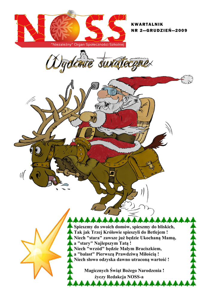 KWARTALNIK NR 2—GRUDZIEŃ—2009 Spieszmy do swoich domów, spieszmy do bliskich, Tak jak Trzej Królowie spieszyli do Betlejem ! Niech "stara" zawsze już będzie Ukochaną Mamą, a "stary" Najlepszym Tatą ! Niech "wrzód" będzie Małym Braciszkiem, a "balast" Pierwszą Prawdziwą Miłością ! Niech słowo odzyska dawno utraconą wartość ! Magicznych Świąt Bożego Narodzenia ! życzy Redakcja NOSS-a Str. 2 N R 2 —G R U D Z I E Ń —2 0 0 9 Z dumą spoglądamy w przyszłość! Dnia 13 października w naszej szkole odbyło się, połączone z otrzęsinami, ślubowanie klas pierwszych. W uroczystej atmosferze nowi uczniowie, z wyciągniętymi w kierunku sztandaru palcami, wypowiadali słowa przysięgi. Po ślubowaniu głos zabrał Dyrektor Szkoły Pan mgr inż. Jan Semrau i powitał przybyłą na uroczystość młodzież. W tym roku do chojnickiej jedynki przyjęto 242 nowych uczniów. Powstało 5 klas technikum, 2 klasy licealne i jedna klasa zawodowa. Po zakończeniu części oficjalnej, przystąpiono do uroczystych otrzęsin. Zaaranżowano program wszystkim dobrze znany z telewizji – „Mam Talent”. NOSS Str. 3 Uczniowie rywalizowali ze sobą w przeróżnych dyscyplinach. Ich poczynania oceniało, znane wszystkim, jury w składzie: Kuba Wojewódzki, Doda, Anna Maria Wesołowska i Michał Wiśniewski. Pierwsza konkurencja związana była z prezentacją, przygotowanego wcześniej utworu, następnie pierwszoklasiści wykazywali się w tańcu i odpowiedziach na losowane pytania. Na zakończenie sprawdzona została ich tężyzna fizyczna. Reprezentanci klas ścigali się w "raczkach" i "żabkach". Przeprowadzono również konkurs rzutów do kosza. Zabawa była przednia, a zmagania bardzo zacięte, bo można było wygrać tygodniowy bilet na lenistwo w szkole. Nagroda przyznana została klasie I Technikum Informatycznego. Przygotował Kamil Kiedrowski Kl. IV TE NOSS Str. Na półmetku ! Dnia 6 października 2009 r. w kręgielni „Mistral” odbyły się uroczyste Połowinki klas II LOW oraz III TM. Zabawa trwała od godziny 18.00 do 02.00, a urozmaicona była wieloma konkursami, w których uczennice i uczniowie wraz ze swoimi partnerami mogli sprawdzić swoje umiejętności. O północy uczestnicy balu mieli okazję skosztować pyszny tort, który został oficjalnie pokrojony przez wychowawcę klasy II LOW Pana mgr Janusza Laskę. Wszyscy bawili się wspaniale, a w pamięci pozostały niezatarte wrażenia. Oto kilka miłych chwil tej uroczystości utrwalonych na fotografii. N R 2 —G R U D Z I E Ń —2 0 0 9 Str. 4 Nasi koledzy w konkursach... ~ Z TUREM W HERBIE! ~ Prezentujemy wyniki Szkolnego Konkursu Wiedzy o Chojnicach i Ziemi Chojnickiej „Z turem w herbie” ! W konkursie wzięło udział 38 uczniów z 7 klas liceum i technikum. Do zwycięzców należą: I miejsce – Szymon Bukała III TI II miejsce – Artur Pałubicki II TM III miejsce – Wojciech Zwiewka III TI Laureatom Gratulujemy ! ~ IMPRESJE POMORSKIE ~ Dnia 26 października 2009 r. rozstrzygnięto Szkolny Konkurs Fotograficzny „Impresje pomorskie”. Komisja konkursowa w składzie: - Beata Bruska - Ilona Drobińska - Kazimierz Jaruszewski - Aleksander Knitter (Gazeta Pomorska) - Janina Kosiedowska (prezes ZKP w Chojnicach) - Jan Semrau (dyrektor ZSP nr 1 w Chojnicach) pod przewodnictwem Witolda Kosznika oceniła 33 fotogramy oraz 3 cykle fotogramów. Oto wyniki konkursu w dwóch kategoriach: I Pojedyncze fotogramy: I miejsce – „Przyjaciele” – 25 pkt. , autor Szymon Bukała z kl. III TI II miejsce – „Ul. Wąska” – 16 pkt. ,autor Dawid Ryduchowski z kl. IV TE III miejsce – „Ruch przyjemnego koloru w zimnej jesieni – sobotnie popołudnie” - 9 pkt. ,autor Karol Rocławski z kl. II TI Komisja przyznała dodatkowo 2 równorzędne wyróżnienia w tej kategorii: „Latawce – dmuchawce – wiatr”, autor Kamil Kiedrowski z kl. IV TE „Zniszczony”, autor Tobiasz Męczykowski z kl. IV TE NOSS Str. 5 ~ „Przyjaciele” ~ „Ul. Wąska” ~ N R 2 —G R U D Z I E Ń —2 0 0 9 Str. 6 „Ruch przyjemnego koloru w zimnej jesieni – sobotnie popołudnie” ~ II Cykle fotogramów: I miejsce – „Odonata” – 19 pkt. , autor Tobiasz Męczykowski z kl. IV TE W tegorocznej edycji konkursu komisja nie przyznała II i III miejsca. Wyróżnienie otrzymał cykl „Światłoczułe”, autor Kamil Kiedrowski z kl. IV TE „Odonata” - fragment NOSS Str. 7 „Światłoczułe” - fragment ~ BĄDŹMY ŚWIADKAMI MIŁOŚCI ~ Dnia 1 grudnia 2009 r. odbyły się eliminacje szkolne XX Olimpiady Teologii Katolickiej pod hasłem „Bądźmy świadkami miłości i sprawiedliwości społecznej”. Wzięło w nich udział 34 uczniów naszej szkoły, w czołówce znaleźli się : I miejsce – Paweł Szwak kl. III LO II miejsce – Bartosz Borzyszkowski kl. III LO Danuta Stoltman kl. II LOW Katarzyna Pazda kl. I LO III miejsce – Michał Szmagliński kl. I LO Korneliusz Mientki kl. I LOB Zwycięzcy etapu szkolnego wezmą udział w eliminacjach diecezjalnych, które odbędą się w marcu 2010 roku, życzymy im POWODZENIA ! opracował: ks. Michał Lal N R 2 —G R U D Z I E Ń —2 0 0 9 Str. 8 ~ TEATRALNIE... ~ Niedawno, tj. 4 grudnia 2009 r. w Chojnickim Domu Kultury odbyl się konkurs teatralny pod nazwą "Patron naszej szkoły". Inicjatorem tego kulturalnego wydarzenia był Pan mgr Piotr Pawlicki, który uczy historii w naszej szkole. Uczniowie ZSZ nr 1 zaprezentowali sztukę, ukazującą dzieje powstania oraz działalności naszego patrona Tajnej Organizacji Wojskowej "Gryf Pomorski" i zajęli w konkursie zaszczytne III miejsce ! Wojciech Gliński, Korneliusz Mientki, Łukasz Bloch, Patryk Szamocki, Dariusz Milkowski ~ Zespół teatralny, w którego skład weszli : Łukasz Drobiński, Wojciech Gliński, Łukasz Bloch z kl. III LP, Dariusz Milkowski, Patryk Szamocki, Marcin Marczak, Dawid Kołtonowski z kl. III TI, Kamila Wnuk Lipińska z kl. II LOW, Emilia Peplińska, Korneliusz Mientki, Dawid Wojciecho
