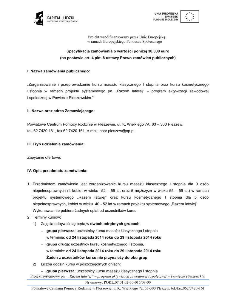 Projekt współfinansowany przez Unię Europejską w ramach Europejskiego Funduszu Społecznego Specyfikacja zamówienia o wartości poniżej 30.000 euro (na postawie art. 4 pkt. 8 ustawy Prawo zamówień publicznych) I. Nazwa zamówienia publicznego: „Zorganizowanie i przeprowadzenie kursu masażu klasycznego I stopnia oraz kursu kosmetycznego I stopnia w ramach projektu systemowego pn. „Razem łatwiej” – program aktywizacji zawodowej i społecznej w Powiecie Pleszewskim.” II. Nazwa oraz adres Zamawiającego: Powiatowe Centrum Pomocy Rodzinie w Pleszewie, ul. K. Wielkiego 7A, 63 – 300 Pleszew. tel. 62 7420 161, fax.62 7420 161, e-mail: [email protected] III. Tryb udzielenia zamówienia: Zapytanie ofertowe. IV. Opis przedmiotu zamówienia: 1. Przedmiotem zamówienia jest zorganizowanie kursu masażu klasycznego I stopnia dla 9 osób niepełnosprawnych (4 kobiet w wieku 52 – 59 lat oraz 5 mężczyzn w wieku 55 – 59 lat) w ramach projektu systemowego „Razem łatwiej” oraz kursu kosmetycznego I stopnia dla 5 osób niepełnosprawnych, kobiet w wieku 40 - 52 lat w ramach projektu systemowego „Razem łatwiej” Wykonawca nie pobiera żadnych opłat od uczestników kursu. 2. Terminy kursów: 1) Zajęcia odbywać się będą w dwóch odrębnych grupach: grupa pierwsza: uczestnicy kursu masażu klasycznego I stopnia w terminie: od 24 listopada 2014 roku do 29 listopada 2014 roku grupa druga: uczestnicy kursu kosmetycznego I stopnia, w terminie: od 24 listopada 2014 roku do 29 listopada 2014 roku Żaden z uczestników kursu nie przynależy do obu grup 2) Liczba godzin kursu w poszczególnych dniach: grupa pierwsza: uczestnicy kursu masażu klasycznego I stopnia Projekt systemowy pn. „Razem łatwiej” – program aktywizacji zawodowej i społecznej w Powiecie Pleszewskim Nr umowy: POKL.07.01.02-30-015/08-00 Powiatowe Centrum Pomocy Rodzinie w Pleszewie, u. K. Wielkiego 7a, 63-300 Pleszew, tel./fax.062/7420-161 Projekt współfinansowany przez Unię Europejską w ramach Europejskiego Funduszu Społecznego Zajęcia zrealizowane w ciągu 5 dni w godzinach 08:00 – 16:10 (5 x (10 godzin dydaktycznych + 2 x 10 minut przerwa kawowa + 20 minut przerwa obiadowa)) lub zajęcia zrealizowane w ciągu 6 dni w godzinach 08:00 – 14:55 (6 x (8,33 godziny dydaktyczne + 2 x 10 minut przerwa kawowa + 20 minut przerwa obiadowa)). grupa druga: uczestnicy kursu kosmetycznego I stopnia Zajęcia zrealizowane w ciągu 5 dni w godzinach 08:00 – 16:10 (5 x (10 godzin dydaktycznych + 2 x 10 minut przerwa kawowa + 20 minut przerwa obiadowa)) lub zajęcia zrealizowane w ciągu 6 dni w godzinach 08:00 – 14:55 (6 x (8,33 godziny dydaktyczne + 2 x 10 minut przerwa kawowa + 20 minut przerwa obiadowa)). 3. Miejsce kursu: Pleszew 4. Łączna liczba godzin kursu (zajęcia teoretyczne i praktyczne) wynosi: 50 godzin dydaktycznych dla każdego z kursów. W konsultacji z Zamawiającym dopuszcza się ustalanie w sposób elastyczny długości przerw pomiędzy zajęciami. 5. Program kursu musi odpowiadać wymogom określonym w § 18 Rozporządzenia Ministra Edukacji Narodowej z dnia 11 stycznia 2012 roku w sprawie kształcenia ustawicznego w formach pozaszkolnych (Dz.U., poz. 186) i ponadto spełniać wymogi, jeżeli takie istnieją, wynikające z odrębnych przepisów. 6. Osoby, które nie uzyskają pozytywnego wyniku egzaminu otrzymują zaświadczenie o ukończeniu kursu. 7. W cenie kursu należy uwzględnić wszelkie koszty np. ewentualne koszty egzaminów. 8. Ze względu na charakter projektu tj. aktywizacja społeczno – zawodowa klientów pomocy społecznej, liczba uczestników zajęć może ulec nieznacznym zmianom (np. nieprzewidziana rezygnacja osoby). W przypadku zmniejszenia liczby uczestników nie będą przysługiwały wykonawcy żadne roszczenia odszkodowawcze z tego tytułu. Zamawiający szacuje, że wskazana ilość osób na kursie może ulec zwiększeniu o maksymalnie 3 osoby w kursie masażu klasycznego I stopnia oraz o maksymalnie 2 osoby w kursie kosmetycznym I stopnia. 9. Kurs masażu klasycznego musi obejmować minimum następujący zakres: 1) Obowiązki i cechy masażysty. 2) Wygląd i przygotowanie stanowiska pracy. 3) Zasady BHP. 4) Wywiad z klientem. 5) Omówienie i topografia wybranych mięśni i układów. 6) Funkcje mięśni. Projekt systemowy pn. „Razem łatwiej” – program aktywizacji zawodowej i społecznej w Powiecie Pleszewskim Nr umowy: POKL.07.01.02-30-015/08-00 Powiatowe Centrum Pomocy Rodzinie w Pleszewie, u. K. Wielkiego 7a, 63-300 Pleszew, tel./fax.062/7420-161 Projekt współfinansowany przez Unię Europejską w ramach Europejskiego Funduszu Społecznego 7) Omówienie przyczyn bolesności i przeciążenia mięśni. 8) Omówienie układu kostno – stawowego. 9) Omówienie układu krwionośnego, nerwowego i limfatycznego. 10) Zasady i warunki stosowania masażu. 11) Techniki masażu i ich oddziaływanie (głaskanie, rozcieranie, ugniatanie). 12) Wskazania i przeciwskazania do masażu. 13) Wpływ masażu na poszczególne układy. 14) Omówienie masażu sportowego, antycelluitowego, leczniczego. 15) Prezentacja i nauka technik masażu klasycznego (głaskanie, rozcieranie, wyciskanie, ugniatanie, oklepywanie, wibracje, wstrząsanie, głaskanie końcowe). 16) Metodyka i nauka masażu: masaż karku i obręczy barkowej; masaż kończyny górnej, masaż kończyny dolnej, masaż twarzy i szyi. 17) Nauka rozciągania mięśni i ćwiczeń biernych. Szkolenie musi się składać z części teoretycznej i praktycznej. Kursanci muszą mieć do dyspozycji stanowiska pracy w pełni wyposażone w urządzenia, narzędzia, produkty i kosmetyki potrzebne do przeprowadzania zabiegów. Zabiegi mogą być wykonywane na przemiennie na uczestnikach kursu. Wykonawca musi zapewnić niezbędne preparaty, akcesoria i materiały, sprzęt oraz pomoce dydaktyczne. 10. Kurs kosmetyczny musi obejmować minimum następujący zakres: 1) Cechy i obowiązki kosmetyczki. 2) Urządzenie gabinetu kosme