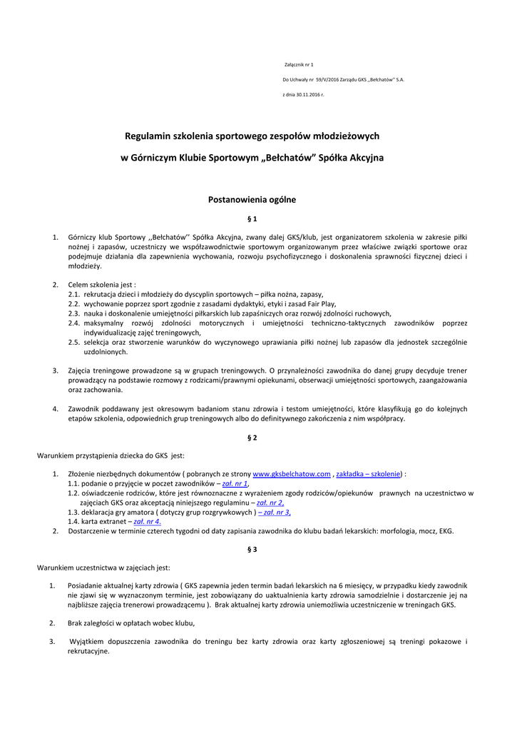 Załącznik nr 1 Do Uchwały nr 59/V/2016 Zarządu GKS ,,Bełchatów’’ S.A. z dnia 30.11.2016 r. Regulamin szkolenia sportowego zespołów młodzieżowych w Górniczym Klubie Sportowym „Bełchatów” Spółka Akcyjna Postanowienia ogólne §1 1. Górniczy klub Sportowy ,,Bełchatów’’ Spółka Akcyjna, zwany dalej GKS/klub, jest organizatorem szkolenia w zakresie piłki nożnej i zapasów, uczestniczy we współzawodnictwie sportowym organizowanym przez właściwe związki sportowe oraz podejmuje działania dla zapewnienia wychowania, rozwoju psychofizycznego i doskonalenia sprawności fizycznej dzieci i młodzieży. 2. Celem szkolenia jest : 2.1. rekrutacja dzieci i młodzieży do dyscyplin sportowych – piłka nożna, zapasy, 2.2. wychowanie poprzez sport zgodnie z zasadami dydaktyki, etyki i zasad Fair Play, 2.3. nauka i doskonalenie umiejętności piłkarskich lub zapaśniczych oraz rozwój zdolności ruchowych, 2.4. maksymalny rozwój zdolności motorycznych i umiejętności techniczno-taktycznych zawodników poprzez indywidualizację zajęć treningowych, 2.5. selekcja oraz stworzenie warunków do wyczynowego uprawiania piłki nożnej lub zapasów dla jednostek szczególnie uzdolnionych. 3. Zajęcia treningowe prowadzone są w grupach treningowych. O przynależności zawodnika do danej grupy decyduje trener prowadzący na podstawie rozmowy z rodzicami/prawnymi opiekunami, obserwacji umiejętności sportowych, zaangażowania oraz zachowania. 4. Zawodnik poddawany jest okresowym badaniom stanu zdrowia i testom umiejętności, które klasyfikują go do kolejnych etapów szkolenia, odpowiednich grup treningowych albo do definitywnego zakończenia z nim współpracy. §2 Warunkiem przystąpienia dziecka do GKS jest: 1. 2. Złożenie niezbędnych dokumentów ( pobranych ze strony www.gksbelchatow.com , zakładka – szkolenie) : 1.1. podanie o przyjęcie w poczet zawodników – zał. nr 1, 1.2. oświadczenie rodziców, które jest równoznaczne z wyrażeniem zgody rodziców/opiekunów prawnych na uczestnictwo w zajęciach GKS oraz akceptacją niniejszego regulaminu – zał. nr 2, 1.3. deklaracja gry amatora ( dotyczy grup rozgrywkowych ) – zał. nr 3, 1.4. karta extranet – zał. nr 4. Dostarczenie w terminie czterech tygodni od daty zapisania zawodnika do klubu badań lekarskich: morfologia, mocz, EKG. §3 Warunkiem uczestnictwa w zajęciach jest: 1. Posiadanie aktualnej karty zdrowia ( GKS zapewnia jeden termin badań lekarskich na 6 miesięcy, w przypadku kiedy zawodnik nie zjawi się w wyznaczonym terminie, jest zobowiązany do uaktualnienia karty zdrowia samodzielnie i dostarczenie jej na najbliższe zajęcia trenerowi prowadzącemu ). Brak aktualnej karty zdrowia uniemożliwia uczestniczenie w treningach GKS. 2. Brak zaległości w opłatach wobec klubu, 3. Wyjątkiem dopuszczenia zawodnika do treningu bez karty zdrowia oraz karty zgłoszeniowej są treningi pokazowe i rekrutacyjne. Obowiązki stron §4 Górniczy Klub Sportowy „Bełchatów” Spółka Akcyjna zobowiązuje się do: 1. Zapewnienia zawodnikom odpowiedniej ilości treningów w tygodniu w danej kategorii wiekowej w okresie zimowym i letnim z wyłączeniem świąt i innych ustawowo wolnych dni. 2. Zapewnienia zawodnikom możliwości udziału we współzawodnictwie sportowym ( rozgrywki krajowe, gry kontrolne, turnieje ). O powołaniu decyduje trener prowadzący oraz trener koordynator. 3. Wyłonienia kadry zawodników w wybranych rocznikach w celu prowadzenia z nimi dodatkowych zajęć oraz zgłoszenia ich udziału w prestiżowych turniejach. 4. Zapewnienia wszystkim zawodnikom najlepszych w miarę możliwości warunków do rozwijania ich umiejętności sportowych, pasji i osobowości, a także kształtowania właściwych postaw społecznych poprzez sport. 5. Zgłoszenia zawodników do właściwego związku nadzorującego rozgrywki. 6. Ubezpieczenia zawodników od Następstw Nieszczęśliwych Wypadków. 7. Zapewnienia konsultacji lekarskich (minimum jeden raz na 6 miesięcy i w sytuacjach wymagających konsultacji). 8. Zorganizowania wydarzeń sportowych takich jak turnieje, zakończenie roku szkoleniowego, obozów sportowych oraz innych imprez sportowych. 9. Publikowania na stronie internetowej www.gksbelchatow.com informacji dotyczących poszczególnych roczników. 10. Organizowania raz w miesiącu dyżuru trenera prowadzącego. 11. Organizowania dwóch spotkań ogólnych z wszystkimi rodzicami w sezonie. §5 Zawodnik zobowiązuje się do: 1. Godnego reprezentowania barw klubowych zarówno w trakcie zajęć treningowych i zawodów, jak również w życiu codziennym. 2. Przychodzenia na zajęcia treningowe minimum 10 minut przed ich rozpoczęciem, a na zawody sportowe (mecze ligowe, towarzyskie oraz turnieje) punktualnie o godzinie, którą wyznaczy prowadzący trener. 3. Uczestniczenia w zajęciach treningowych w sprzęcie GKS. 4. Przychodzenia na każde zawody sportowe w dresie sportowym GKS. 5. Posiadania niezbędnego, odpowiedniego sprzętu treningowego oraz reprezentacyjnego zatwierdzonego przez Zarząd klubu. 6. Uczestniczenia w rozgrywkach ligowych oraz grach kontrolnych w indywidualnych strojach meczowych o ile trener prowadzący nie wyda innych poleceń. 7. Powiadomienia prowadzącego trenera o każdej nieobecności na zajęciach treningowych i zawodach sportowych. 8. Pomagania trenerowi prowadzącemu w rozstawianiu i składaniu sprzętu sportowego na zajęciach treningowych. 9. Dbania o sprzęt treningowy oraz sprzęt sportowy. 10. Wykonywania tylko i wyłącznie poleceń trenera prowadzącego na zajęciach treningowych oraz zawodach sportowych. 11. Bezzwłocznego zgłaszania wszelkich dolegliwości zdrowotnych trenerowi prowadzącemu zajęcia sportowe. 12. Doskonalenia w czasie wolnym elementów technicznych poznanych na zajęciach treningowych. 13. Pełnego zaangażowania oraz sumiennego i zdyscyplinowanego podejścia do zajęć sportowych. 14. W przypadku uzyskiwania słabych wyników w n