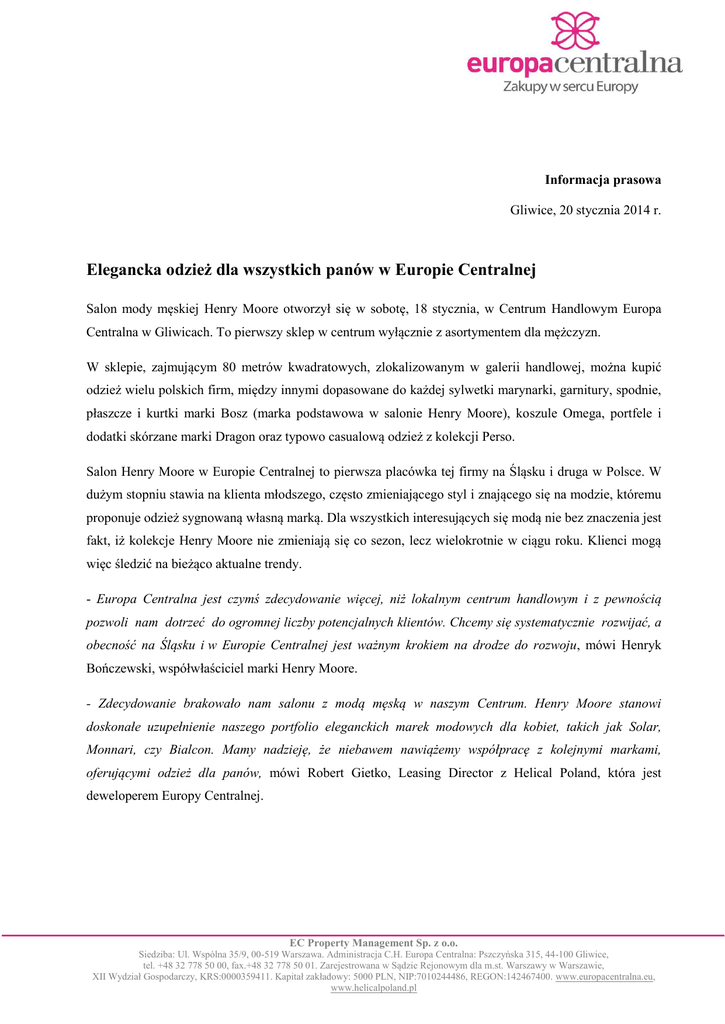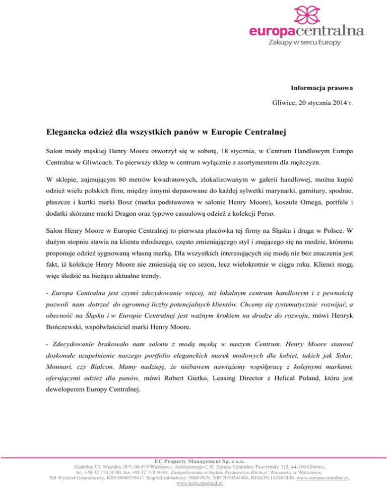 Informacja prasowa Gliwice, 20 stycznia 2014 r. Elegancka odzież dla wszystkich panów w Europie Centralnej Salon mody męskiej Henry Moore otworzył się w sobotę, 18 stycznia, w Centrum Handlowym Europa Centralna w Gliwicach. To pierwszy sklep w centrum wyłącznie z asortymentem dla mężczyzn. W sklepie, zajmującym 80 metrów kwadratowych, zlokalizowanym w galerii handlowej, można kupić odzież wielu polskich firm, między innymi dopasowane do każdej sylwetki marynarki, garnitury, spodnie, płaszcze i kurtki marki Bosz (marka podstawowa w salonie Henry Moore), koszule Omega, portfele i dodatki skórzane marki Dragon oraz typowo casualową odzież z kolekcji Perso. Salon Henry Moore w Europie Centralnej to pierwsza placówka tej firmy na Śląsku i druga w Polsce. W dużym stopniu stawia na klienta młodszego, często zmieniającego styl i znającego się na modzie, któremu proponuje odzież sygnowaną własną marką. Dla wszystkich interesujących się modą nie bez znaczenia jest fakt, iż kolekcje Henry Moore nie zmieniają się co sezon, lecz wielokrotnie w ciągu roku. Klienci mogą więc śledzić na bieżąco aktualne trendy. - Europa Centralna jest czymś zdecydowanie więcej, niż lokalnym centrum handlowym i z pewnością pozwoli nam dotrzeć do ogromnej liczby potencjalnych klientów. Chcemy się systematycznie rozwijać, a obecność na Śląsku i w Europie Centralnej jest ważnym krokiem na drodze do rozwoju, mówi Henryk Bończewski, współwłaściciel marki Henry Moore. - Zdecydowanie brakowało nam salonu z modą męską w naszym Centrum. Henry Moore stanowi doskonałe uzupełnienie naszego portfolio eleganckich marek modowych dla kobiet, takich jak Solar, Monnari, czy Bialcon. Mamy nadzieję, że niebawem nawiążemy współpracę z kolejnymi markami, oferującymi odzież dla panów, mówi Robert Gietko, Leasing Director z Helical Poland, która jest deweloperem Europy Centralnej. EC Property Management Sp. z o.o. Siedziba: Ul. Wspólna 35/9, 00-519 Warszawa. Administracja C.H. Europa Centralna: Pszczyńska 315, 44-100 Gliwice, tel. +48 32 778 50 00, fax.+48 32 778 50 01. Zarejestrowana w Sądzie Rejonowym dla m.st. Warszawy w Warszawie, XII Wydział Gospodarczy, KRS:0000359411. Kapitał zakładowy: 5000 PLN, NIP:7010244486, REGON:142467400. www.europacentralna.eu, www.helicalpoland.pl Centrum Handlowe Europa Centralna o powierzchni 67 tys. metrów kwadratowych jest jednym z największych tego typu obiektów komercyjnych w Polsce. Unikalny koncept galerii, oferuje klientom możliwość zrobienia wszystkich niezbędnych zakupów od artykułów spożywczych, przez materiały do budowy domu, po ubrania z najnowszych kolekcji. Położenie obiektu, przy jednym z największych węzłów autostradowych w Polsce (Gliwice-Sośnica), gdzie łączą się autostrady A1 i A4 i droga krajowa nr 44 oraz na obszarze gęsto zaludnionego Górnośląskiego Okręgu Przemysłowego, sprawia, że niemal 5 mln osób może w ciągu godziny dojechać tu na zakupy. Na miejscu skorzystać można z wypożyczalni parasoli, pomieszczeń dla rodziców z dziećmi, 600 miejsc siedzących dla klientów piętra restauracyjnego, paczkomatu, bezpłatnego wi-fi dostępnego na terenie całego Centrum oraz wielu bankomatów i punktów usługowych. Klienci mogą zostawić swój samochód na dużym, liczącym 2,3 tys. miejsc parkingu, a niezmotoryzowani dojadą na zakupy bezpłatnymi liniami autobusowymi. Wśród najemców są takie firmy jak: Saturn, Castorama, Tesco Extra, Jula, Ski Team, Sports Direct, Jysk, SMYK Megastore, RTV Euro AGD, New Yorker, Reserved, H&M, Cubus, Lindex, CCC, Bershka, Solar, Monnari, Clooud, Apart, TUI, Home and You, Super Pharm, Neckermann, Deichmann, City Sport, Mohito, Promod, Cortland Apple Premium Reseller, Stradivarius, Rossmann, TAKKO Fashion, Douglas, Alpenpark, ING Bank Śląski, Lilo, Henry Moore, Motherline, Bialcon, Dobrodzień i Kalwaria, AMT Studio, New York Hot Dogs, Esotiq, Nuna Lie, Restauracja Chińska, Miviena, a dla najmłodszych - Kinderplaneta. Aktualnie trwają prace aranżacyjne w dziesięciu sklepach, które otworzą się w styczniu-marcu 2014 r. Kontakt dla dziennikarzy: www.europacentralna.eu Helical Poland Sp. z o.o. ul. Wspólna 35/9 00-519 Warszawa Więcej informacji: Marta Chodkowska Tel. 601 244 127 [email protected] Marketing Director C. H .Europa Centralna Katarzyna Skalska Tel. 501 699 261 [email protected] Leasing:: Robert Gietko Tel. 605 451 060 [email protected] Marta Gołębiowska Tel. 663 918 160 [email protected] Cook Communications Tomasz Rożek Tel. 663 171 033 [email protected] Mind Progress Group Adam Piwek Tel. 515 108 476 [email protected] EC Property Management Sp. z o.o. Siedziba: Ul. Wspólna 35/9, 00-519 Warszawa. Administracja C.H. Europa Centralna: Pszczyńska 315, 44-100 Gliwice, tel. +48 32 778 50 00, fax.+48 32 778 50 01. Zarejestrowana w Sądzie Rejonowym dla m.st. Warszawy w Warszawie, XII Wydział Gospodarczy, KRS:0000359411. Kapitał zakładowy: 5000 PLN, NIP:7010244486, REGON:142467400. www.europacentralna.eu, www.helicalpoland.pl