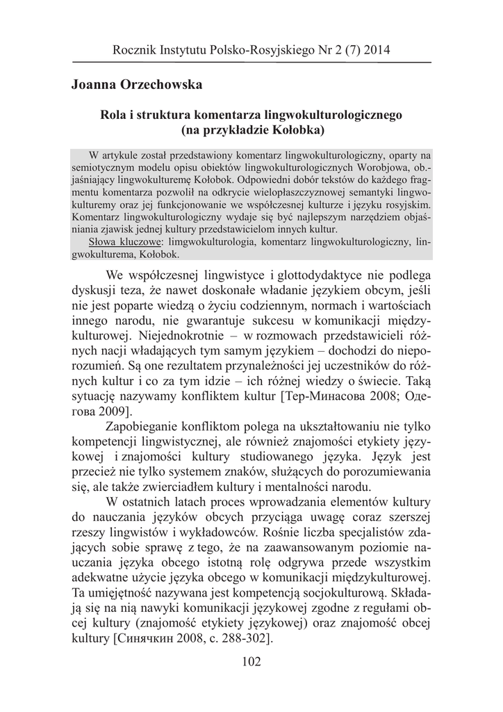 Rocznik Instytutu Polsko-Rosyjskiego Nr 2 (7) 2014 Joanna Orzechowska Rola i struktura komentarza lingwokulturologicznego (na przykładzie Kołobka) W artykule został przedstawiony komentarz lingwokulturologiczny, oparty na semiotycznym modelu opisu obiektów lingwokulturologicznych Worobjowa, ob.jaśniający lingwokulturemę Kołobok. Odpowiedni dobór tekstów do każdego fragmentu komentarza pozwolił na odkrycie wielopłaszczyznowej semantyki lingwokulturemy oraz jej funkcjonowanie we współczesnej kulturze i języku rosyjskim. Komentarz lingwokulturologiczny wydaje się być najlepszym narzędziem objaśniania zjawisk jednej kultury przedstawicielom innych kultur. Słowa kluczowe: limgwokulturologia, komentarz lingwokulturologiczny, lingwokulturema, Kołobok. We współczesnej lingwistyce i glottodydaktyce nie podlega dyskusji teza, że nawet doskonałe władanie językiem obcym, jeśli nie jest poparte wiedzą o życiu codziennym, normach i wartościach innego narodu, nie gwarantuje sukcesu w komunikacji międzykulturowej. Niejednokrotnie – w rozmowach przedstawicieli różnych nacji władających tym samym językiem – dochodzi do nieporozumień. Są one rezultatem przynależności jej uczestników do różnych kultur i co za tym idzie – ich różnej wiedzy o świecie. Taką sytuację nazywamy konfliktem kultur [Тер-Минасова 2008; Одегова 2009]. Zapobieganie konfliktom polega na ukształtowaniu nie tylko kompetencji lingwistycznej, ale również znajomości etykiety językowej i znajomości kultury studiowanego języka. Język jest przecież nie tylko systemem znaków, służących do porozumiewania się, ale także zwierciadłem kultury i mentalności narodu. W ostatnich latach proces wprowadzania elementów kultury do nauczania języków obcych przyciąga uwagę coraz szerszej rzeszy lingwistów i wykładowców. Rośnie liczba specjalistów zdających sobie sprawę z tego, że na zaawansowanym poziomie nauczania języka obcego istotną rolę odgrywa przede wszystkim adekwatne użycie języka obcego w komunikacji międzykulturowej. Ta umięjętność nazywana jest kompetencją socjokulturową. Składają się na nią nawyki komunikacji językowej zgodne z regułami obcej kultury (znajomość etykiety językowej) oraz znajomość obcej kultury [Синячкин 2008, c. 288-302]. 102 Rocznik Instytutu Polsko-Rosyjskiego Nr 2 (7) 2014 Pojęcie kompetencji socjokulturowej weszło do powszechnego użytku na początku XXI wieku, jednocześnie rozpoczęto jej aktywne wdrażanie i kształtowanie na zajęciach języka rosyjskiego jako obcego. Nieprzypadkowo więc obowiązkowym elementem egzaminów na certyfikat ze znajomości języka rosyjskiego jest test socjokulturowy (тест по социальному поведению) i realioznawczy (тест по русской цивилизации). Autorzy testów egzaminacyjnych zawarli te komponenty już na poziomie średniej znajomości języka rosyjskiego. W teście socjokulturowym pytania dotyczą etykiety językowej, czyli zasad zwracania się do osób usytuowanych na różnych szczeblach drabiny społecznej, przedstawiania się, witania i żegnania, norm różnorodnych zachowań socjalnych, takich jak uścisk rąk przy powitaniu, przepuszczanie kobiet w drzwiach, itd. [Тестовой практикум по русскому языку делового общения 2006, c. 164-167, 254-258]. Pytania w teście realioznawczym dotyczą historii Rosji, jej ustroju politycznego, podziału administracyjnego, funkcjonowania mass-mediów, kultury, sztuki, nauki, sportu. Fakt, iż na egzaminie z języka biznesu znalazły się pytania o charakterze realioznawczym, świadczy o tym, że w dialogu kultur, nawet ograniczonym do sfery współpracy gospodarczej, dobrze jest znać – na przykład – nazwiska rosyjskich laureatów nagrody Nobla z dziedzin literatury czy nauki [Тестовой практикум по русскому языку делового общения 2006, c. 169-176, 261268]. W ten sposób autorzy egzaminów certyfikujących z języka rosyjskiego wymuszają włączenie do programów nauczania elementów wiedzy o kulturze, historii i życiu codziennym Rosji, a co za tym idzie – kształtowanie kompetencji socjokulturowej. Zakłada się, że umieszczenie elementów socjokulturowych w planach i programach nauczania będzie sprzyjało współpracy i zbliżeniu narodów, likwidacji lub złagodzeniu szoku kulturowego, powstającego podczas zderzenia z obcą kulturą, formowaniu uczucia szacunku dla odmiennej kultury i obcego światopoglądu, rozwojowi tolerancji, a także lepszemu zrozumieniu własnej kultury. Nauka języka obcego w kontekście dialogu kultur daje nieograniczone możliwości kształcenia i wychowania, jeśli język wykorzystuje się jako środek poznania innej kultury i realiów, samopoznania i wyrażenia własnej osobowości w procesie komunikacji. We współczes103 Rocznik Instytutu Polsko-Rosyjskiego Nr 2 (7) 2014 nych warunkach globalizacji trudno mówić o ukształtowaniu pełnowartościowej osobowości językowej specjalisty bez kompetencji socjokulturowej. Zadaniem współczesnego nauczyciela jest więc zaprezentowanie języka nie tylko jako listy wyrazów do nauczenia się i reguł łączenia ich w mowie, ale również jako skarbnicy i zwierciadła kultury. Kształtowanie kompetencji lingwistycznej i znajomości etykiety języka rosyjskiego w polskiej glottodydaktyce ma długoletnią historię, a doświadczenie zdobyte przez nauczycieli w szkołach różnych szczebli zaowocowało różnorodnymi programami nauczania i podręcznikami dla każdego stopnia zaawansowania. Ale wciąż niejasne pozostają treść i zakres oraz sposoby zapoznania i wprowadzenia w rosyjską kulturę. Nauczyciele języków obcych mogą wykorzystać osiągnięcia nowej dyscypliny, powstałej na styku kulturologii i lingwistyki – lingwistyki kulturowej (lingwokulturologii), a szczególnie jej aspektu