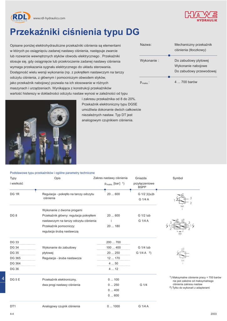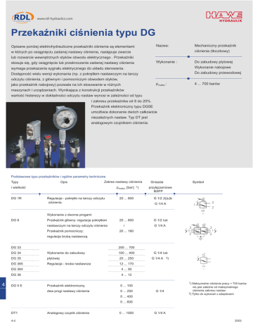 www.rdl-hydraulics.com Przekaźniki ciśnienia typu DG Nazwa: Opisane poniżej elektrohydrauliczne przekaźniki ciśnienia są elementami Mechaniczny przekaźnik ciśnienia (tłoczkowy) w których po osiągnięciu zadanej nastawy ciśnienia, następuje zwarcie lub rozwarcie wewnętrznych styków obwodu elektrycznego . Przekaźniki Wykonanie : stosuje się, gdy osiągnięcie lub przekroczenie zadanej nastawy ciśnienia Do zabudowy plytowej wymaga przekazania sygnału elektrycznego do układu sterowania. Wykonanie nabojowe Dostępność wielu wersji wykonania (np. z pokrętłem nastawczym na tarczy Do zabudowy przewodowej odczytu ciśnienia, z głównym i pomocniczym obwodem styków, p maks. : jako przekaźnik nabojowy) pozwala na ich stosowanie w różnych 4 ... 700 barów maszynach i urządzeniach. Wynikająca z konstrukcji przekaźników wartość histerezy w dokładności odczytu nastaw wynosi w zależności od typu i zakresu przekaźnika od 8 do 20%. Przekaźnik elektroniczny typu DG5E umożliwia dokonanie dwóch całkowicie niezależnych nastaw. Typ DT jest analogowym czujnikiem ciśnienia. Podstawowe typu przekaźników i ogólne parametry techniczne Typy Opis Zakres . nastawy ciśnienia i wielkość DG 1R p maks. [bar ] Regulacja - pokrętło na tarczy odczytu ciśnienia 20 ... 600 1) Gniazda Symbol przyłączeniowe BSPP G 1/2 )l))u)b G 1/4 A Wykonanie z dwoma progami DG 8 Przekaźnik główny: regulacja pokrętłem nastawczym na tarczy odczytu ciśnienia Przekaźnik pomocniczy: 20 ... 600 i G 1/2 lub G 1/4 A 20 ... 180 regulacja śrubą nastawczą DG 33 4 200 ... 700 DG 34 Wykonanie do zabudowy 100 ... 400 DG 35 płytowej 20 ... 250 DG 365 Regulacja - śruba nastawcza 12 ... 170 DG 364 4 ... 50 DG 36 4 ... 12 DG 5 E Przekaźnik elektroniczny, 0 ... 100 dwa progi nastawy ciśnienia 0 ... 250 G 1/4 lub G 1/4 A 2) 1) Maksymalne ciśnienie pracy = 700 barów G 1/4 0 ... 400 nie jest zależne od maksymalnego ciśnienia zakresu nastaw 2) Tylko do wykonań z adapterami 0 ... 600 DT1 4-4 Analogowy czujnik ciśnienia 0 ... 1000 G 1/4 A 2003 Przekaźniki ciśnienia Wykonania opcjonalne • Przekaźniki z osłoną do zabudowy na tablicach pomiarowych (typ DG 1) • Napięcia zasilania 12V DC, 24V DC, 230V AC 50/60 Hz • Przekaźniki ciśnienia z różnymi gwintami i przyłączami • Wykonania z różnymi przyłączami do zabudowy przewodowej (typ DG 3) (patrz także „Informacje dodatkowe”) • Pokrętło nastawcze z blokadą (patrz także „Informacje dodatkowe”) Przykłady zamówienia DG 1 R DG 35 Przekaźnik ciśnienia typu DG 1, Przekaźnik ciśnienia typu DG 3 z wtyczką, zakres ciśnień 40 … 160 barów zakres ciśnień 20 … 210 barów Wymiary Typ DG 1 R i DG ok. 35 ok. 140 (patrz przykłady zamówienia) a/f 27 Typ DG 3 .. (patrz przykład zamówienia) Ty p DG 5E Typ DT1 Typ ok. 75 1.3 DG 8 1.35 DG 3.. 0.3 DG 5 E 0.25 DT 1 0.15 ok. 75 a/f 19 m (kg) DG 1 a/f 30 Wymiary podano w mm, producent zastrzega sobie prawo do zmian bez uprzedzenia! ok. 34 Informacje dodatkowe •P rzekaźniki ciśnienia typu DG D 5440-PL • Przyłącza typu X D 7065-PL (elementy do uchwytów hydraulicznych, elementy sterowania pras, • Przyłącza typu X84 D 7077-PL elementy dla ciśnień do 700 barów) •E lektroniczne czujniki ciśnienia typu DG 5E D 5440 E-PL •A nalogowe czujniki ciśnienia typu DT 1 D 5440 T-PL • patrz także „Elementy do zastosowań specjalnych” Elementy opisane w informacjach dodatkowych – - patrz „Lista dostępnych produktów HAWE” 2003 4-5 www.rdl-hydraulics.com