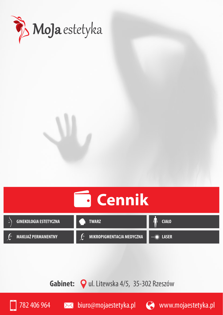Cennik GINEKOLOGIA ESTETYCZNA TWARZ CIAŁO MAKIJAŻ PERMANENTNY MIKROPIGMENTACJA MEDYCZNA LASER Gabinet: 782 406 964 ul. Litewska 4/5, 35-302 Rzeszów [email protected] www.mojaestetyka.pl Cennik GINEKOLOGIA ESTETYCZNA TWARZ CIAŁO MAKIJAŻ PERMANENTNY MIKROPIGMENTACJA MEDYCZNA LASER Ginekologia estetyczna Laserowe leczenie nietrzymania moczu Laserowy lifting pochwy Augmentacja punktu G Modelowanie warg sromowych Rewitalizacja okolic intymnych Gabinet: 782 406 964 2500 zł 2500 zł 2300 zł 2400 zł 2800 zł ul. Litewska 4/5, 35-302 Rzeszów [email protected] www.mojaestetyka.pl Cennik GINEKOLOGIA ESTETYCZNA TWARZ CIAŁO MAKIJAŻ PERMANENTNY MIKROPIGMENTACJA MEDYCZNA LASER BOTOX Czoło Lwia zmarszczka Oczy Usta palacza Pachy Dłonie Stopy 250 zł - 350 zł 250 zł - 500 zł 200 zł - 350 zł 100 zł - 300 zł 1800 zł 1800 zł 1800 zł MEZOTERAPIA Twarz Oczy Szyja Dekolt Twarz + szyja Twarz + szyja + dekolt 200 zł -500 zł 250 zł 200 zł -500 zł 200 zł -800 zł 400 zł -800 zł 600 zł -1000 zł PEELINGI MEDYCZNE Glikolowy Migdałowy Nomelan (Zestaw pozabiegowy w cenie) Cosmelan Dermamelan 180 zł -200 zł 180 zł -200 zł 450 zł 1700 zł 1700 zł WYPEŁNIACZE cena jest ustalana indywidualnie i jest uzależniona od rodzaju i ilości zużytego wypełniacza Policzki Bruzdy nosowo-wargowe Linie marionetki Usta palacza Volumetria twarzy Powiększenie/nawilżenie Gabinet: 782 406 964 ul. Litewska 4/5, 35-302 Rzeszów [email protected] www.mojaestetyka.pl Cennik GINEKOLOGIA ESTETYCZNA TWARZ CIAŁO MAKIJAŻ PERMANENTNY MIKROPIGMENTACJA MEDYCZNA LASER Depilacja laserowa: Cała twarz Wąsik Broda Policzki Pachy Plecy Przedramiona Ramiona Całe ręce Uda Łydki z kolanami Całe nogi Brzuch Tors Bikini Pośladki Pozostałe części ciała 200 zł 100 zł 100 zł 100 zł 200 zł 400 zł 200 zł 200 zł 300 zł 300 zł 300 zł 500 zł 200 zł 200 zł 300 zł 200 zł cena do uzgodnienia Radiofrekwencja Całe ciało Twarz Szyja Dekolt PAKIET: Twarz, szyja i dekolt Ramiona Dłonie Brzuch Biodra Pośladki PAKIET: Brzuch, biodra i pośladki Uda Gabinet: 782 406 964 1/2 500 zł 200 zł 100 zł 100 zł 300 zł 200 zł 100 zł 200 zł 150 zł 200 zł 350 zł 200 zł ul. Litewska 4/5, 35-302 Rzeszów [email protected] www.mojaestetyka.pl Cennik GINEKOLOGIA ESTETYCZNA TWARZ CIAŁO MAKIJAŻ PERMANENTNY MIKROPIGMENTACJA MEDYCZNA LASER Liposukcja ultradźwiękowa Ramiona Brzuch Biodra Pośladki Uda Łydki Gabinet: 782 406 964 2/2 200 zł 200 zł 200 zł 200 zł 200 zł 200 zł ul. Litewska 4/5, 35-302 Rzeszów [email protected] www.mojaestetyka.pl Cennik GINEKOLOGIA ESTETYCZNA TWARZ CIAŁO MAKIJAŻ PERMANENTNY MIKROPIGMENTACJA MEDYCZNA LASER Poniższe ceny obejmują 2 zabiegi (podstawową pigmentację oraz retusz) Usta - kontur z wypełnieniem Usta - kontur z cieniowaniem Brwi (metodą cieniowania lub włoskową) Kreski na powiekach górnych Kreski na powiekach dolnych Kreski na powiekach górnych i dolnych Gabinet: 782 406 964 800 zł 700 zł 700 zł 500 zł 400 zł 700 zł ul. Litewska 4/5, 35-302 Rzeszów [email protected] www.mojaestetyka.pl Cennik GINEKOLOGIA ESTETYCZNA TWARZ CIAŁO MAKIJAŻ PERMANENTNY MIKROPIGMENTACJA MEDYCZNA LASER Mikropigmentacja medyczna Rekonstrukcja brodawki piersiowej Tuszowanie blizn Odtwarzanie miejscowego braku owłosienia na skórze głowy 600 zł 250 zł/cm cena do uzgodnienia Zastosowanie: * W chirurgii plastycznej; można zatuszować blizny pozostałe po operacjach liftingu twarzy, skorygować zniekształconą wargę po rozszczepie oraz zrekonstruować trwałe uszkodzenia brwi, rzęs i włosów. * Po operacjach plastycznych piersi można zregenerować brodawki poprzez ich zabarwianie. * W onkologii; u kobiet, którym usunięto sutek, można zrekonstruować brodawki poprzez ich domalowanie. * Po chemioterapii, można wizualnie odtworzyć brak włosków na łuku brwiowym, rzęsach oraz uzyskać efekt strzyżonego włosa na skórze głowy. * W dermatologii; można skorygować małe defekty skóry. * W ginekologii; tuszuje się blizny po cesarskim cięciu. Dzięki mikropigmentacji medycznej wiele osób odzyskuje komfort psychiczny i pewność siebie. Gabinet: 782 406 964 ul. Litewska 4/5, 35-302 Rzeszów [email protected] www.mojaestetyka.pl Cennik GINEKOLOGIA ESTETYCZNA TWARZ CIAŁO MAKIJAŻ PERMANENTNY MIKROPIGMENTACJA MEDYCZNA LASER 1/2 Fotoodmładzanie T3 Twarz Szyja Dekolt PAKIET (twarz, szyja, dekolt) 300 zł 200 zł 200 zł 600 zł Frakcjonowanie 3D – głęboki lifting skóry Twarz PAKIET I (twarz, szyja) PAKIET II (twarz, szyja, dekolt) 500 zł 600 zł 700 zł Frakcjonowanie z efektem smooth - mocne ujędrnianie skóry Twarz Twarz+szyja Twarz+szyja+dekolt Dłonie 600 zł 800 zł 1000 zł 300 zł Peeling laserowy frakcyjny – tryb delikatny Twarz Szyja Dekolt Twarz+szyja Twarz+szyja+dekolt Dłonie 400 zł 300 zł 300 zł 600 zł 700 zł 200 zł Peeling laserowy frakcyjny-tryb średni Twarz Szyja Dekolt Twarz+szyja Twarz+szyja+dekolt Gabinet: 782 406 964 500 zł - 1000 zł 350 zł - 700 zł 350 zł - 700 zł 600 zł - 1200 zł 750 zł - 1500 zł ul. Litewska 4/5, 35-302 Rzeszów [email protected] www.mojaestetyka.pl Cennik GINEKOLOGIA ESTETYCZNA TWARZ CIAŁO MAKIJAŻ PERMANENTNY MIKROPIGMENTACJA MEDYCZNA LASER 2/2 Usuwanie rumienia naczyniowego Twarz Policzki Nos Szyja Dekolt 300 zł - 500 zł 200 zł 100 zł 200 zł 200 zł Usuwanie naczynek Pojedyncze naczynko Nos Twarz Szyja Dekolt Plamki rubinowe 100 zł 200 zł 400 zł - 600 zł 200 zł - 300 zł 300 zł - 400 zł 50 zł - 100 zł Usuwanie przebarwień Pojedyncze przebarwienie 100 zł - 150 zł Usuwanie blizn Zależność od powierzchni 100 zł - 500 zł Leczenie trądziku Twarz Usuwanie blizn potrądzikowych 200 zł - 500 zł 600 zł - 1500 zł Leczenie grzybicy paznokci 1 paznokieć Większa ilość 100 zł wycena indywidualna Leczenie chrapania 1 zabieg Pakiet 3 zabiegów Gabinet: 782 406 964 500 zł 1100 zł ul. Litewska 4/5, 35-302 Rzeszów [email protected] www.mojaestetyka.pl