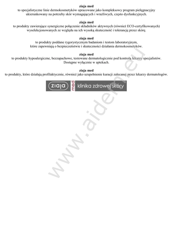 ziaja med to specjalistyczne linie dermokosmetyków opracowane jako kompleksowy program pielęgnacyjny ukierunkowany na potrzeby skór wymagających i wrażliwych, często dysfunkcyjnych. ziaja med to produkty zawierające synergiczne połączenie składników aktywnych (również ECO-certyfikowanych) wyselekcjonowanych ze względu na ich wysoką skuteczność i tolerancję przez skórę. ziaja med to produkty poddane rygorystycznym badaniom i testom laboratoryjnym, które zapewniają o bezpieczeństwie i skuteczności działania dermokosmetyków. ziaja med to produkty hypoalergiczne, bezzapachowe, testowane dermatologicznie pod kontrolą lekarzy specjalistów. Dostępne wyłącznie w aptekach. ziaja med to produkty, które działają profilaktycznie, również jako uzupełnienie kuracji zalecanej przez lekarzy dermatologów. Kuracja nawilżająca Dla skóry suchej, bardzo suchej i wrażliwej jest skutecznym rozwiązaniem problemów skóry odwodnionej, której suchość przyczynia się do pogłębiania uczucia ściągnięcia skóry nadmiernie wrażliwej na bodźce o różnym charakterze (promienie UV, gorąco, zimno, wiatr, kosmetyki, mydło, woda, zanieczyszczenia, stres). Jest odpowiednią pielęgnacją opartą na synergicznym połączeniu substancji aktywnych i bezzapachowych receptur. Optymalizuje próg tolerancji skóry i zapewnia wysoką skuteczność łagodzenia, odpowiednio do pochodzenia rozległości podrażnień I stopnia wrażliwości skóry. Balsam Bogata emulsja regenerująca bez kompozycji zapachowej. Działanie Wzrost nawilżenia Wiąże wodę oraz zapobiega jej nadmiernej utracie. Intensywnie i trwale nawilża głębsze warstwy skóry. Zapobiega przesuszaniu naskórka. Redukcja podrażnień Przyspiesza regenerację zewnętrznych warstw naskórka. Zmniejsza tendencję skóry do nadwrażliwości. Redukuje istniejące podrażnienia. Kompensacja Uzupełnia niedobór naturalnych substancji odżywczych. Poprawia elastyczność i miękkość naskórka. Stosowanie: Balsam wmasować w skórę i pozostawić do wchłonięcia. Substancje aktywne Prowitamina B5 (D-panthenol), która w skórze ulega przekształceniu w witaminę B5 Doskonały składnik pielęgnacyjny, który posiada zastosowanie we wszystkich preparatach pielęgnacyjnych. Intensywnie nawilża, zmiękcza i uelastycznia naskórek. Skutecznie łagodzi podrażnienia, działa kojąco i osłaniająco na nadmiernie wrażliwą skórę oraz błony śluzowe. Alantoina Działa intensywnie nawilżająco i zapobiega nadmiernej utracie wody. Przyspiesza procesy odnowy naskórka oraz łagodzi podrażnienia. Wygładza i zmiękcza naskórek. Opakowanie 500 ml Krem redukujący zmarszczki na noc Bogata emulsja regenerująca z wykorzystaniem ECO-certyfikowanych surowców, bez kompozycji zapachowej. Redukcja zmarszczek Wzmacnia włókna kolagenowe. Redukuje głębokość zmarszczek. Poprawia gładkość oraz jędrność skóry. Redukcja podrażnień Przyspiesza regenerację zewnętrznych warstw naskórka. Zmniejsza tendencję skóry do nadwrażliwości. Redukuje istniejące podrażnienia. Kompensacja Intensywnie i trwale nawilża głębsze warstwy skóry. Uzupełnia niedobór naturalnych substancji odżywczych. Neutralizuje wolne rodniki. Stosowanie Krem nanieść na skórę twarzy, szyi i dekoltu, delikatnie wklepać. W przypadku skóry bardzo suchej można stosować na dzień. Substancje aktywne Prowitamina B5 (D-panthenol), która w skórze ulega przekształceniu w witaminę B5 Doskonały składnik pielęgnacyjny, który posiada zastosowanie we wszystkich preparatach pielęgnacyjnych. Intensywnie nawilża, zmiękcza i uelastycznia naskórek. Skutecznie łagodzi podrażnienia, działa kojąco i osłaniająco na nadmiernie wrażliwą skórę oraz błony śluzowe. Oligopeptydy (mikro-kolagen) Diagnozuje uszkodzenia na poziomie komórkowym i sygnalizuje rozpoczęcie procesów odnowy tkankowej w skórze właściwej. Stymuluje syntezę kolagenu III i IV, elastyny oraz polisacharydów (glikozoaminoglikanów i kwasu hialuronowego). Wyraźnie wzmacnia struktury białkowo - lipidowe skóry. Hamuje proces starzenia i skutecznie redukuje głębokie oraz powierzchniowe zmarszczki. Zapobiega wiotczeniu naskórka, poprawia jego napięcie i sprężystość. Olej Canola Ze względu na wysoką zawartość tokoferoli (witaminy E) oraz fitosteroli posiada silne właściwości łagodzące i przeciwzapalne. Stosowany jako emolient zmniejsza stres oksydacyjny komórek spowodowany promieniowaniem UV oraz zanieczyszczeniem środowiska. Chroni białka oraz wielonienasycone kwasy tłuszczowe błon komórkowych przed utlenieniem. Neutralizuje wolne rodniki odpowiedzialne za starzenie się skóry. Zapobiega transepidermalnej utracie wody z naskórka, trwale nawilża naskórek i głębsze warstwy skóry. Kwas hialuronowy Jest naturalnym składnikiem mukopolisacharydów, wchodzących w skład skóry właściwej. Tworzy naturalny film wzmacniający barierę hydrolipidową skóry. Aktywnie nawilża i zapobiega transepidermalnej utracie wody ze skóry. Alantoina Działa intensywnie nawilżająco i zapobiega nadmiernej utracie wody. Przyspiesza procesy odnowy naskórka oraz łagodzi podrażnienia. Wygładza i zmiękcza naskórek. Opakowanie 50 ml Krem redukujący podrażnienia na dzień Bogata emulsja regenerująca z wykorzystaniem ECO-certyfikowanych surowców. Bez kompozycji zapachowej. Ochrona niska SPF 6 Wzrost nawilżenia Wiąże wodę oraz zapobiega jej nadmiernej utracie. Intensywnie i trwale nawilża głębsze warstwy skóry. Zapobiega przesuszaniu naskórka. Redukcja podrażnień Przyspiesza regenerację zewnętrznych warstw naskórka. Zmniejsza tendencję skóry do nadwrażliwości. Redukuje istniejące podrażnienia. Kompensacja Zapewnia skuteczną ochronę przed promieniowaniem UV. Uzupełnia niedobór naturalnych substancji odżywczych. Neutralizuje wolne rodniki. Stosowanie Krem nanieść na skórę twarzy, szyi i dekoltu, delikatnie wklepać. Substancje ak