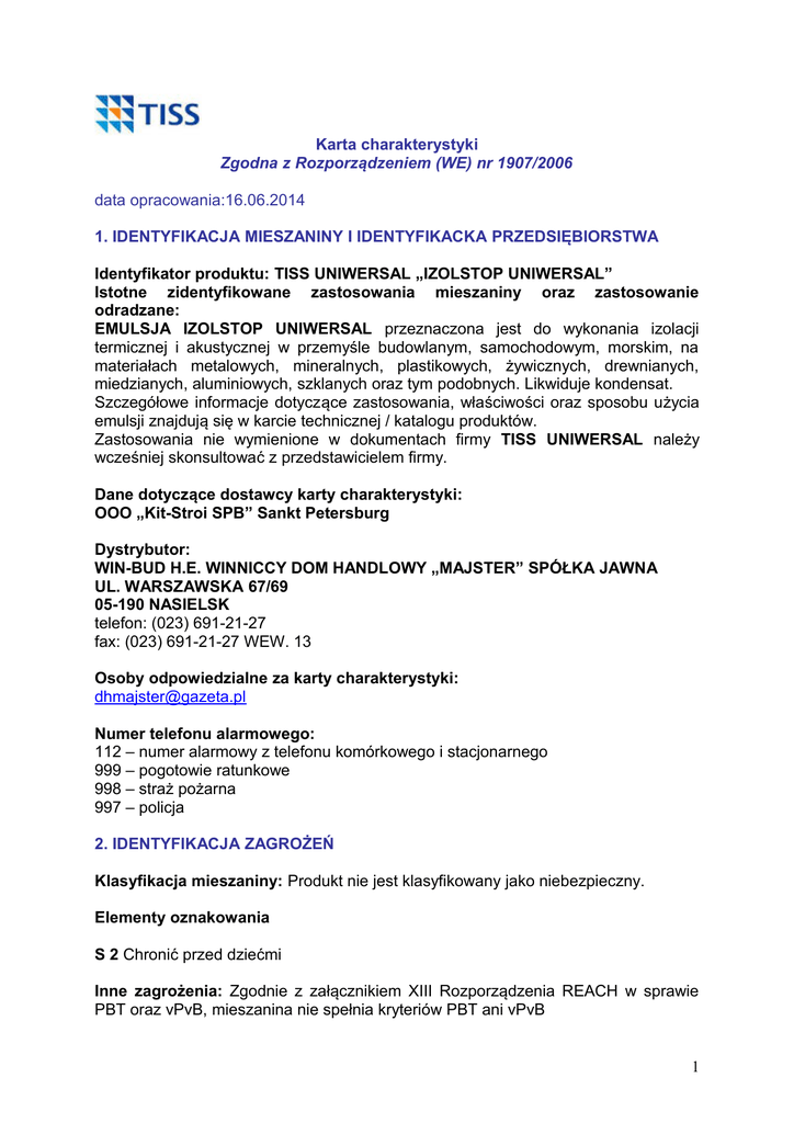 Karta charakterystyki Zgodna z Rozporządzeniem (WE) nr 1907/2006 data opracowania:16.06.2014 1. IDENTYFIKACJA MIESZANINY I IDENTYFIKACKA PRZEDSIĘBIORSTWA 1Sekcja NTYFIKACJA MIESZANINY I IDENTYFIKAEDSIĘBIORSTW A Identyfikator produktu: TISS UNIWERSAL „IZOLSTOP UNIWERSAL” Istotne zidentyfikowane zastosowania mieszaniny oraz zastosowanie odradzane: EMULSJA IZOLSTOP UNIWERSAL przeznaczona jest do wykonania izolacji termicznej i akustycznej w przemyśle budowlanym, samochodowym, morskim, na materiałach metalowych, mineralnych, plastikowych, żywicznych, drewnianych, miedzianych, aluminiowych, szklanych oraz tym podobnych. Likwiduje kondensat. Szczegółowe informacje dotyczące zastosowania, właściwości oraz sposobu użycia emulsji znajdują się w karcie technicznej / katalogu produktów. Zastosowania nie wymienione w dokumentach firmy TISS UNIWERSAL należy wcześniej skonsultować z przedstawicielem firmy. Dane dotyczące dostawcy karty charakterystyki: OOO „Kit-Stroi SPB” Sankt Petersburg Dystrybutor: WIN-BUD H.E. WINNICCY DOM HANDLOWY „MAJSTER” SPÓŁKA JAWNA UL. WARSZAWSKA 67/69 05-190 NASIELSK telefon: (023) 691-21-27 fax: (023) 691-21-27 WEW. 13 Osoby odpowiedzialne za karty charakterystyki: [email protected] Numer telefonu alarmowego: 112 – numer alarmowy z telefonu komórkowego i stacjonarnego 999 – pogotowie ratunkowe 998 – straż pożarna 997 – policja 2. IDENTYFIKACJA ZAGROŻEŃ a 2. IDENTYFIKACJA ZAGROŻEŃ Klasyfikacja mieszaniny: Produkt nie jest klasyfikowany jako niebezpieczny. Elementy oznakowania S 2 Chronić przed dziećmi Inne zagrożenia: Zgodnie z załącznikiem XIII Rozporządzenia REACH w sprawie PBT oraz vPvB, mieszanina nie spełnia kryteriów PBT ani vPvB 1 ekcja 3. SKŁAD / INFORMACJA O SKŁADNIKACH Karta charakterystyki Zgodna z Rozporządzeniem (WE) nr 1907/2006 data opracowania:16.06.2014 3. SKŁAD Substancja: Nie dotyczy Mieszanina: Mieszanina wodnych jednoskładnikowych spoiw akrylowych w formie formaldehydu oraz mikrogranulki kwarcu i perlitu Substancje stwarzające zagrożenie w miejscu pracy: Brak Inne informacje: Do klasyfikacji produktu przyjęto rzeczywistą zawartość składników niebezpiecznych. Okres przechowywania produktu w warunkach zgodnych z punktem 7, wynosi 12 miesięcy od daty produkcji umieszczonej na opakowaniu. 4. ŚRODKI PIERWSZEJ POMOCY Sekcja 4. ŚRODKI PIERWSZEJ POMOCY Opis środków pierwszej pomocy Po wdychaniu Osobę poszkodowaną wyprowadzić na świeże powietrze i obserwować, w przypadku wystąpienia trudności w oddychaniu, zawrotów głowy, nudności lub utraty przytomności natychmiast wezwać pomoc medyczną. W przypadku zatrzymania oddechu zastosować wspomaganie oddechu lub sztuczne oddychanie. Po kontakcie ze skórą: Zdjąć zanieczyszczoną odzież. Miejsce wystawione na działanie mieszaniny spłukać wodą a następnie umyć mydłem. Po kontakcie z oczami: Nie trzeć oczu. Natychmiast opłukać dużą ilością wody przez minimum 15 min, podczas płukania trzymać oczy szeroko otwarte. Wyjąć soczewki kontaktowe. Konieczna konsultacja okulistyczna. Po połknięciu: Nie wywoływać wymiotów, nie podawać niczego doustnie. Skontaktować się z lekarzem. Najważniejsze ostre i opóźnione objawy oraz skutki narażenia Należy przestrzegać uwag dotyczących bezpieczeństwa i użytkowania zamieszczonych na etykiecie. Natychmiast usuwać produkt ze skóry, oczu i śluzówek, co pozwoli zapobiec wszelkim opóźnionym skutkom narażenia. 2 Karta charakterystyki Zgodna z Rozporządzeniem (WE) nr 1907/2006 data opracowania:16.06.2014 Wskazania dotyczące wszelkiej natychmiastowej pomocy lekarskiej i szczególnego postępowania z poszkodowanym W przypadku wystąpienia jakichkolwiek niepokojących objawów wezwać natychmiast pomoc medyczną, pokazać kartę charakterystyki, opakowanie lub etykietę. W przypadku kontaktu z oczami lub śluzówkami wskazana jest konsultacja medyczna. Wskazany jest dostęp do bieżącej wody. W przypadku wielokrotnego lub długotrwałego kontaktu ze skórą stosować kremy ochronne. 5. POSTĘPOWANIE W PRZYPADKU POŻARU Każdy pracownik powinien zasięgnąć informacji na temat zagrożeń pożarowych na jego stanowisku pracy i w najbliższym otoczeniu. Stanowisko pracy powinno być utrzymane w należytym porządku. Materiały łatwopalne nie mogą znajdować się w pobliżu urządzeń elektrycznych, piecyków czy innych źródeł ognia. W przypadku powstania pożaru należy niezwłocznie, przy użyciu wszystkich dostępnych środków, zaalarmować osoby będące w strefie zagrożenia i wezwać straż pożarną (patrz: punkt 1.4) podając niezbędne informacje umożliwiające rozpoczęcie akcji przeciwpożarowej (podać gdzie powstało zdarzenie - dokładny adres, co się pali lub jaki rodzaj zagrożenia zaistniał, czy istnieje zagrożenie dla życia ludzkiego, nr telefonu, z którego się alarmuje oraz swoje imię i nazwisko). Następnie przystąpić niezwłocznie, przy użyciu miejscowych środków gaśniczych do gaszenia pożaru i nieść pomoc osobom zagrożonym w przypadku koniecznym przystąpić do ewakuacji ludzi i mienia. Należy czynności te wykonać w taki sposób aby nie doszło do powstania paniki jaka może ogarnąć ludzi będących w zagrożeniu, które wywołuje u ludzi ogień i dym. Panika może być przyczyną niepotrzebnych i tragicznych w skutkach wypadków w trakcie prowadzenia działań ratowniczo gaśniczych. Dlatego prowadząc jakiekolwiek działania w przypadku powstania pożar należy kierować się rozwagą w podejmowaniu decyzji. Do czasu przybycia straży pożarnej kierowanie akcją obejmuje specjalnie do tej funkcji powołana osoba. Należy pamiętać o ochronie dróg oddechowych przed dymem poprzez stosowanie zwilżonych chusteczek oraz poruszania się w dolnych partiach w pomieszczeniach o dużym stopniu zadymienia. Odpowiednie środki gaśnicze: Piana, proszki gaśnicze, piasek, dwutlenek węgla, woda – prądy rozproszone. Niewłaś