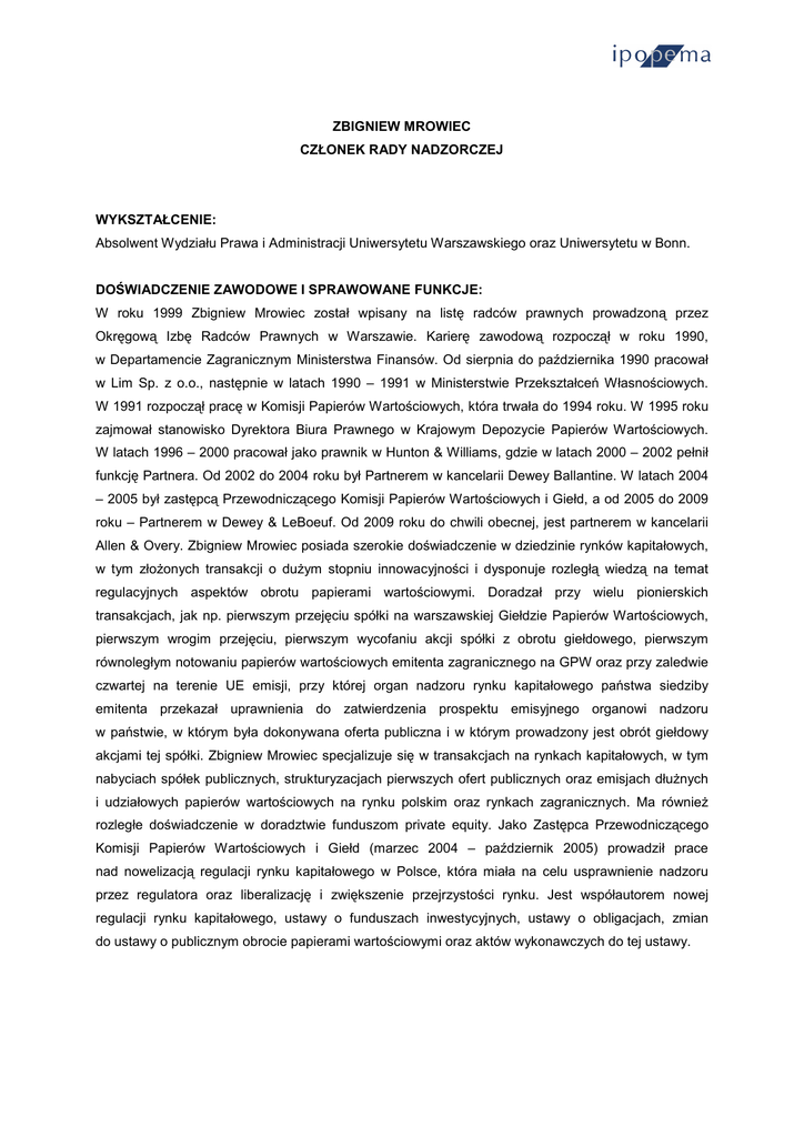ZBIGNIEW MROWIEC CZŁONEK RADY NADZORCZEJ WYKSZTAŁCENIE: Absolwent Wydziału Prawa i Administracji Uniwersytetu Warszawskiego oraz Uniwersytetu w Bonn. DOŚWIADCZENIE ZAWODOWE I SPRAWOWANE FUNKCJE: W roku 1999 Zbigniew Mrowiec został wpisany na listę radców prawnych prowadzoną przez Okręgową Izbę Radców Prawnych w Warszawie. Karierę zawodową rozpoczął w roku 1990, w Departamencie Zagranicznym Ministerstwa Finansów. Od sierpnia do października 1990 pracował w Lim Sp. z o.o., następnie w latach 1990 – 1991 w Ministerstwie Przekształceń Własnościowych. W 1991 rozpoczął pracę w Komisji Papierów Wartościowych, która trwała do 1994 roku. W 1995 roku zajmował stanowisko Dyrektora Biura Prawnego w Krajowym Depozycie Papierów Wartościowych. W latach 1996 – 2000 pracował jako prawnik w Hunton & Williams, gdzie w latach 2000 – 2002 pełnił funkcję Partnera. Od 2002 do 2004 roku był Partnerem w kancelarii Dewey Ballantine. W latach 2004 – 2005 był zastępcą Przewodniczącego Komisji Papierów Wartościowych i Giełd, a od 2005 do 2009 roku – Partnerem w Dewey & LeBoeuf. Od 2009 roku do chwili obecnej, jest partnerem w kancelarii Allen & Overy. Zbigniew Mrowiec posiada szerokie doświadczenie w dziedzinie rynków kapitałowych, w tym złożonych transakcji o dużym stopniu innowacyjności i dysponuje rozległą wiedzą na temat regulacyjnych aspektów obrotu papierami wartościowymi. Doradzał przy wielu pionierskich transakcjach, jak np. pierwszym przejęciu spółki na warszawskiej Giełdzie Papierów Wartościowych, pierwszym wrogim przejęciu, pierwszym wycofaniu akcji spółki z obrotu giełdowego, pierwszym równoległym notowaniu papierów wartościowych emitenta zagranicznego na GPW oraz przy zaledwie czwartej na terenie UE emisji, przy której organ nadzoru rynku kapitałowego państwa siedziby emitenta przekazał uprawnienia do zatwierdzenia prospektu emisyjnego organowi nadzoru w państwie, w którym była dokonywana oferta publiczna i w którym prowadzony jest obrót giełdowy akcjami tej spółki. Zbigniew Mrowiec specjalizuje się w transakcjach na rynkach kapitałowych, w tym nabyciach spółek publicznych, strukturyzacjach pierwszych ofert publicznych oraz emisjach dłużnych i udziałowych papierów wartościowych na rynku polskim oraz rynkach zagranicznych. Ma również rozległe doświadczenie w doradztwie funduszom private equity. Jako Zastępca Przewodniczącego Komisji Papierów Wartościowych i Giełd (marzec 2004 – październik 2005) prowadził prace nad nowelizacją regulacji rynku kapitałowego w Polsce, która miała na celu usprawnienie nadzoru przez regulatora oraz liberalizację i zwiększenie przejrzystości rynku. Jest współautorem nowej regulacji rynku kapitałowego, ustawy o funduszach inwestycyjnych, ustawy o obligacjach, zmian do ustawy o publicznym obrocie papierami wartościowymi oraz aktów wykonawczych do tej ustawy.