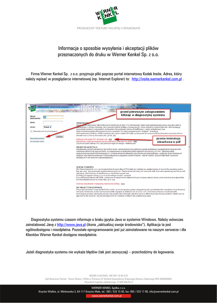 Informacja o sposobie wysyłania i akceptacji plików przeznaczonych do druku w Werner Kenkel Sp. z o.o. Firma Werner Kenkel Sp. z o.o. przyjmuje pliki poprzez portal internetowy Kodak Insite. Adres, który należy wpisać w przeglądarce internetowej (np. Internet Explorer) to: http://insite.wernerkenkel.com.pl . Diagnostyka systemu czasem informuje o braku języka Java w systemie Windows. Należy wówczas zainstalować Javę z http://www.java.pl (ikona „zaktualizuj swoje środowisko”). Aplikacja ta jest ogólnodostępna i nieodpłatna. Pozostałe oprogramowanie jest już zainstalowane na naszym serwerze i dla Klientów Werner Kenkel dostępne nieodpłatnie. Jeżeli diagnostyka systemu nie wykaże błędów (tak jest zazwyczaj) – przechodzimy do logowania. LOGOWANIE: Login i hasło Klient otrzymuje mailem automatycznie wygenerowanym z systemu. Aby było to możliwe we wstępnym etapie rozmów handlowych należy podać nazwisko i imię oraz mail osoby (osób), która będzie zajmowała się wysyłką i akceptacją plików. Widok po zalogowaniu: W dolnej części widoczna jest lista prac (w omawianym przykładzie 0000-4-L nowa praca). Wszystkie wykonane prace są widoczne po zmianie menu z „wszystkie aktywne” na "wszystkie zadania". Domyślnie są widoczne tylko aktywne. Widok po kliknięciu w nazwę pracy: WYSYŁANIE PLIKU z zastosowaniem techniki Java: (na komputerze użytkownika musi być zainstalowane środowisko Java). Pliki wysyła się klikając w klawisz „wyślij plik”: Po kliknięciu na ten klawisz otwiera się okno: Należy przeciągnąć wybrany plik na okno lub wybrać plik z katalogów komputera. Możliwe jest wysyłanie dowolnego rodzaju pliku. Przez system przetwarzane są jednak tylko plik PDF, PS lub eps. Pozostałe pliki są zachowywane w odpowiednich katalogach Systemu. Potwierdzenie wysłania pliku: W trakcie wysyłania pliku widoczne jest okno postępu. Przesłany plik zostanie przeanalizowany i zinterpretowany przez system Kodak Prinergy. Po zakończeniu wysyłki pliku: WYSYŁANIE PLIKU z zastosowaniem techniki Flash: (na komputerze użytkownika musi być zainstalowane oprogramowanie obsługujące technologię Flash). Pliki wysyła się klikając w klawisz „wyślij plik”: Po kliknięciu na ten klawisz otwiera się okno: POBIERANIE PLIKU: Po otwarciu zakładki „strony” możliwe jest pobranie pliku po interpretacji przez System Kodak Prinergy. Czasem aby plik był widoczny należy odświeżyć przeglądarkę naciskając F5. Zazwyczaj Klienci pobierają plik w celu archiwizacji we własnych zasobach lub w celu przesłania go do innych lokalizacji. Jeżeli pobrany plik ma być dalej przetwarzany, lub dokładnie analizowany – zaleca się pobranie pliku o wysokiej rozdzielczości. Dla celów zwykłego podglądu wystarczy pobrać lekki plik .jpg. Okno pobierania do wybranej lokalizacji na własnym komputerze: PODGLĄD PLIKU: Po wybraniu zakładki „strony” widoczna jest miniaturka przesłanego pliku. W zależności od zajętości systemu miniaturka ta pokazuje się zazwyczaj po chwili. Czasem należy odświeżyć przeglądarkę naciskając na klawiaturze F5. Po kliknięciu na nazwę pliku można oglądnąć jego zawartość po interpretacji przez System Kodak Prinergy. Otwiera się wówczas tzw. Smart Review. Sprawdzany plik będzie więc wyglądał na monitorze dokładnie tak jak będzie wydrukowany. Aby ułatwić oglądanie pliku przeznaczonego do druku system jest wyposażony w parę prostych w użyciu narzędzi (np. lupa, podgląd pliku w separacjach barwnych, dodawanie adnotacji, zaznaczanie obszarów itp). Tak załadowany plik zostanie zachowany w systemie. System automatycznie informuje odpowiednie osoby (dział handlowy, graficzny) o dostarczeniu pliku. Po sprawdzeniu poprawności pliku przez grafika Werner Kenkel – Klient zostanie poproszony o akceptację pliku do druku. Przesłane pliki zazwyczaj wymagają ingerencji grafika. Jest to związane z ostatnimi (niewielkimi) poprawkami zgłaszanymi przez Klienta lub z koniecznością zachowania wymogów technologicznych produkcji opakowania. Dział Graficzny Werner Kenkel Sp. z o.o. nie jest nastawiony na wykonywanie dużych zmian w grafice ani tym bardziej na wykonywanie grafiki od stadium początkowego. Tę część pracy zazwyczaj wykonują Studia zewnętrzne z którymi współpracują Klienci na etapie projektu graficznego. AKCEPTACJA LUB ODRZUCENIE PLIKU: Po naniesieniu niezbędnych poprawek przez grafika Werner Kenkel, Klient jest proszony o akceptację pliku do druku. Dzieje się to za pomocą automatycznego maila wysyłanego na adres Klienta. Przykład automatycznego maila: Klkient po zalogowaniu do InSite http://insite.wernerkenkel.com.pl widzi plik do akceptacji: Kliknięcie w nazwę pliku umożliwia oglądnęcie i sprawdzenie pliku w omawianym wcześniej Smart Review. Jeżeli plik jest zgodny z oczekiwaniami – należy zaakceptować plik. Jeżeli plik w jakikolwiek sposób nie jest zgodny z wymaganiami Klienta – należy plik odrzucić. Akceptacja (zielona ikonka) bądź odrzucenie (czerwona ikonka) decydują o dalszej pracy. Odrzucenie pliku uniemożliwia (automatyczna blokada) użycie pliku do druku – zatem zlikwidowana jest możliwość pomyłki. W przypadku odrzucenia pliku wskazany jest kontakt z działem handlowym lub graficznym Werner Kenkel. Pomocnym może być również naniesienie uwag za pomocą narzędzia „T” dostępnego po prawej stronie okna Smart Review. Stan po akceptacji (zatwierdzeniu) pliku widoczny w InSite w zakładce strony: O zatwierdzeniu lub odrzuceniu pliku automatycznie (mailowo) są informowane odpowiednie działy Werner Kenkel. Na życzenie Klienta system może również wysyłać podobne powiadomienia pod wskazane adresy mailowe. Możliwa jest odmienna konfiguracja użytkowników InSite – różniąca się prawami i zakresem możliwości pracy z plikami i kolejnymi pracami. HISTORIA PRACY (LOG): W zakładce „historia” udostępniona jest i