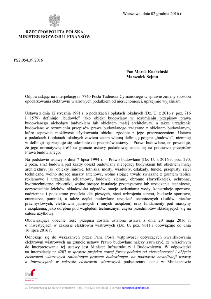 Warszawa, dnia 02 grudnia 2016 r. RZECZPOSPOLITA POLSKA MINISTER ROZWOJU I FINANSÓW PS2.054.39.2016 Pan Marek Kuchciński Marszałek Sejmu Odpowiadając na interpelację nr 7740 Posła Tadeusza Cymańskiego w sprawie zmiany sposobu opodatkowania elektrowni wiatrowych podatkiem od nieruchomości, uprzejmie wyjaśniam. Ustawa z dnia 12 stycznia 1991 r. o podatkach i opłatach lokalnych (Dz. U. z 2016 r. poz. 716 i 1579) definiuje „budowlę” jako obiekt budowlany w rozumieniu przepisów prawa budowlanego niebędący budynkiem lub obiektem małej architektury, a także urządzenie budowlane w rozumieniu przepisów prawa budowlanego związane z obiektem budowlanym, które zapewnia możliwość użytkowania obiektu zgodnie z jego przeznaczeniem. Ustawa o podatkach i opłatach lokalnych zawiera zatem własną definicję pojęcia „budowla”, niemniej w definicji tej znajduje się odesłanie do przepisów ustawy – Prawo budowlane, co powoduje, że jego normatywną treść na gruncie ustawy podatkowej ustala się na podstawie przepisów Prawa budowlanego. Na podstawie ustawy z dnia 7 lipca 1994 r. – Prawo budowlane (Dz. U. z 2016 r. poz. 290, z późn. zm.) budowlą jest każdy obiekt budowlany niebędący budynkiem lub obiektem małej architektury, jak: obiekty liniowe, lotniska, mosty, wiadukty, estakady, tunele, przepusty, sieci techniczne, wolno stojące maszty antenowe, wolno stojące trwale związane z gruntem tablice reklamowe i urządzenia reklamowe, budowle ziemne, obronne (fortyfikacje), ochronne, hydrotechniczne, zbiorniki, wolno stojące instalacje przemysłowe lub urządzenia techniczne, oczyszczalnie ścieków, składowiska odpadów, stacje uzdatniania wody, konstrukcje oporowe, nadziemne i podziemne przejścia dla pieszych, sieci uzbrojenia terenu, budowle sportowe, cmentarze, pomniki, a także części budowlane urządzeń technicznych (kotłów, pieców przemysłowych, elektrowni jądrowych i innych urządzeń) oraz fundamenty pod maszyny i urządzenia, jako odrębne pod względem technicznym części przedmiotów składających się na całość użytkową. Obowiązująca obecnie treść przepisu została ustalona ustawą z dnia 20 maja 2016 r. o inwestycjach w zakresie elektrowni wiatrowych (Dz. U. poz. 961) i obowiązuje od dnia 16 lipca 2016 r. Odnosząc się do wskazanych przez Pana Posła wątpliwości dotyczących kwalifikowania elektrowni wiatrowych na gruncie ustawy Prawo budowlane należy zauważyć, że właściwym do interpretowania tej ustawy jest Minister Infrastruktury i Budownictwa. W odpowiedzi na interpelację nr 4207 w sprawie projektu nowej formy podatku od nieruchomości i objęcia elektrowni wiatrowych zmienionym prawem budowlanym, na podstawie nowelizacji ustawy o inwestycjach w zakresie elektrowni wiatrowych podsekretarz stanu w Ministerstwie ul. Świętokrzyska 12, 00-916 Warszawa | tel.: +48 (22) 694 55 55 | e-mail: [email protected] Infrastruktury i Budownictwa Pan Tomasz Żuchowski udzielił wyjaśnienia, że elektrownia wiatrowa wraz z urządzeniami technicznymi (wirnik z zespołem łopat, zespół przeniesienia napędu, generator prądotwórczy, układy sterowania i zespół gondoli wraz z mocowaniem i mechanizmem obrotu) wypełnia przesłanki budowli będącej wolno stojącym urządzeniem technicznym. Odpowiedź na interpelację dostępna jest na stronie internetowej Sejmu RP (link do strony: http://www.sejm.gov.pl/Sejm8.nsf/InterpelacjaTresc.xsp?key=1A2CA8FE ). Od dnia 16 lipca 2016 r. elektrownia wiatrowa zatem w całości stanowi obiekt budowlany (budowlę) w rozumieniu ustawy Prawo budowlane, co wynika, jak wskazano powyżej, z aktualnej definicji „budowli”, zawartej w tej ustawie, jak również z Załącznika do niej, gdzie elektrownie wiatrowe zostały wprost wymienione jako obiekt budowlany (kategoria XXIX Załącznika). Potwierdza to również uzasadnienie do poselskiego projektu ustawy o inwestycjach w zakresie elektrowni wiatrowych, w którym stwierdzono, że „W projekcie ustawy zaproponowano wykreślenie przepisu wprowadzającego podział elektrowni wiatrowych na część budowlaną i niebudowlaną. W proponowanym stanie prawnym cała elektrownia wiatrowa będzie obiektem budowlanym (budowlą)...”. Niemniej do dnia 31 grudnia 2016 r. podatek od nieruchomości dotyczący elektrowni wiatrowych ustala się i pobiera zgodnie z przepisami obowiązującymi przed dniem wejścia w życie tej ustawy (art. 17 ustawy o inwestycjach w zakresie elektrowni wiatrowych). W konsekwencji powyższego od dnia 1 stycznia 2017 r. opodatkowaniu podatkiem od nieruchomości podlegać będzie cała elektrownia wiatrowa. Podstawę opodatkowania podatkiem od nieruchomości dla budowli stanowi, co do zasady wartość, o której mowa w przepisach o podatkach dochodowych, ustalona na dzień 1 stycznia roku podatkowego, stanowiąca podstawę obliczania amortyzacji w tym roku, niepomniejszona o odpisy amortyzacyjne, a w przypadku budowli całkowicie zamortyzowanych - ich wartość z dnia 1 stycznia roku, w którym dokonano ostatniego odpisu amortyzacyjnego (art. 4 ust. 1 pkt 3 ustawy o podatkach i opłatach lokalnych). W tym zakresie od 1 stycznia 2017 r. nie przewiduje się zmian. Tym samym brak jest argumentów przemawiających za koniecznością wprowadzenia zmian w ustawie Prawo budowlane, odnoszących się do definicji budowli w kontekście elektrowni wiatrowych. Odnosząc się natomiast do kwestii wydania przez Ministra Finansów interpretacji ogólnej w zakresie opodatkowania elektrowni wiatrowych należy wskazać, że celem takiej interpretacji jest zapewnienie jednolitego stosowania przepisów prawa, w związku z zasygnalizowanymi wątpliwościami prawnymi dotyczącymi stosowania określonego przepisu przez organy podatkowe, jak również z uwagi na potencjalną możliwość powstania rozbieżności w jego stosowaniu. Stosownie do art. 14a § 1 ustawy z dnia 29 sierpnia 1997 r. Ordynacja podatkowa (Dz. U. z 2015 r. poz. 613, z późn. zm.), mi