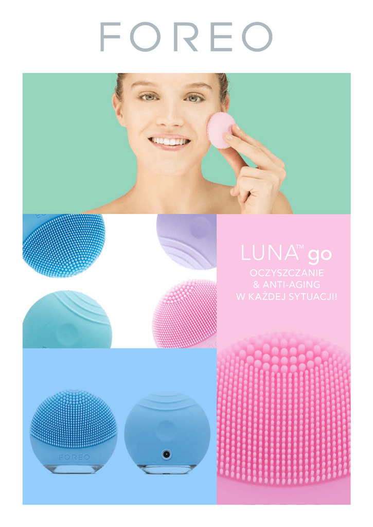 OCZYSZCZANIE & ANTI-AGING W KAŻDEJ SYTUACJI! INSTRUKCJA OBSŁUGI ZANIM ROZPOCZNIESZ Gratulujemy podjęcia pierwszego kroku do nieskazitelnie pięknej skóry w każdej sytuacji, poprzez zakup szczoteczki do oczyszczania twarzy LUNA go z funkcją anti-aging, opartej na technologii T-Sonic . Zanim poczujesz korzyści płynące z zaawansowanej technologii pielęgnacji skóry zawsze i wszędzie, prosimy o dokładne zapoznanie się z poniższymi wskazówkami dotyczącymi obsługi urządzenia. TM TM Prosimy o ZAPOZNANIE SIĘ Z INSTRUKCJĄ PRZED ROZPOCZĘCIEM STOSOWANIA i używanie produktu zgodnie z jego przeznaczeniem opisanym w niniejszej instrukcji. ZASTRZEŻENIE: ZASTRZEGAMY JAKIEJKOLWIEK MODYFIKACJI PRZY URZĄDZENIU. OPIS SZCZOTECZKI DO OCZYSZCZANIA TWARZY LUNA™ go Rewolucyjny system pielęgnacji skóry zamknięty w małym urządzeniu, pozostawia ją naturalnie piękną, promienną, gładką i młodo wyglądającą. Przeznaczony do codziennego stosowania, tryb oczyszczający szczoteczki LUNA go zapewnia dokładniejsze oczyszczanie twarzy od tradycyjnego, wykonywanego za pomocą dłoni, zwiększając wchłanianie twoich ulubionych kosmetyków do pielęgnacji twarzy. Pracując w trybie anti-aging, LUNA go przenosi pulsacje o niskiej intensywności bezpośrednio na powierzchnię skóry zmniejszając widoczność pierwszych oznak starzenia. Regularne stosowanie nie tylko odświeża i nadaje cerze blasku, lecz przyczynia się także do długotrwałych efektów zapewniających skórze zdrowy i odmłodzony wygląd. TM TM Powierzchnia oczyszczająca Powierzchnia anti-aging Interfejs 1 przycisk Wodoodporne gniazdo zasilacza 2 ZASTOSOWANIE SZCZOTECZKI LUNA™ go LUNA go jest dostępna w 4 modelach, ze szczoteczką odpowiadającą potrzebom skóry normalnej, mieszanej, wrażliwej lub tłustej. Każda ze szczoteczek posiada inną kombinację wypustek o różnej grubości dla łagodniejszego bądź intensywniejszego oczyszczania, w zależności od potrzeb skóry. By w pełni poczuć korzyści wynikające z używania szczoteczki LUNA go, polecamy jej stosowanie przez 2 minuty rano i wieczorem. TM TM WYBÓR TRYBU 1. Naciśnij środkowy przycisk, by włączyć szczoteczkę LUNA go. Urządzenie jest teraz w trybie oczyszczania. TM 2. Naciśnij środkowy przycisk ponownie, by urządzenie przeszło do trybu czuwania (w trybie czuwania zapala się lampka kontrolna, a pulsacje są wstrzymane, w tym czasie przemyj twarz wodą). 3. Naciśnij środkowy przycisk po raz trzeci, by aktywować tryb anti-aging. 4. Naciśnij środkowy przycisk jeszcze raz, by wyłączyć szczoteczkę LUNA go. TM Etapy oczyszczania i anti-aging z FOREO przedstawiono poniżej. Przed przejściem do następnego z opisywanych etapów, poczujesz oddanie impulsu oraz zobaczysz mrugnięcie lampki kontrolnej, jako znak, że należy przejść do kolejnej partii twarzy. 3 TRYB OCZYSZCZANIA Tryb oczyszczania LUNA go usuwa 99.5% brudu i tłuszczu* jak również pozostałości makijażu i martwy naskórek. TM 1. NAŁÓŻ PŁYN DO OCZYSZCZANIA Usuń makijaż, następnie nałóż produkt oczyszczający na szczoteczkę lub na wilgotną cerę. Naciśnij na środkowy przycisk, aby uruchomić szczoteczkę LUNA go w trybie oczyszczającym. TM 2. OCZYSZCZAJ NASTĘPUJĄCE PARTIE TWARZY: Po upływie 15 sekundowych interwałów, poczujesz oddanie impulsu, który oznacza że należy przejść do kolejnej partii twarzy. • Oczyszczaj policzek oraz podbródek wykonując koliste ruchy, następnie powtórz krok na drugiej stronie twarzy. • Począwszy od środka czoła, delikatnie przesuwaj szczoteczką do zewnętrznych jego partii • Oczyszczaj nos z jednej strony, delikatnie przesuwając szczoteczką z góry na dół. Przejdź do drugiej partii nosa. Delikatnie oczyszczaj dolne okolice oczu stosując ruchy wyciągające. Po upływie 1 minuty, szczoteczka odda 3 impulsy. Naciśnij jeszcze raz środkowy przycisk, by wprowadzić urządzenie w tryb czuwania. 3. PRZEMYCIE WODĄ Spłucz i osusz twarz. Teraz możesz nałożyć wszelkie produkty do pielęgnacji twarzy. TRYB ANTI-AGING Funkcja anti-aging powstała w celu zmniejszenia widoczności pierwszych linii mimicznych i zmarszczek, pozostawiając skórę bardziej napiętą i elastyczną. Przechodząc z trybu czuwania, naciśnij środkowy przycisk w celu aktywacji funkcji anti-aging. Postaraj się przeznaczyć 12 sekund na każdy wyznaczony obszar podatny na zmarszczki. Po upływie tego czasu, szczoteczka LUNA go odda impuls. Zamknij oczy, zrelaksuj mięśnie twarzy i przykładaj powierzchnię anti-aging do kolejnych wyznaczonych obszarów podatnych na zmarszczki, gdzie napięcia mięśni mogą powodować powstawanie zmarszczek mimicznych i kurzych łapek: TM 1. Strefa między brwiami 2. Zewnętrzna część prawego oka 3. Prawa fałda nosowo-wargowa 4. Zewnętrzna część lewego oka 5. Lewa fałda nosowo-wargowa Po upływie 1 minuty szczoteczka odda z rzędu 3 impulsy. W celu uniknięcia nadmiernej eksploatacji energii, po upływie 3 minut będąc w trybie oczyszczania lub anti-aging, LUNA go automatycznie wyłączy się sama. TM UWAGA: W razie dolegliwości odczuwanych podczas stosowania urządzenia FOREO, przerwij natychmiast stosowanie i skonsultuj się z lekarzem. *Stwierdzono na podstawie badań klinicznych, wyniki w pliku. 4 UTRZYMYWANIE W CZYSTOŚCI LUNA™ go Zawsze po użyciu dokładnie umyj LUNA go. Czyść ją za pomocą wody i mydła, a następnie spłucz ciepłą wodą. Osusz za pomocą szmatki bezpyłowej lub ręcznika. Zalecamy używanie sprayu do czyszczenia silikonu od FOREO i spłukiwanie urządzenia ciepłą wodą po zastosowaniu, dla uzyskania optymalnych rezultatów. TM UWAGA: Nigdy nie stosuj do czyszczenia produktów zawierających alkohol, benzynę lub aceton, ponieważ mogą się przyczynić do podrażnienia skóry. ŁADOWANIE Twoje urządzenie FOREO może być ładowane za pomocą załączonej ładowarki. Jedna godzina ładowania wystarcza do 1 miesiąca stosowania. • Podłącz ko