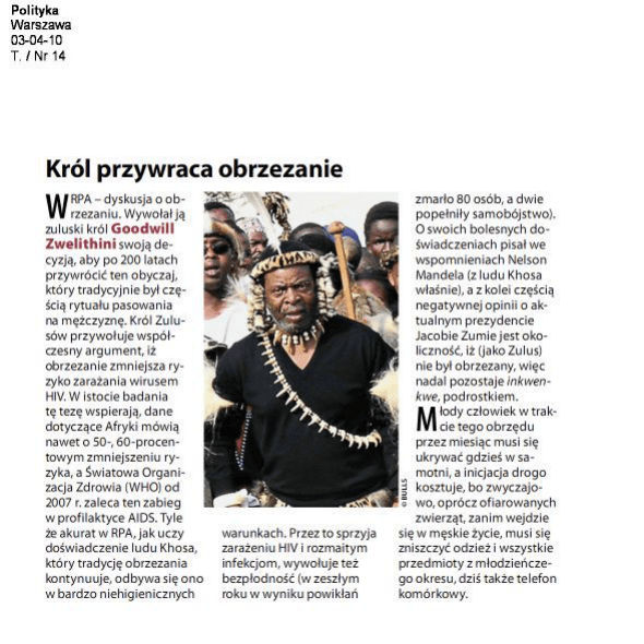 Polityka Warszawa 03-04-10 T./NM4 Król przywraca obrzezanie RPA - dyskusja o obrzezaniu. Wywołałją zuluskikrólGoodwill Zwelithini swoją decyzją, aby po 200 latach przywrócić ten obyczaj, który tradycyjnie byt częścią rytuału pasowania na mężczyznę. Król Zulusów przywołuje współczesny argument, iż obrzezanie zmniejsza ryzyko zarażania wirusem HIV. W istocie badania tę tezę wspierają, dane dotyczące Afryki mówią nawet o 50-, 60-procentowym zmniejszeniu ryzyka, a Światowa Organizacja Zdrowia (WHO) od 2007 r. zaleca ten zabieg w profilaktyce AIDS. Tyle że akurat w RPA, jak uczy doświadczenie ludu Khosa, który tradycję obrzezania kontynuuje, odbywa się ono w bardzo niehigienicznych W zmarło 80 osób, a dwie popełniły samobójstwo). O swoich bolesnych doświadczeniach pisał we wspomnieniach Nelson Mandela (z ludu Khosa właśnie), a z kolei częścią negatywnej opinii o aktualnym prezydencie Jacobie Zumie jest okoliczność, iż (jakoZulus) nie był obrzezany, więc nadal pozostaje inkwenkwe, podrostkiem. łody człowiek w trakcie tego obrzędu przez miesiąc musi się ukrywać gdzieś w samotni, a inicjacja drogo kosztuje, bo zwyczajowo, oprócz ofiarowanych zwierząt, zanim wejdzie się w męskie życie, musi się zniszczyć odzież i wszystkie przedmioty z młodzieńczego okresu, dziś także telefon komórkowy. M warunkach. Przez to sprzyja zarażeniu HIV i rozmaitym infekcjom, wywołuje też bezpłodność (w zeszłym roku w wyniku powikłań
