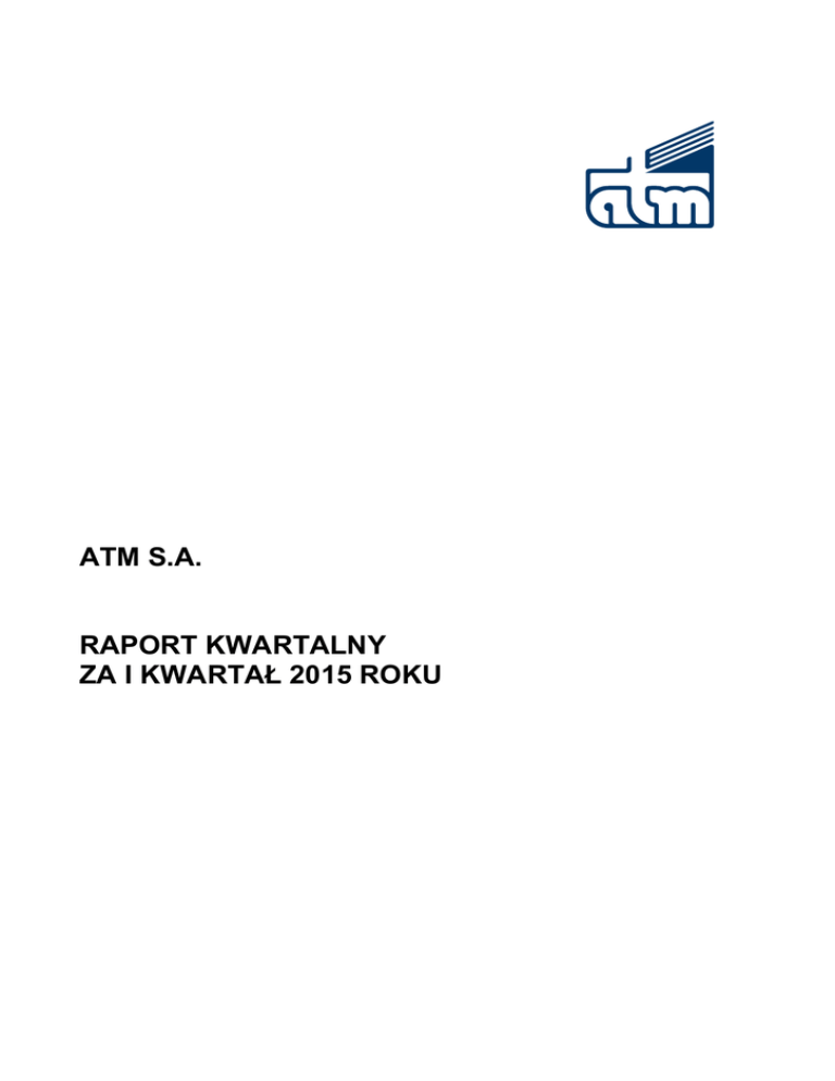 ATM S.A. RAPORT KWARTALNY ZA I KWARTAŁ 2015 ROKU ATM S.A. Raport kwartalny na 31.03.2015 roku SPIS TREŚCI DANE PODSTAWOWE RAPORTU KWARTALNEGO .......................................................................... 4 WYBRANE DANE FINANSOWE ............................................................................................................ 5 A. SKRÓCONE SPRAWOZDANIE FINANSOWE ATM S.A. ZA I KWARTAŁ 2015 ROKU ................. 6 1. 2. 3. 4. 5. 6. SKRÓCONE SPRAWOZDANIE Z DOCHODÓW ........................................................................................ 6 SKRÓCONE SPRAWOZDANIE Z CAŁKOWITYCH DOCHODÓW .................................................................. 7 SKRÓCONE SPRAWOZDANIE Z SYTUACJI FINANSOWEJ – AKTYWA ........................................................ 8 SKRÓCONE SPRAWOZDANIE Z SYTUACJI FINANSOWEJ – PASYWA ........................................................ 9 SKRÓCONE SPRAWOZDANIE ZE ZMIAN W KAPITALE WŁASNYM ........................................................... 10 SKRÓCONE SPRAWOZDANIE Z PRZEPŁYWÓW PIENIĘŻNYCH ............................................................... 13 INFORMACJA DODATKOWA DO SKRÓCONEGO SPRAWOZDANIA FINANSOWEGO ................ 14 1. PODSTAWA SPORZĄDZENIA SPRAWOZDANIA FINANSOWEGO ORAZ ZASADY (POLITYKA) RACHUNKOWOŚCI14 2. SEGMENTY DZIAŁALNOŚCI .............................................................................................................. 15 3. ODPISY AKTUALIZUJĄCE WARTOŚĆ ZAPASÓW DO WARTOŚCI NETTO MOŻLIWEJ DO UZYSKANIA ............ 17 4. ODPISY AKTUALIZUJĄCE WARTOŚĆ AKTYWÓW TRWAŁYCH ................................................................ 17 5. UTWORZENIE, ZWIĘKSZENIE, WYKORZYSTANIE I ROZWIĄZANIE REZERW ............................................ 17 6. REZERWY I AKTYWA Z TYTUŁU ODROCZONEGO PODATKU DOCHODOWEGO............................................... 17 7. ISTOTNE TRANSAKCJE NABYCIA I SPRZEDAŻY RZECZOWYCH AKTYWÓW TRWAŁYCH ............................ 18 8. ISTOTNE ZOBOWIĄZANIA Z TYTUŁU DOKONANIA ZAKUPU RZECZOWYCH AKTYWÓW TRWAŁYCH ............. 18 9. ISTOTNE ROZLICZENIA Z TYTUŁU SPRAW SĄDOWYCH ........................................................................ 18 10. KOREKTY BŁĘDÓW POPRZEDNICH OKRESÓW ................................................................................... 18 11. ZMIANY SYTUACJI GOSPODARCZEJ I WARUNKÓW PROWADZENIA DZIAŁALNOŚCI, KTÓRE MAJĄ ISTOTNY WPŁYW NA WARTOŚĆ GODZIWĄ AKTYWÓW FINANSOWYCH I ZOBOWIĄZAŃ FINANSOWYCH JEDNOSTKI .............. 18 12. POŻYCZKI I KREDYTY BANKOWE I ZOBOWIĄZANIA LEASINGOWE ......................................................... 18 13. NIESPŁACENIE KREDYTU LUB POŻYCZKI ........................................................................................... 19 14. INSTRUMENTY FINANSOWE WYCENIANE W WARTOŚCI GODZIWEJ ....................................................... 19 15. ZMIANY W KLASYFIKACJI AKTYWÓW FINANSOWYCH W WYNIKU ZMIANY CELU LUB WYKORZYSTANIA TYCH AKTYWÓW ..................................................................................................................................... 20 16. SEZONOWOŚĆ DZIAŁALNOŚCI ......................................................................................................... 20 17. EMISJA, WYKUP I SPŁATA NIEUDZIAŁOWYCH I KAPITAŁOWYCH PAPIERÓW WARTOŚCIOWYCH ............... 21 18. DYWIDENDY WYPŁACONE I ZADEKLAROWANE .................................................................................. 21 19. ZMIANY W STRUKTURZE JEDNOSTKI GOSPODARCZEJ........................................................................ 21 20. ZMIANY ZOBOWIĄZAŃ WARUNKOWYCH I AKTYWÓW WARUNKOWYCH .................................................. 21 21. ISTOTNE ZDARZENIA NASTĘPUJĄCE PO ZAKOŃCZENIU KWARTAŁU ..................................................... 21 B. POZOSTAŁE INFORMACJE DO RAPORTU KWARTALNEGO .................................................... 22 1. INFORMACJE O EMITENCIE .............................................................................................................. 22 DANE PODSTAWOWE EMITENTA ........................................................................................................... 22 OPIS ORGANIZACJI GRUPY KAPITAŁOWEJ EMITENTA, ZE WSKAZANIEM JEDNOSTEK PODLEGAJĄCYCH KONSOLIDACJI ..................................................................................................................................................... 22 W SKAZANIE AKCJONARIUSZY POSIADAJĄCYCH BEZPOŚREDNIO LUB POŚREDNIO PRZEZ PODMIOTY ZALEŻNE CO NAJMNIEJ 5% OGÓLNEJ LICZBY GŁOSÓW NA WALNYM ZGROMADZENIU EMITENTA NA DZIEŃ PRZEKAZANIA RAPORTU KWARTALNEGO ORAZ WSKAZANIE ZMIAN W STRUKTURZE WŁASNOŚCI ZNACZNYCH PAKIETÓW AKCJI EMITENTA W OKRESIE OD PRZEKAZANIA POPRZEDNIEGO RAPORTU KWARTALNEGO ............................ 23 ZESTAWIENIE ZMIAN W STANIE POSIADANIA AKCJI EMITENTA LUB UPRAWNIEŃ DO NICH (OPCJI) PRZEZ OSOBY ZARZĄDZAJĄCE I NADZORUJĄCE EMITENTA, ZGODNIE Z POSIADANYMI PRZEZ EMITENTA INFORMACJAMI, W OKRESIE OD PRZEKAZANIA POPRZEDNIEGO RAPORTU KWARTALNEGO ............................................... 24 NABYCIE AKCJI WŁASNYCH .................................................................................................................. 24 2. OPIS DOKONAŃ EMITENTA ORAZ PERSPEKTYWY ROZWOJU ............................................................... 24 OPIS ISTOTNYCH DOKONAŃ LUB NIEPOWODZEŃ EMITENTA W OKRESIE, KTÓREGO DOTYCZY RAPORT........ 24 OPIS CZYNNIKÓW I ZDARZEŃ O NIETYPOWYM CHARAKTERZE MAJĄCYCH ZNACZNY WPŁYW NA OSIĄGNIĘTE WYNIKI FINANSOWE ................................................................................................................................... 27 W SKAZANIE CZYNNIKÓW , KTÓRE W OCENIE EMITENTA BĘDĄ MIAŁY WPŁYW NA OSIĄGNIĘTE PRZEZ NIEGO WYNIKI W PERSPEKTYWIE CO NAJMNIEJ KOLEJNEGO KWARTAŁU ...................
