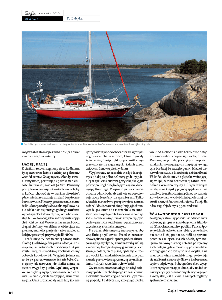Żagle czerwiec 2010 Morze Po Bałtyku n Polubiliśmy cumowanie dziobem do skały, wbijanie w skaliste wybrzeże haków, a nawet wyrywanie ubłoconej kotwicy z dna Gdyby zabrakło miejsca w marinie, tuż obok można stanąć na kotwicy. Dalej, dalej... Z ciężkim sercem żegnamy się z Rodhamn, by spenetrować leżące bardziej na północny wschód tereny. Osiągnąwszy Alandy, zwolniliśmy nieco, poruszając się skokami o długości kilkunastu, zamiast 50 Mm. Płyniemy początkowo po dosyć otwartych wodach, by w końcu schować się w wąskim „fiordzie”, gdzie mieliśmy nadzieję znaleźć bezpieczne kotwicowisko. Niestety, przez całe mile, mimo że linia brzegowa była dosyć skomplikowana, nie udało nam się niczego godnego zaufania wypatrzyć. Tu było za płytko, tam z kolei nazbyt blisko domów, gdzie indziej wiatr dopychał jacht do skał. Wreszcie na samym końcu długiej cieśniny weszliśmy w obiecujące na pierwszy rzut oka przejście – ni to zatokę, ni kolejny przesmyk przy wyspie Bänö Ön. Trafiliśmy! W bezpiecznej zatoce stało około 35 jachtów, jedne przy skałach, a inne, większe, na kotwicach dziobowych. A już myśleliśmy, że straciliśmy zdolność oceny dobrych kotwicowisk. Wygląda jednak na to, że po prostu wcześniej ich nie było. Cumujemy jak zazwyczaj do skałki, zajmując ostatni wygodny punkt. Opalanie, wyprawa po pięknej wyspie, wieczorna kąpiel za rufą „Safrana”, czyli tradycyjne, szkierowe zajęcia. Czas urozmaicały nam trzy śliczne 84 i przyzwyczajone do obecności nieagresywnego człowieka zaskrońce, które pływały koło jachtu, łowiąc rybki, a po posiłku wygrzewały się na nagrzanych skałach przed dziobem. I znowu piękny dzień. Wypływamy na szerokie wody i kierujemy się dalej na północ. Cztery godziny później znajdujemy cudowną, wysoką skałę, na półwyspie Ingholm, będącym częścią dużej wyspy Kumlinge. Miejsce to jest całkowicie otwarte od zachodu, ale dziś wieje z przeciwnej strony. Jesteśmy tu zupełnie sami. Tylko rybackie motorówki przepływające nam za rufą zakłócają czasami ciszę i bujają jachtem. Opadająca stromo do morza skała ma mnóstwo poziomych półek, każde z nas znajduje sobie zatem własny „taras” z zapierającym dech w piersiach widokiem i spędza tam czas, czytając czy słuchając muzyki. Na obiad zbieramy się na szczycie, aby wspólnie pogrillować. Przed wieczorem obowiązkowa kąpiel i spacer, podczas którego znajdujemy słynną, skandynawską malinę – morożkę. Fotografujemy ją ze wszystkich stron, a potem, rzecz jasna, zjadamy jej żółte owocki. Ich smak niekoniecznie przypadł nam do gustu, więc zagryzamy sporymi jagodami, których wszędzie było w bród. Zwieńczeniem wspaniałego dnia był kolorowy spektakl zachodzącego słońca i chmur, niezwykle malowniczy, ale zwiastujący zmianę pogody. I faktycznie, kolejnego ranka wieje od zachodu i nasze bezpieczne dotąd kotwicowisko zaczyna się trochę huśtać. Ruszamy więc dalej po krętych i wąskich szlakach, wymagających napiętej uwagi, tym bardziej że zaczęło padać. Maciej trenował sterowanie, kierując się nabieżnikami. W końcu docieramy do głęboko wcinającej się w ląd, bardzo bezpiecznej zatoki Storholmen w rejonie wyspy Fiskö, w której ze względu na kiepską pogodę spędzamy dwa dni. Było to najbardziej na północ wysunięte kotwicowisko w całej dziesięcioletniej historii naszych bałtyckich rejsów. Tutaj, dla odmiany, objadamy się poziomkami. W alandzkich szkierach Następny naturalny porcik, jaki odwiedzimy, położony jest już w sąsiadujących z Alandami fińskich szkierach w pobliżu Turku. Sporo polskich jachtów zna szkiery szwedzkie, znacznie bliżej położone, niźli opisywane przez nas miejsca. Na Alandach, tym mającym ciekawą historię i status polityczny archipelagu, gdzie mówi się po szwedzku, którego granic bronią fińskie wojska, a na masztach wiszą alandzkie flagi, pojawiają się nieliczni, a nawet jeśli, to z braku czasu, szybko odpływają. Pobyt pośród 6500 wysp, które są wystarczająco duże, aby nadać im nazwy i tysięcy bezimiennych, wystających z wody skał, jest dla wielu naszych żeglarzy spełnieniem marzeń. Żagle | www.zagle.com.pl