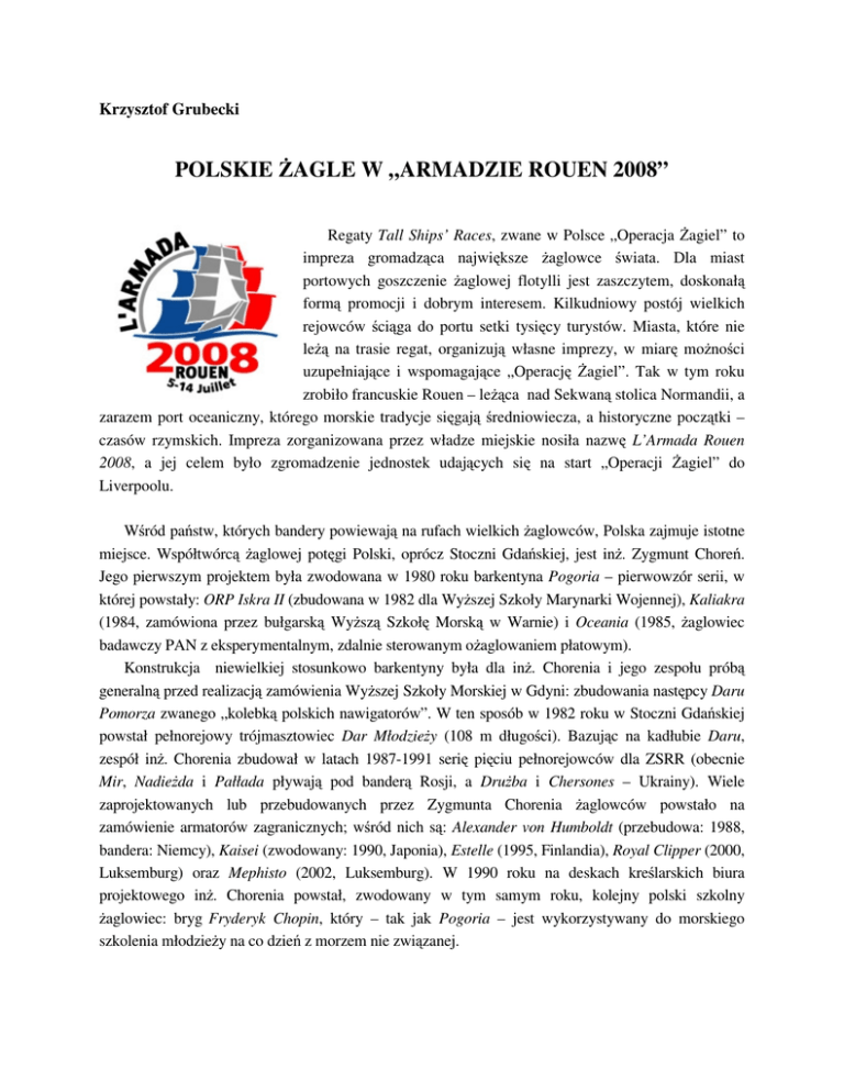 Krzysztof Grubecki POLSKIE ŻAGLE W „ARMADZIE ROUEN 2008” Regaty Tall Ships’ Races, zwane w Polsce „Operacja Żagiel” to impreza gromadząca największe żaglowce świata. Dla miast portowych goszczenie żaglowej flotylli jest zaszczytem, doskonałą formą promocji i dobrym interesem. Kilkudniowy postój wielkich rejowców ściąga do portu setki tysięcy turystów. Miasta, które nie leżą na trasie regat, organizują własne imprezy, w miarę możności uzupełniające i wspomagające „Operację Żagiel”. Tak w tym roku zrobiło francuskie Rouen – leżąca nad Sekwaną stolica Normandii, a zarazem port oceaniczny, którego morskie tradycje sięgają średniowiecza, a historyczne początki – czasów rzymskich. Impreza zorganizowana przez władze miejskie nosiła nazwę L’Armada Rouen 2008, a jej celem było zgromadzenie jednostek udających się na start „Operacji Żagiel” do Liverpoolu. Wśród państw, których bandery powiewają na rufach wielkich żaglowców, Polska zajmuje istotne miejsce. Współtwórcą żaglowej potęgi Polski, oprócz Stoczni Gdańskiej, jest inż. Zygmunt Choreń. Jego pierwszym projektem była zwodowana w 1980 roku barkentyna Pogoria – pierwowzór serii, w której powstały: ORP Iskra II (zbudowana w 1982 dla Wyższej Szkoły Marynarki Wojennej), Kaliakra (1984, zamówiona przez bułgarską Wyższą Szkołę Morską w Warnie) i Oceania (1985, żaglowiec badawczy PAN z eksperymentalnym, zdalnie sterowanym ożaglowaniem płatowym). Konstrukcja niewielkiej stosunkowo barkentyny była dla inż. Chorenia i jego zespołu próbą generalną przed realizacją zamówienia Wyższej Szkoły Morskiej w Gdyni: zbudowania następcy Daru Pomorza zwanego „kolebką polskich nawigatorów”. W ten sposób w 1982 roku w Stoczni Gdańskiej powstał pełnorejowy trójmasztowiec Dar Młodzieży (108 m długości). Bazując na kadłubie Daru, zespół inż. Chorenia zbudował w latach 1987-1991 serię pięciu pełnorejowców dla ZSRR (obecnie Mir, Nadieżda i Pałłada pływają pod banderą Rosji, a Drużba i Chersones – Ukrainy). Wiele zaprojektowanych lub przebudowanych przez Zygmunta Chorenia żaglowców powstało na zamówienie armatorów zagranicznych; wśród nich są: Alexander von Humboldt (przebudowa: 1988, bandera: Niemcy), Kaisei (zwodowany: 1990, Japonia), Estelle (1995, Finlandia), Royal Clipper (2000, Luksemburg) oraz Mephisto (2002, Luksemburg). W 1990 roku na deskach kreślarskich biura projektowego inż. Chorenia powstał, zwodowany w tym samym roku, kolejny polski szkolny żaglowiec: bryg Fryderyk Chopin, który – tak jak Pogoria – jest wykorzystywany do morskiego szkolenia młodzieży na co dzień z morzem nie związanej. Krzysztof Grubecki POLSKIE ŻAGLE W „ARMADZIE ROUEN 2008” 2 Właśnie na Pogorii przyszło mi w tym roku uczestniczyć w rejsie z Lizbony do Rouen. Załogę w większości tworzyli fizycy z Politechniki Warszawskiej i CERN – Europejskiej Organizacji Badań Atomowych z Genewy (głośnej ostatnio z budowy największego na świecie akceleratora cząstek elementarnych: cyklotronu „Wielki Zderzacz Hadronów” o obwodzie 27 km). W sumie jednak, 28 czerwca 2008 w Lizbonie, na pokładzie barkentyny spotkali się: Anglicy, Francuzi, Polacy, Rosjanie, Szwajcarzy, Amerykanka, Brazylijka, Hiszpanka, Niemka, Węgier oraz przedstawiciele Polonii Amerykańskiej, w większości członkowie Polish Sailing Club z Nowego Jorku. Armatorem Pogorii jest Sail Training Association Poland, jedna z 25 narodowych organizacji żeglarskich z całego świata zrzeszonych w zajmującej się wychowaniem morskim Sail Training International. W czasie ostatniej zimy Pogoria przeszła remont generalny. Jej wnętrze zmieniło się nie do poznania, nie tylko w porównaniu z latami 80-tymi, kiedy pod dowództwem kpt. Baranowskiego stawiałem na jej pokładzie pierwsze żeglarskie kroki w rejsie Szkoły Pod Żaglami do Indii i Sri Lanki. Oficerowałem na niej również w roku ubiegłym, a przecież musiałem od nowa orientować się w nowym rozkładzie pomieszczeń i nowym sprzęcie nawigacyjnym. Niezmieniona z zewnątrz, pod pokładem Pogoria jest teraz nowoczesnym, choć wciąż skromnie urządzonym żaglowcem, łączącym prostotę z funkcjonalnością i estetyką. Wielka w tym osobista zasługa kpt. Marka Klebana, szefa Sail Training Association Poland, który od blisko dwudziestu lat czuwa i opiekuje się barkentyną. Wśród załogi stałej spotkałem starych znajomych: bosmana Henryka Czernieckiego i szefa maszyny Jędrzeja Łuczaka. Jędrzejowi pomagał doświadczony motorzysta Marek Stefański. Etatowy kucharz był na urlopie, więc w kambuzie zastępowała go – jak się okazało później ze znakomitym skutkiem – Ewa Politikin. Dowódcą Pogorii był Adam Jasser, jachtowy kapitan żeglugi wielkiej, instruktor żeglarski, dziennikarz, współtwórca i uczestnik wielu przedsięwzięć żeglarskich, przez wiele lat pracujący dla amerykańskich instytucji Ocean Masters Academy i Chapman School of Seamanship. Lizbonę opuściliśmy w niedzielę, 29 czerwca 2008. Po salucie oddanym infantowi Henrykowi Żeglarzowi, XV-wiecznemu twórcy morskiej potęgi Portugalii, który spoglądał na nas z pomnika na rzece Tag, wyszliśmy na Atlantyk, a zaraz później zmierzyliśmy się z wodami Zatoki Biskajskiej. Tym razem Biskaj przepuścił nas bez większych problemów, choć nie szczędził Pogorii przeciwnych wiatrów. Żeglarze podzieleni na wachty szybko się poznawali, uczestnicząc w manewrach i służbie na pokładzie. Wspólna praca połączyła załogę w jeden organizm. Żegluga w sztormowym wietrze pomogła oficerom szybciej ocenić i wykorzystać zalety żeglarzy. Jedni lepiej sterowali, inni chętniej czytali mapy i pomagali w nawigacji, jeszcze inni sprawdzali się na oku. Starym zwyczajem na reje wybierali się tylko ochotnicy, ale tych nie brakowało. Na Pogorii, jak na wszystkich żaglowcach, obowiązuje ścisły regulamin s