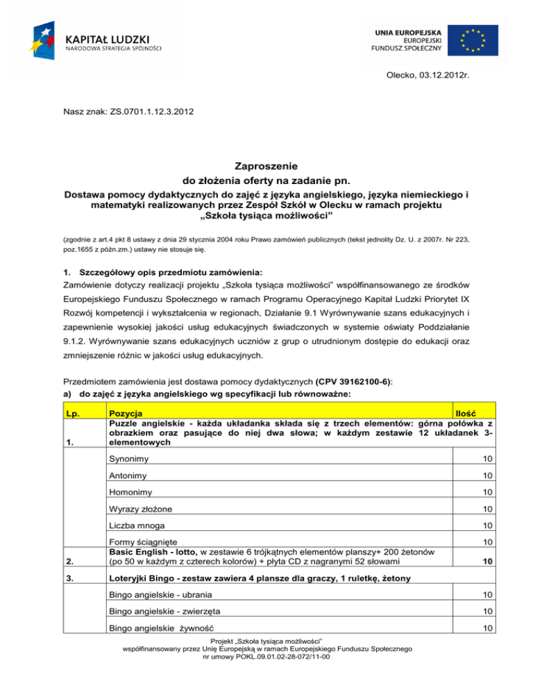 Olecko, 03.12.2012r. Nasz znak: ZS.0701.1.12.3.2012 Zaproszenie do złoŜenia oferty na zadanie pn. Dostawa pomocy dydaktycznych do zajęć z języka angielskiego, języka niemieckiego i matematyki realizowanych przez Zespół Szkół w Olecku w ramach projektu „Szkoła tysiąca moŜliwości” (zgodnie z art.4 pkt 8 ustawy z dnia 29 stycznia 2004 roku Prawo zamówień publicznych (tekst jednolity Dz. U. z 2007r. Nr 223, poz.1655 z późn.zm.) ustawy nie stosuje się. 1. Szczegółowy opis przedmiotu zamówienia: Zamówienie dotyczy realizacji projektu „Szkoła tysiąca moŜliwości” współfinansowanego ze środków Europejskiego Funduszu Społecznego w ramach Programu Operacyjnego Kapitał Ludzki Priorytet IX Rozwój kompetencji i wykształcenia w regionach, Działanie 9.1 Wyrównywanie szans edukacyjnych i zapewnienie wysokiej jakości usług edukacyjnych świadczonych w systemie oświaty Poddziałanie 9.1.2. Wyrównywanie szans edukacyjnych uczniów z grup o utrudnionym dostępie do edukacji oraz zmniejszenie róŜnic w jakości usług edukacyjnych. Przedmiotem zamówienia jest dostawa pomocy dydaktycznych (CPV 39162100-6): a) do zajęć z języka angielskiego wg specyfikacji lub równowaŜne: Lp. 1. Pozycja Ilość Puzzle angielskie - kaŜda układanka składa się z trzech elementów: górna połówka z obrazkiem oraz pasujące do niej dwa słowa; w kaŜdym zestawie 12 układanek 3elementowych Synonimy 10 Antonimy 10 Homonimy 10 Wyrazy złoŜone 10 Liczba mnoga 10 10 2. Formy ściągnięte Basic English - lotto, w zestawie 6 trójkątnych elementów planszy+ 200 Ŝetonów (po 50 w kaŜdym z czterech kolorów) + płyta CD z nagranymi 52 słowami 3. Loteryjki Bingo - zestaw zawiera 4 plansze dla graczy, 1 ruletkę, Ŝetony 10 Bingo angielskie - ubrania 10 Bingo angielskie - zwierzęta 10 Bingo angielskie Ŝywność 10 Projekt „Szkoła tysiąca moŜliwości” współfinansowany przez Unię Europejską w ramach Europejskiego Funduszu Społecznego nr umowy POKL.09.01.02-28-072/11-00 10. Angielski POPcorn - zabawa słowami, w zestawie: 92 kartoniki "popcorn" z wyrazami + 8 kartoników losowych "POP" Budowanie zdań – grupowy zestaw z klockami Reading Rods -156 klocków Reading Roads w pudełku, 24 dwustronne karty aktywności, ksiąŜka metodyczna, 100 kartoników do demonstracji, 4 podstawki Tworzenie wyrazów – grupowy zestaw z klockami Reading Rods - 109 klocków Reading Roads w pudełku, 24 dwustronne karty aktywności, ksiąŜka metodyczna, 100 kartoników do demonstracji, 4 podstawki Trening budowania zdań angielskich-w zestawie: 32 zdania o wym. 6,5 x 38 cm + 120 kartoników wyrazowych o wym. 6,5 x 6,5 cm+4 drewniane podstawki o wym. 40x4,5x 2 cm Magnetyczne zdania angielskie, w zestawie: magnetyczna podstawa o wym. 20 x 26,5 cm + 14 fraz o wym. 4 x 11,5 cm+ 27 wyrazów + 3 kropki Makatka – Idiom of the Week, w zestawie: makatka z mocnego nylonu z dwoma przezroczystymi kieszeniami (33 x 70 cm)+ 20 dwustronnych kart z 40 idiomami Makatka - angielski alfabet, w zestawie trwała makatka 71x86 cm, 156 kartoników z obrazkami, 52 kartoniki z literami, 4 kartoniki blanko 11. Maty do angielskiego - mata wymiary 90x220 cm 4. 5. 6. 7. 8. 9. Days of the week 12. 14. 15. 16. 17. 18. 20. 2 10 10 2 2 2 2 Beginning Vocabulary 2 What's the time? Zegar magnetyczny z angielskim podpisami, w zestawie: tarcza zegarowa z folii magnetycznej z ruchomymi wskazówkami (wym. 48 x 63 cm) + 6 magnetycznych plakietek (w języku angielskim) 2 Word for Word - gra słowna, 112 klocków Reading Rods+klepsydra+4 ołówki+notatnik 4 Word sort- sortujemy wyrazy - 5 dwustronnych, laminowanych plansz (27 x 42 cm) + 200 dwustronnych kartoników z grubej tektury 4 Układamy angielskie zdania z fotografiami - 55 kartoników ze słowamim +27 kartoników z fotografiami + 4 kartoników ze znakami interpunkcyjnymi - wym. kartonika 5,5 x 6 cm 20 Angielskie słówka - puzzle -układanki dla dzieci czytających. Zadaniem jest dobrać w pary obrazek i angielski wyraz. Część 1 - dom 1 Część 2- Ŝywność 1 Część 4 - godziny 1 Puzzle angielskie - dwustronne puzzle wyrazami jednosylabowymi- 48 elementów Samogłoski krótkie 19. 2 Months of the year 2 Karty fotograficzne - w zestawie: 150 dwustronnych kolorowych kart - wym. 7 x 7 cm +pudełko z przedziałkami Advanced Vocabulary 13. 10 10 Samogłoski długie 10 BROGY - kaŜdy zestaw zawiera 210 kart podzielonych na 7 grup tematycznych+7 tubek do przechowywania kart BROGY 1 10 BROGY 2 Cookin up sentences - gra gramatyczna, w zestawie: plansza 48 x 48 cm+150 kartoników części zdania+karty- recepty+ruletka i pionki (język angielski) 10 Projekt „Szkoła tysiąca moŜliwości” współfinansowany przez Unię Europejską w ramach Europejskiego Funduszu Społecznego nr umowy POKL.09.01.02-28-072/11-00 10 21. 22. 23. 24. Mata do angielskiego Tornado of colours and shapes - mata wym. 200x200 cm 1 Kostki językowe - w kaŜdym zestawie 6 szt.z miękkiej i trwałej pianki, wymiar boku kostki 4,2 cm. Kostki z pytaniami na rozumienie tekstu 2 Kostki do układania opowiadań - obrazkowe 2 Kostki - pytania do tekstu 2 Kostki do konwersacji 2 Alfabetyczna dŜdŜownica - interaktywna mata w jęz. angielskim z trwałego winylu o wymiarach 152 x 81 cm 1 Zdjęcia z podpisami - w zestawie 108 kartoników z fotografiami (7x7cm), 108 kartoników z podpisami (3x7cm) Angielskie czasowniki 25. 26. 2 Angielskie rzeczowniki 2 Bingo - materiał dźwiękowy ze zdjęciami, w zestawie płyta CD, 25 dwustronnych kart, 150 czerwonych Ŝetonów Dom i Miasto 2 Czynności i instrumenty muzyczne 2 Zwierzęta i Natura 2 Plansze dydaktyczne typu DUO - producent Stiefel 120x160 cm Professions 2 Transport 2 Clothes 2 My Family 2 The English Alphabet 2 Time and Seasons 2 Basic Facts about Great Britain 2 Basic English I 2 Basic English II 2 Basic English III 2 Basic English IV 2 2 30. Basic English V Go to press - gra planszowa, w zestawie: plansza (48 x 48 cm)+100 kart z tekstami+6 pionków+