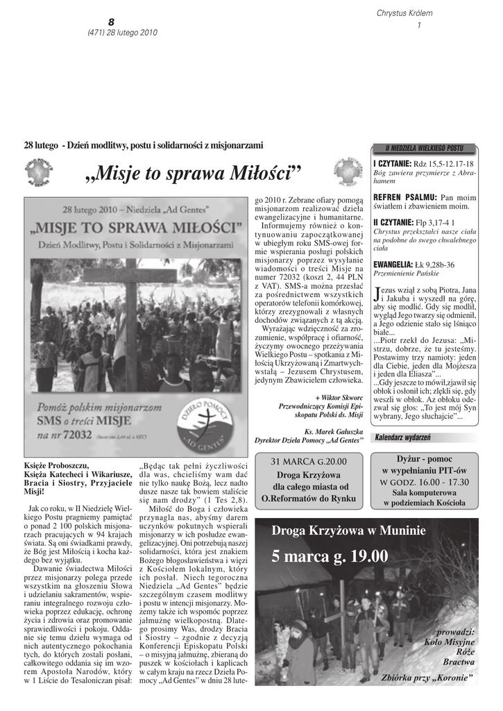 Chrystus Królem 1 8 (471) 28 lutego 2010 28 lutego - Dzień modlitwy, postu i solidarności z misjonarzami II NIEDZIELA WIELKIEGO POSTU „Misje to sprawa Miłości” go 2010 r. Zebrane ofiary pomogą misjonarzom realizować dzieła ewangelizacyjne i humanitarne. Informujemy również o kontynuowaniu zapoczątkowanej w ubiegłym roku SMS-owej formie wspierania posługi polskich misjonarzy poprzez wysyłanie wiadomości o treści Misje na numer 72032 (koszt 2, 44 PLN z VAT). SMS-a można przesłać za pośrednictwem wszystkich operatorów telefonii komórkowej, którzy zrezygnowali z własnych dochodów związanych z tą akcją. Wyrażając wdzięczność za zrozumienie, współpracę i ofiarność, życzymy owocnego przeżywania Wielkiego Postu – spotkania z Miłością Ukrzyżowaną i Zmartwychwstałą – Jezusem Chrystusem, jedynym Zbawicielem człowieka. + Wiktor Skworc Przewodniczący Komisji Episkopatu Polski ds. Misji Ks. Marek Gałuszka Dyrektor Dzieła Pomocy „Ad Gentes” Księże Proboszczu, Księża Katecheci i Wikariusze, Bracia i Siostry, Przyjaciele Misji! Jak co roku, w II Niedzielę Wielkiego Postu pragniemy pamiętać o ponad 2 100 polskich misjonarzach pracujących w 94 krajach świata. Są oni świadkami prawdy, że Bóg jest Miłością i kocha każdego bez wyjątku. Dawanie świadectwa Miłości przez misjonarzy polega przede wszystkim na głoszeniu Słowa i udzielaniu sakramentów, wspieraniu integralnego rozwoju człowieka poprzez edukację, ochronę życia i zdrowia oraz promowanie sprawiedliwości i pokoju. Oddanie się temu dziełu wymaga od nich autentycznego pokochania tych, do których zostali posłani, całkowitego oddania się im wzorem Apostoła Narodów, który w 1 Liście do Tesaloniczan pisał: „Będąc tak pełni życzliwości dla was, chcieliśmy wam dać nie tylko naukę Bożą, lecz nadto dusze nasze tak bowiem staliście się nam drodzy” (1 Tes 2,8). Miłość do Boga i człowieka przynagla nas, abyśmy darem uczynków pokutnych wspierali misjonarzy w ich posłudze ewangelizacyjnej. Oni potrzebują naszej solidarności, która jest znakiem Bożego błogosławieństwa i więzi z Kościołem lokalnym, który ich posłał. Niech tegoroczna Niedziela „Ad Gentes” będzie szczególnym czasem modlitwy i postu w intencji misjonarzy. Możemy także ich wspomóc poprzez jałmużnę wielkopostną. Dlatego prosimy Was, drodzy Bracia i Siostry – zgodnie z decyzją Konferencji Episkopatu Polski – o misyjną jałmużnę, zbieraną do puszek w kościołach i kaplicach w całym kraju na rzecz Dzieła Pomocy „Ad Gentes” w dniu 28 lute- 31 MARCA g.20.00 Droga Krzyżowa dla całego miasta od O.Reformatów do Rynku I CZYTANIE: Rdz 15,5-12.17-18 Bóg zawiera przymierze z Abrahamem REFREN PSALMU: Pan moim światłem i zbawieniem moim. II CZYTANIE: Flp 3,17-4 1 Chrystus przekształci nasze ciała na podobne do swego chwalebnego ciała EWANGELIA: Łk 9,28b-36 Przemienienie Pańskie J ezus wziął z sobą Piotra, Jana i Jakuba i wyszedł na górę, aby się modlić. Gdy się modlił, wygląd Jego twarzy się odmienił, a Jego odzienie stało się lśniąco białe... ...Piotr rzekł do Jezusa: „Mistrzu, dobrze, że tu jesteśmy. Postawimy trzy namioty: jeden dla Ciebie, jeden dla Mojżesza i jeden dla Eliasza”... ...Gdy jeszcze to mówił,zjawił się obłok i osłonił ich; zlękli się, gdy weszli w obłok. Az obłoku odezwał się głos: „To jest mój Syn wybrany, Jego słuchajcie”... Kalendarz wydarzeń Dyżur - pomoc w wypełnianiu PIT-ów w godz. 16.00 - 17.30 Sala komputerowa w podziemiach Kościoła Droga Krzyżowa w Muninie 5 marca g. 19.00 prowadzi: Koło Misyjne Róże Bractwa Zbiórka przy „Koronie” Chrystus Królem Dzieła „Ad Gentes” Msze św. wspólnotowe (uzupełniony wykaz) Z ofiar, które dotychczas wpłynęły ze zbiórki z II Niedzieli Wielkiego Postu (8 marca 2009) Dzieło Pomocy „Ad Gentes” 1. ���� Krąg I św. Wojciecha + Krąg V św. Augustyna + Róża XII św. sfinansowało 124 projekty z tego: Barbary - p. Bąk, Projekty medyczne (13), m.in.: 2. Krąg II - św. Marka + Krąg IV św. Franciszka i Hiacynty + Chór parafialny, • zakup lekarstw dla przychodni – Jamajka • budowa i wyposażenie sali porodowej - Kongo 3. Krąg III - św. Zofii + Krąg VI św. Piotra, • wyposażenie sali kinezyterapii ze sprzętem - Madagaskar • zakup materiałów i narzędzi ortopedycznych - Papua Nowa Gwi- 4. KSM + Zespół muzyczny, nea 5. OAZA dziecięca i młodzieżowa + wspólnota niepełnosprawnych • wyposażenie gabinetu stomatologicznego – Ruanda „Samarytanin”, 6. Akcja Katolicka, Rada parafialna, Projekty ogólne (88), m.in.: 7. Koło Misyjne, • pomoc w budowie Centrum Pastoralnego (zakup 17 drzwi, kabli, 8. Róża VIII św. Zofii - p. Drewniak, Róża Boga Ojca II - p. Chomik, lamp) - Peru • zakup Pisma Św. i śpiewników kościelnych – Nikaragua 9. Róża męska I św. Józefa - p. Zięba + Róża V męska św. Piotra - • budowa sali katechetycznej - Kamerun p. Przepłata, • remont zakrystii - Senegal • formacja misjonarzy świeckich – Brazylia 10. Róża męska II św. Antoniego - p. Brodowicz + Róża IV św. Benedykta - p. Chomik + Róża Boga Ojca I - p. Brodowicz, Projekty edukacyjne (16), m.in.: 11. Bractwo Najświętszego Sakramentu, Róże młodzieżowe • kursy przysposabiające do zawodu dla uchodźców sudańskich i dziecięce + Róża Boga Ojca V -M. Brudniak, - Egipt 12. Wspólnota Biblioteki, • system uzyskiwania i przechowywania wody – Ruanda • dożywianie biednych dzieci w Los Alcarrizos - Dominikana 13. Róża żeńska I św. Teresy - p. Dzierża + Róża XIV św. Elżbiety - • budowa studni - Zambia • zakup i instalacja zbiornika na wodę dla Centrum Duszpasterskiego p. Balawender, św. Ojca Pio – Gabon 14. Róża II św. Marii - p. Jucha + Róża XVII św. Brygidy - p. Waszczuk, Projekty charytatywne (7), m.in.: 15. Róża III św. Łucji - p. Rzep