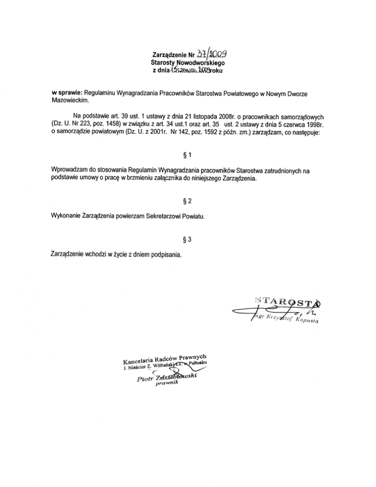 Wprowadzam do stosowania Regulamin Wynagradzania pracowników Starostwa zatrudnionych na