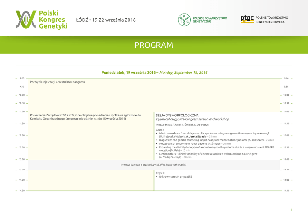 PROGRAM ŁÓDŹ • 19-22 września 2016 POLSKIE TOWARZYSTWO ŁÓDŹ • 19-22 września 2016 GENETYKI CZŁOWIEKA PROGRAM Poniedziałek, 19 września 2016 – Monday, September 19, 2016 9.00 9.00 Początek rejestracji uczestników Kongresu 9.30 9.30 10.00 10.00 10.30 10.30 11.00 11.00 Posiedzenia Zarządów PTGC i PTG; inne oficjalne posiedzenia i spotkania zgłoszone do Komitetu Organizacyjnego Kongresu (nie później niż do 15 września 2016) 11.30 12.00 12.30 13.00 SESJA DYSMORFOLOGICZNA Dysmorphology; Pre-Congress session and workshop Przewodniczą (Chairs): R. Śmigiel, E. Obersztyn Część I: • What can we learn from old dysmorphic syndromes using next-generation sequencing screening? (M. Krajewska-Walasek, A. Jezela-Stanek) – 25 min • Diagnostics and genetic counseling in split-hand/foot malformation syndrome (A. Jamsheer) – 25 min • Mowat-Wilson syndrome in Polish patients (R. Śmigiel) – 20 min • Expanding the clinical phenotype of a novel overgrowth syndrome due to a unique recurrent PDGFRB mutation (M. Pelc) – 20 min • Laminopathies – clinical variability of diseases associated with mutations in LMNA gene (A. Madej‑Pilarczyk) – 20 min 11.30 12.00 12.30 13.00 Przerwa kawowa z przekąskami (Coffee break with snacks) 13.30 13.30 Część II: • Unknown cases (4 przypadki) 14.00 14.00 14.30 14.30 1 PROGRAM ŁÓDŹ • 19-22 września 2016 Poniedziałek, 19 września 2016 – Monday, September 19, 2016 15.00 15.00 15.30 UROCZYTOŚĆ OTWARCIA KONGRESU Opening Ceremony 15.30 Prowadzą: B. Naganowska, A. K. Kononowicz, L. Jakubowski 16.00 Powitanie honorowych gości; Przemówienia; Wręczanie odznaczeń i/lub nagród 16.00 Krótki koncert inaugurujący Kongres 16.30 17.00 Wykłady plenarne Plenary Lectures Przewodniczą (Chairs): Adam Jaworski, Andrzej K. Kononowicz, Malcolm Ferguson-Smith 16.30 17.00 Wykładowcy (Speakers): Sir David Baulcombe: RNA and epigenetics in plants 17.30 Jerzy Paszkowski: Epigenetics contribution to the plant breeding strategies 17.30 Robert D. Wells: DNA Structure Matters (3 x 30 min) 18.00 18.00 20.00 20.00 Koktajl powitalny w Pałacu Poznańskiego Gala Dinner at Poznanski Palace 2 PROGRAM ŁÓDŹ • 19-22 września 2016 Wtorek, 20 września 2016 – Tuesday, September 20, 2016 8.45 8.45 Ogłoszenia organizacyjne Organisational Remarks/Informations (5 min) Wykłady plenarne Plenary Lectures 9.00 9.00 Przewodniczą (Chairs): Jan Lubiński, Grzegorz Węgrzyn Wykładowcy (Speakers): Carole Charlier: High-throughput sequencing to identify disease-causing mutations in livestock 9.30 9.30 Terje Raudsepp: Mammalian sex chromosomes: cytogenetics, sequencing and phenotypes Rodney J. Scott: Panel testing for familial breast cancer: calibrating the tension between research and clinical care Grzegorz Węgrzyn: 100 years of bacteriophage genetics: light and dark sides of the (phage) force 10.00 10.00 Richard G. F. Visser – Possibilities and limitations of breeding in polyploid crops (5 x 20 min) 10.30 10.30 Przerwa kawowa (Coffee break) 11.00 G -1 Choroby Rzadkie i Ultrarzadkie 1 Rare and Ultra-Rare Diseases 1 Sesja pod Patronatem Polskiego Towarzystwa Wrodzonych Wad Metabolizmu (PTWWM) 11.30 12.00 12.30 13.00 Przewodniczą (Chairs): J. Sykut-Cegielska, M. Borowiec • Heterogeneity of molecular background of mitochondrial diseases in children (D. Piekutowska-Abramczuk) – 25 min • The role of genotyping in patients with phenylketonuria (M. Bik-Multanowski) – 25 min • Role of DNA analysis in the newborn screening by tandem mass spectrometry (J. Sykut‑Cegielska) – 25 min • Dysmorphic features and congenital defects in inborn errors of metabolism (R. Śmigiel) – 25 min • High resolution CNV detection using exonfocused aCGH microarray designs (A. Allen) wykład sponsorowany przez firmę OGT – 10 min G -2 Genetyka kliniczna zespołów dziedzicznej predyspozycji do nowotworów Clinical Genetics of susceptibility to the hereditary cancers G -3 Genetyczne Podłoże Chorób Cywilizacyjnych Genetics of the common diseases Przewodniczą (Chairs): J. Lubiński, R. Scott • New genes associated with a high risk of breast cancer (C. Cybulski) – 15 min • A population screening – detection of BRCA1 and other genes founder mutations (J. Gronwald) – 15 min • Hereditary Ovarian Cancer – a multipanel analysis in a group of 200 patients (M. Ratajska) – 15 min • Implementation of NGS for the molecular diagnostics of mutations in BRCA1/2 (A. Kowalik) – 15 min • The impact of oophorectomy on survival after breast cancer in BRCA1-positive breast cancer patients (T. Huzarski) – 15 min • Diagnostyka zespołów predyspozycji do nowotworów układu trawiennego (D. Nowakowska) – 15 min • Effectiveness of detection of mutations within genes predisposing to Lynch Syndrome (T. Dębniak) – 15 min • Omicology – contribution to cardiovascular diseases (Z. Gaciong) – 25 min • Genetic and epigenetic aspects of mental disorders (B. Misiak) – 20 min • Genetic and epigenetic determinants of obesity (T. Ferenc) – 20 min • The Polish National Centre of Diagnostics and Treatment of Familial Hypercholesterolemia – molecular diagnostics of familial hypercholesterolemia in Poland (B. Wasąg) – 25 min • Multi-national network of excellence for research on genetic predisposition to cardio-metabolic disorders due to UCP1 gene polymorphisms (A. Kowalska) – 10 min • Gender-Dependent Genetic Association with Body Mass Index in Poles (M. Sobalska-Kwapis) – 10 min • Expression and immunoexpression of Pentraxin 3 in stable patients with chronic obstructive pulmonary disease (M. Poznański) – 10 min Przewodniczą (Chairs): Z. Gaciong, M. Sanak, T. Ferenc Z -1 Genetyka cech ilościowych u zwierząt Genetics of quantitative traits in animals Przewodniczą (Chairs): W. Jagusiak, T. Strabel • Quantitative genetics in genomic era (T. Strabel) – 25 min • Effect of GHSR and LEPR genes polymorphisms on production re
