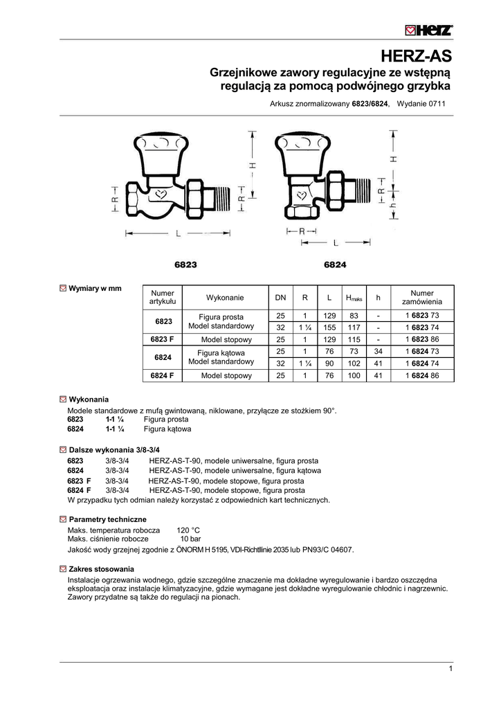 HERZ-AS Grzejnikowe zawory regulacyjne ze wstępną regulacją za pomocą podwójnego grzybka Arkusz znormalizowany 6823/6824, Wydanie 0711 Wymiary w mm Numer artykułu Wykonanie Numer zamówienia DN R L Hmaks h 1 6823 73 6823 Figura prosta Model standardowy 25 1 129 83 32 1¼ 155 117 6823 F Model stopowy 25 1 129 115 - Figura kątowa Model standardowy 25 1 76 73 34 1 6824 73 32 1¼ 90 102 41 1 6824 74 Model stopowy 25 1 76 100 41 1 6824 86 6824 6824 F 1 6823 74 1 6823 86 Wykonania Modele standardowe z mufą gwintowaną, niklowane, przyłącze ze stożkiem 90°. 6823 1-1 ¼ Figura prosta 6824 1-1 ¼ Figura kątowa Dalsze wykonania 3/8-3/4 6823 3/8-3/4 HERZ-AS-T-90, modele uniwersalne, figura prosta 6824 3/8-3/4 HERZ-AS-T-90, modele uniwersalne, figura kątowa 6823 F 3/8-3/4 HERZ-AS-T-90, modele stopowe, figura prosta 6824 F 3/8-3/4 HERZ-AS-T-90, modele stopowe, figura prosta W przypadku tych odmian należy korzystać z odpowiednich kart technicznych. Parametry techniczne Maks. temperatura robocza 120 °C Maks. ciśnienie robocze 10 bar Jakość wody grzejnej zgodnie z ÖNORM H 5195, VDI-Richtllinie 2035 lub PN93/C 04607. Zakres stosowania Instalacje ogrzewania wodnego, gdzie szczególne znaczenie ma dokładne wyregulowanie i bardzo oszczędna eksploatacja oraz instalacje klimatyzacyjne, gdzie wymagane jest dokładne wyregulowanie chłodnic i nagrzewnic. Zawory przydatne są także do regulacji na pionach. 1 Przyłącze grzejnikowe W zaworach zamontowane jest przyłącze do rur stalowych 6210 z uszczelnieniem stożkowym. Regulacja wstępna Wstępna regulacja odbywa się za pomocą wysuwanego grzybka dławiącego i pozwala na zdławienie przepływu do ok. 1% przy czym zawsze jest do dyspozycji pełny skok głównego trzpienia. Do dokonania wstępnej regulacji niezbędny jest klucz nastawczy nr 6600 (niebieski trzonek). Wewnętrzny grzybek dławiący jest przestawiany za pomocą trzpienia wstępnej regulacji. Jest on przyłączony do trzpienia przegubowo, aby uniknąć niepożądanej zmiany przepływu wskutek oddziaływania ciał obcych. Proces wstępnej regulacji 1. Zdjąć pokrętło. 2. Trzonek klucza nastawczego wprowadzić do głównego trzpienia regulacyjnego i tulejkę pomiarową docisnąć do jego powierzchni czołowej. 3. Skala znajdująca się na trzonku klucza umożliwia przeprowadzenie wstępnej regulacji: 3.1. Poprzez przekręcenie główki klucza zgodnie z ruchem wskazówek zegara zmniejszany jest przepływ do minimum na skutek wkręcenia wewnętrznego trzpienia z grzybkiem wstępnej regulacji. 3.2. Poprzez przekręcenie główki klucza w lewo, natężenie przepływu zostaje zwiększone z minimum do maksimum. 4. Po dokonaniu regulacji ponownie zamontować pokrętło. Uszczelnienie trzpienia HERZ-AS-1 Wymiana O-ringu W modelach HERZ-AS-1 za uszczelnienie trzpienia służy wymienialny w trakcie eksploatacji O-ring, który nie wymaga konserwacji. 1. Otworzyć zawór poprzez przekręcenie go w lewo aż do wyczucia oporu. Zdjąć pokrętło. 2. Odkręcić nakrętkę O-ringu i wyjąć O-ring z uszczelnieniem klingieritowym (wkładkę zaworu przytrzymać) 3. Oczyścić trzpień i wkrętkę O-ringu (użyć frezu czyszczącego z pojemnika na O-ringi). Przedmioty o ostrych brzegach powodują uszkodzenie powierzchni uszczelniającej! 4. Naoliwiony, przygotowany do montażu O-ring wyjąć z uszczelką klingieritową z pojemnika na O-ringi. 5. Elementy uszczelniające nakładać w następującej kolejności: - uszczelka klingieritowa - O-ring - wkrętka O-ringu 6. Zamontować pokrętło. Numer zamówienia pojemnika z O-ringami – 6710 (czerwony). Trzpienie zaworów 1 ¼ zamiast O-ringiem uszczelniane są za pomocą dławicy. Modele stopowe i dla budownictwa publicznego W modelach stopowych wkrętka O-ringu i tulejka zakrywająca trzpień stanowią jedną całość. Otwarcie trzpienia jest zabezpieczone śrubą radełkową. Regulacja zaworu odbywa się za pomocą klucza 6610 nasadzonego na trzpień. Osprzęt 1 6600 00 Klucz do regulacji wstępnej Części zamienne 1 6310 93 1 6510 03 1 6710 00 Wkadka do HERZ-AS-1 Pokręto wraz z płytką i śrubą mocującą Pojemnik z O-ringami Nomogramy przepływu na odwrocie Nomogramy na odwrocie służą do określenia wielkości oporu na zaworze i do odczytania poszczególnych stopni regulacji wstępnej . 2 DN 25 R=1 Wartość kv Art. nr 6823 • 6824 HERZ-AS Przepływ qm HERZ – Nomogram znormalizowany Wartość kv Przepływ qm Spadek ciśnienia ∆p Spadek ciśnienia ∆p 3 HERZ – Nomogram znormalizowany HERZ-AS Art. nr 6823 • 6824 DN 32 Wartość kv Przepływ qm R=1¼ Wartość kv Przepływ qm Spadek ciśnienia ∆p Spadek ciśnienia ∆p 4