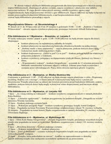 W okresie wakacji szkolnych Biblioteka przygotowała dla dzieci pozostających w mieście szereg imprez bibliotecznych, obejmujących głośne czytanie, zajęcia czytelnicze i plastyczne oraz zabawy muzyczno-ruchowe. W ciągu dwóch wakacyjnych miesięcy młodzi czytelnicy oprócz zajęć zorganizowanych, będą mogli korzystać również z gier stolikowych. Zajęcia odbywać się będą wyłącznie na terenie poszczególnych placówek bibliotecznych, a nad bezpieczeństwem dzieci czuwać będą bibliotekarze prowadzący zajęcia. Wypożyczalnia Główna – ul. Strumieńskiego 4 W dniach od 21 do 30 lipca oraz od 18 do 29 sierpnia w godzinach 10.00 – 12.00 – „Podróże z Tomkiem Wilmowskim” – otwarte zajęcia czytelniczo-plastyczne, promujące twórczość Alfreda Szklarskiego. Filia biblioteczna nr 1 Mysłowice – Brzezinka, ul. Laryska 5 W każdy wakacyjny wtorek i piątek w godz. 12.00 -14.00 odbywać się będą otwarte zajęcia dla dzieci, obejmujące: konkurs plastyczny na najładniejszą zakładkę do książki, konkurs plastyczny na najciekawszą historyjkę obrazkową (komiks na jedną stronę), „Robimy maski z masy papierowej” – zajęcia plastyczne, podczas których dzieci będą wykonywać maski ulubionej postaci z bajki, konkurs krajoznawczy: „Gdzie to jest? Co to jest?” - konkurs polegał będzie na właściwym połączeniu podpisów z widokami, konkurs czytelniczy, polegający na dopasowaniu tytułu do obrazu, ilustracji czy fotosu z filmu, „Wspomnienia z wakacji” - konkurs fotograficzny – uczestnik do 12 września przynosi do biblioteki samodzielnie wykonane zdjęcie z wakacji. Zebrane prace będą wystawiane i oceniane przez odwiedzających. Praca, która otrzyma najwięcej głosów wygrywa. Filia biblioteczna nr 2 – Mysłowice, ul. Wielka Skotnica 84a Codziennie w godzinach 11.00 – 13.00 odbywać się będą otwarte zajęcia plastyczne z cyklu „Wspieramy recykling. Robimy coś z niczego”, w czasie których wykorzystywane będą rzeczy z pozoru już bezużyteczne. Ponadto planowane są zabawy na świeżym powietrzu przed budynkiem biblioteki, a także spotkania, podczas których dzieci będą mogły wykonywać różne eksperymenty pod bacznym okiem bibliotekarzy. Filia biblioteczna nr 3 – Mysłowice, ul. Laryska 102 7 lipca – „Ja z moją rodziną na wakacjach” – konkurs rysunkowy zorganizowanych w ramach obchodów Roku Rodziny. 11 lipca – „Literackie zgadywanki” – konkurs przygotowany na podstawie książki „Ortografia na wesoło” autorstwa Witolda Gawdzika. 18 lipca – Konkurs pięknego czytania bajek. 21 lipca – „Wakacyjne przygody Pippi” - konkurs rysunkowy promujący książki Astrid Lindgren. 25 lipca – Pogadanka na temat Powstania Warszawskiego zorganizowana z okazji 70. rocznicy wybuchu. 26 sierpnia – Pogadanka na temat historii Śląska zorganizowana w ramach obchodów 95. rocznicy wybuchu I Powstania Śląskiego. Filia biblioteczna nr 4 – Mysłowice, ul. Wybickiego 80 1 lipca - "Złota Kula Hanny Ożogowskiej" - czytanie fragmentów książki, prezentacja wszystkich książek pisarki oraz pogadanka na temat jej twórczości. Spotkanie zorganizowano z okazji 110. rocznicy urodzin pisarki. 8 lipca – „Brzechwa dzieciom” - konkurs pięknego czytania. 15 lipca – „Wakacje moich marzeń” - konkurs plastyczny. 22 lipca – „Emil ze Smalandii" - czytanie wybranych fragmentów książki oraz pogadanka na temat twórczości Astrid. Lindgren. 29 lipca – „Książka, którą pokochałem na zawsze” - konkurs na zaprezentowanie w dowolny sposób ulubionej książki oraz zachęcenie uczestników spotkania do jej przeczytania. Filia biblioteczna nr 5 – Mysłowice, ul. Gen. Ziętka 25 „Podróże po Polsce z Koziołkiem Matołkiem” - cykliczne zajęcia literacko – plastyczne, w tym quizy, poznawanie zabytków Polski, tworzenie mapy przestrzennej Polski, zabawy z mapą: 7 lipca - czytanie ,,120 przygód Koziołka Matołka” K. Makuszyńskiego, tworzenie ilustracji do wybranych fragmentów oraz konkurs czytelniczy z wiedzy o Koziołku Matołku, 8 lipca – „Wędrówki Koziołka Matołka” – konkurs plastyczny - wykonanie mapy przestrzennej Polski, 9 lipca - Poznawanie miast Polski, zabytków, legend, połączone z konkursami, 10 lipca - Quiz geograficzny połączony z zabawą przy mapie, 11 lipca – Konkurs plastyczny „Herby polskich miast”. Ponadto w dniach od 14 do 18 lipca odbędą się otwarte zajęcia i konkursy plastyczne, między innymi orgiami, kirigami, wyklejanki itp. Filia biblioteczna nr 7 – Mysłowice, ul. Oświęcimska 8 W dniach od 1 do 17 lipca o godz. 12.00 - „W podróż z Koziołkiem Matołkiem” – cykl zajęć literackoplastycznych związanych z tematem podróżowania i atrakcyjnymi turystycznie miejscami. W programie spotkania z książką, interpretacje plastyczne utworów literackich, konkursy, gry i zabawy: „Koziołku co masz w swym tobołku?” – konkurs plastyczny, „Spotkanie z Bajką-Grajką” - Przygody Koziołka Matołka, „Chińskie ABC” – poznajemy kulturę i zwyczaje Państwa Środka, „Od Bałtyku do Tatr” – quiz z wiedzy o Polsce, „Afrykańska sawanna” – tworzymy zwierzęta techniką figur geometrycznych – zajęcia plastyczne połączone z konkursem, „Maska Apacza” – ozdabiamy indiańskie przykrycia twarzy - zajęcia plastyczne oraz konkurs, „Mapa podróży” – podsumowanie przygód Koziołka Matołka w formie przestrzennej makiety. Filia biblioteczna nr 9 – Mysłowice, ul. Kubicy 5 „Podróż do kraju Konfucjusza – poznajemy Chiny” – cykl zajęć czytelniczo-plastycznych, organizowanych w każdy wtorek, środę i czwartek począwszy od 15 lipca do 14 sierpnia w godzinach od 15.00 – 18.00, obejmujących: ekspozycję literatury prezentującej Chiny, zajęcia edukacyjne - poznawanie kultury Chińczyków, architektury tego kraju, filozofii i nauki, czytanie legend chińskich, zajęcia plastyczn